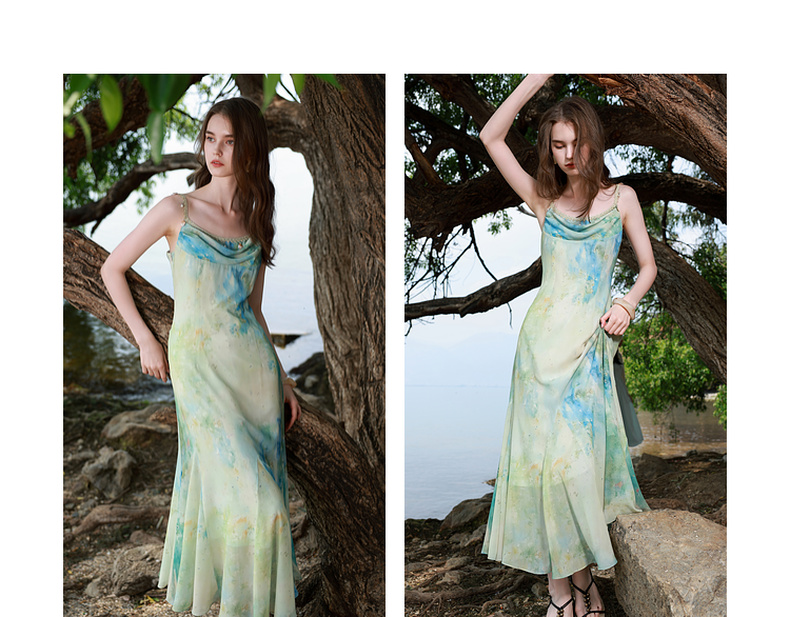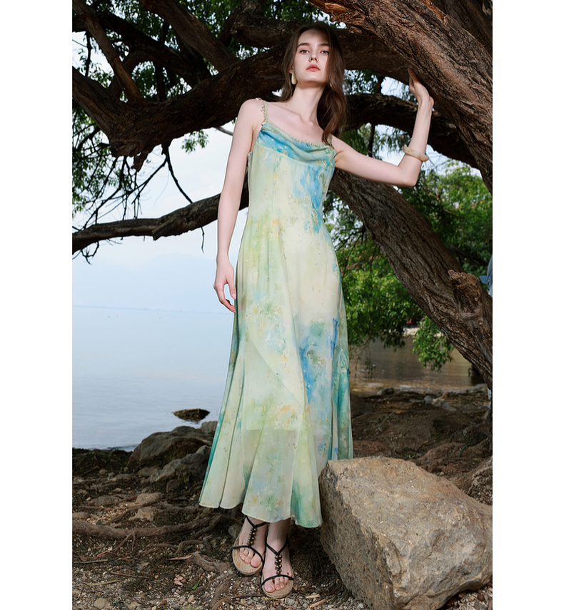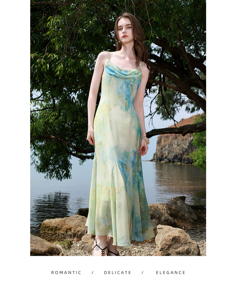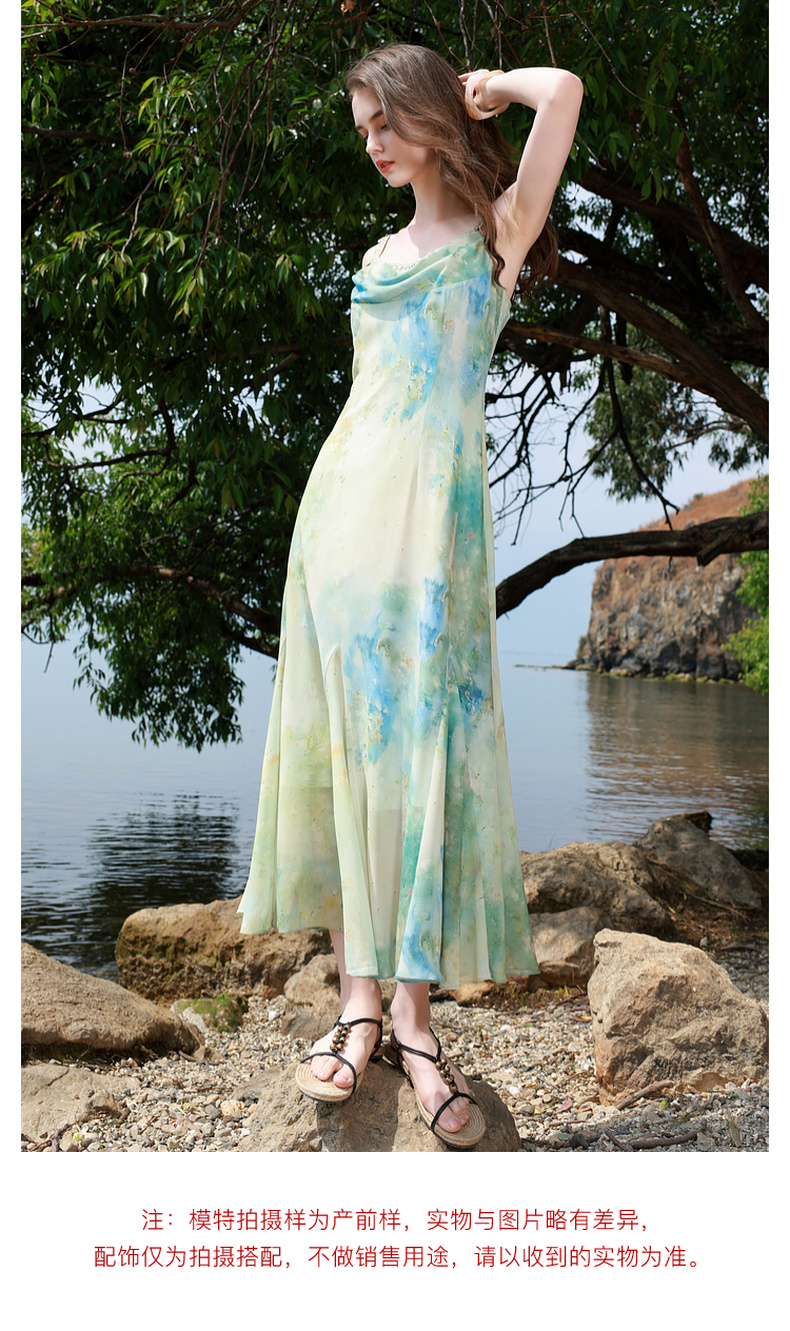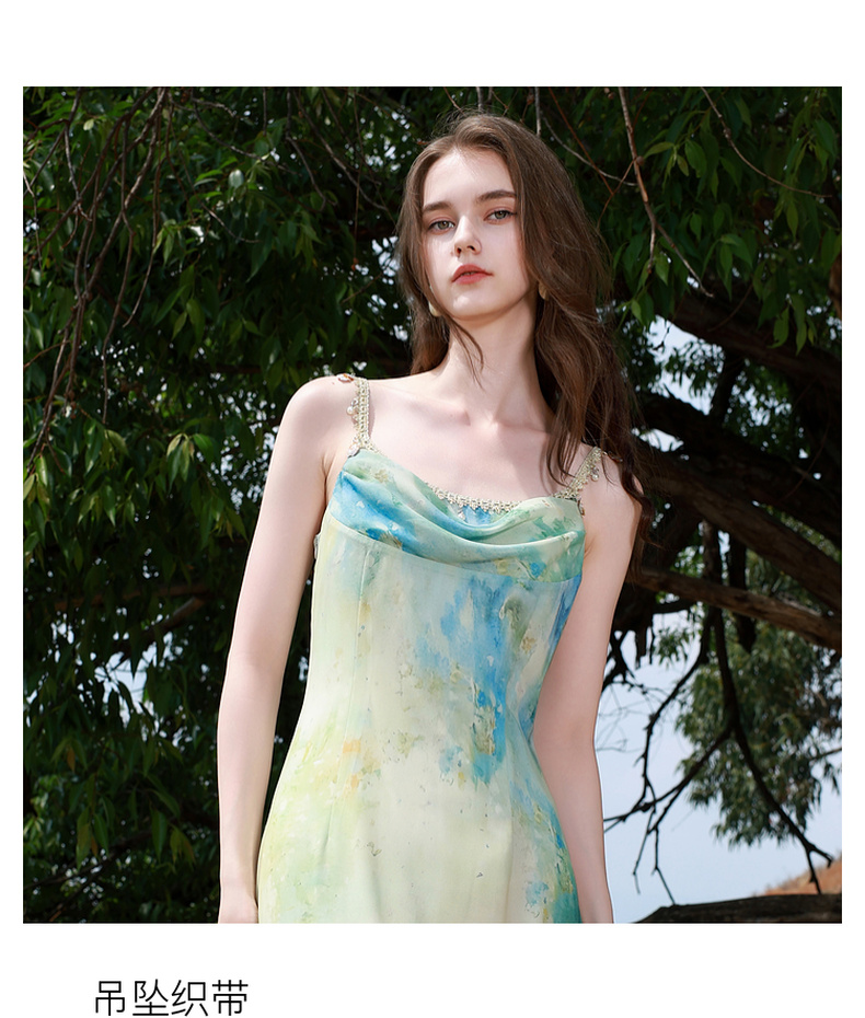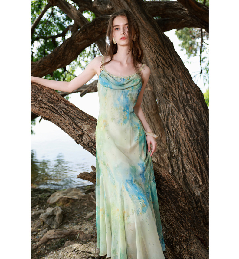 三彩2025夏季新款优雅吊带裙梦幻印花鱼尾裙收腰长裙度假M