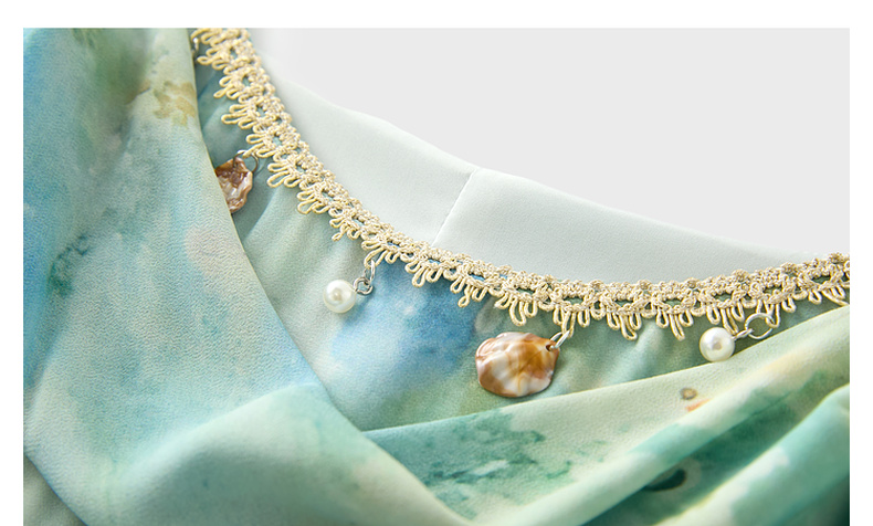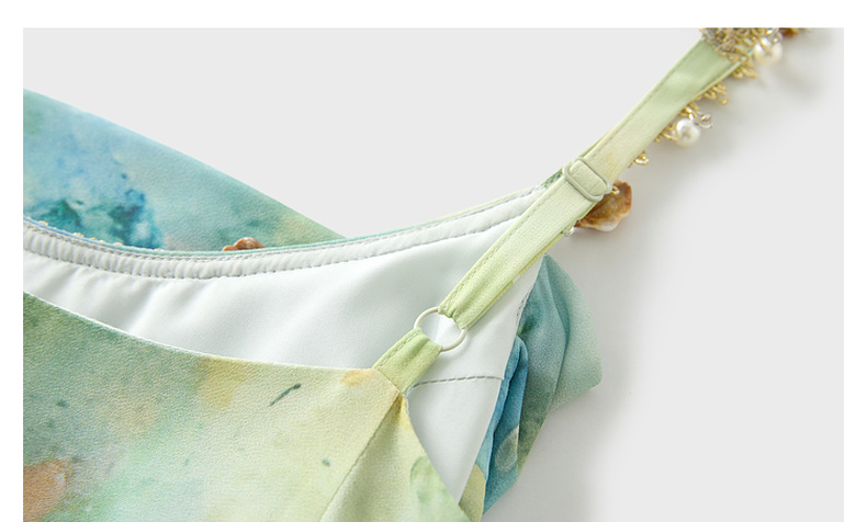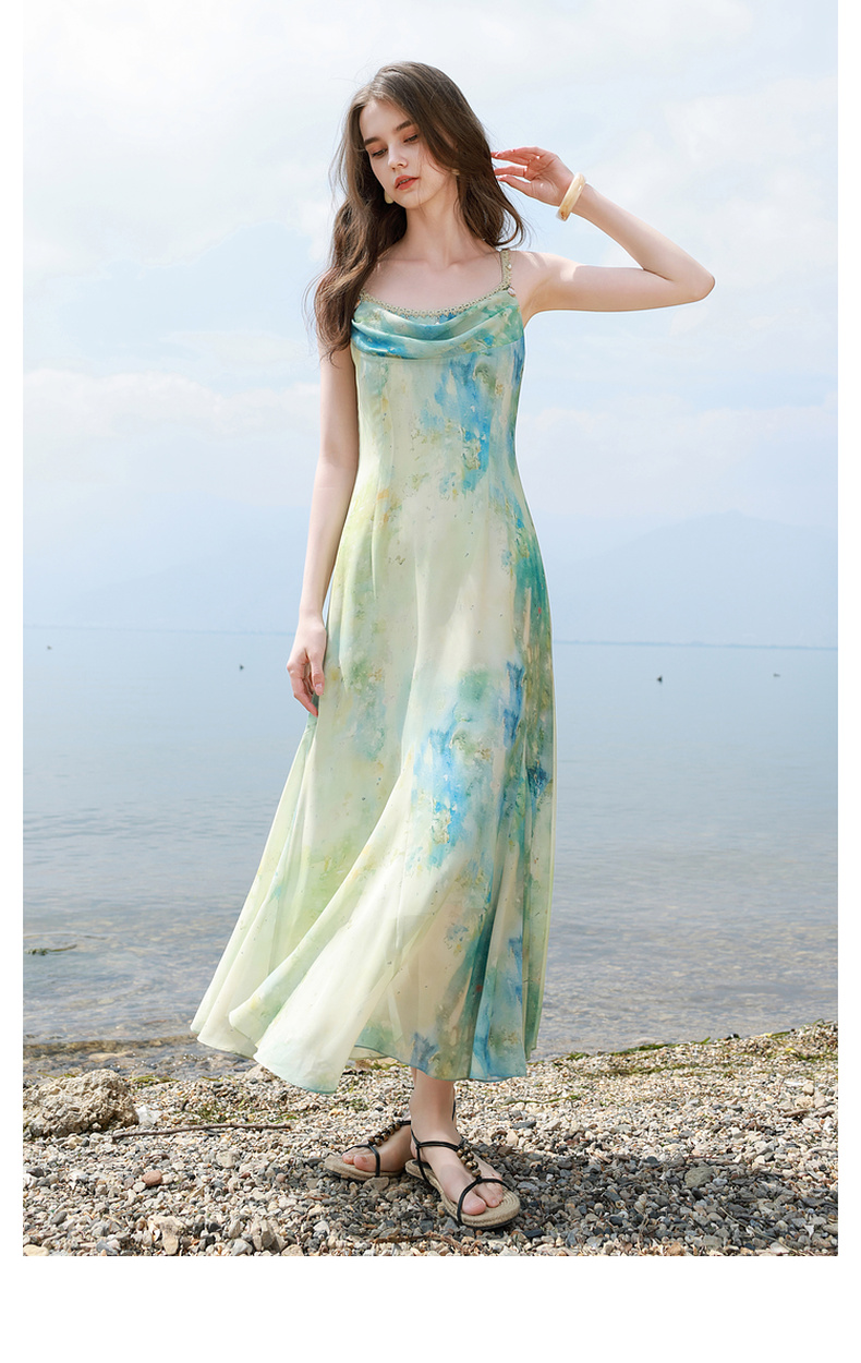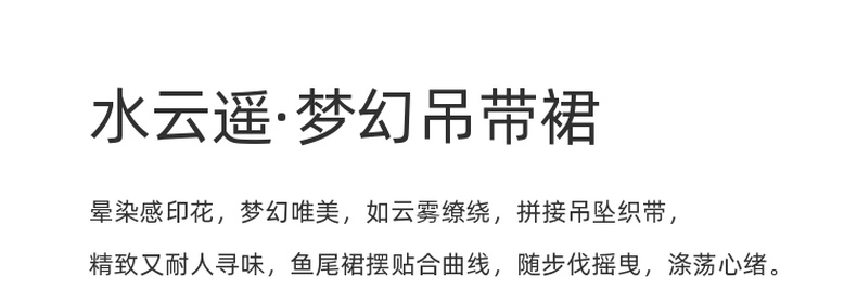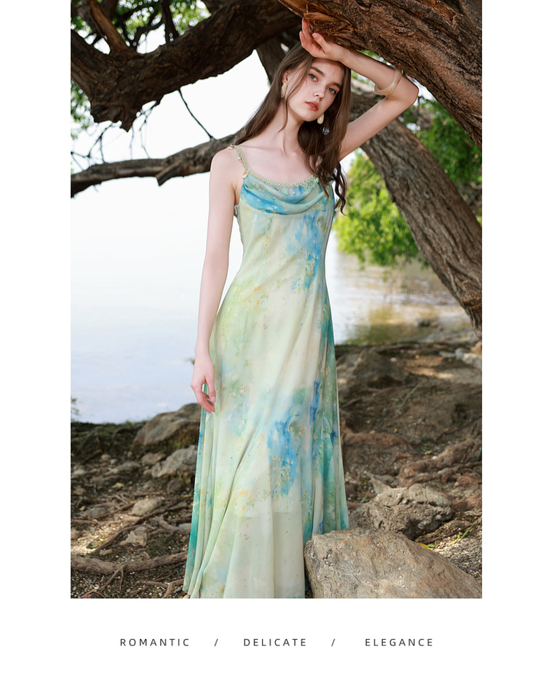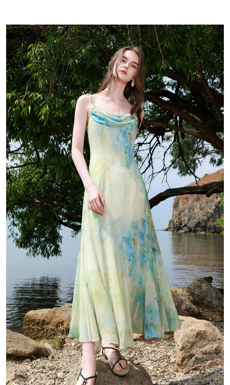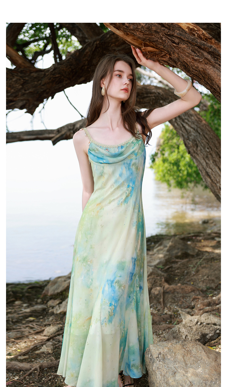三彩2025夏季新款优雅吊带裙梦幻印花鱼尾裙收腰长裙度假M