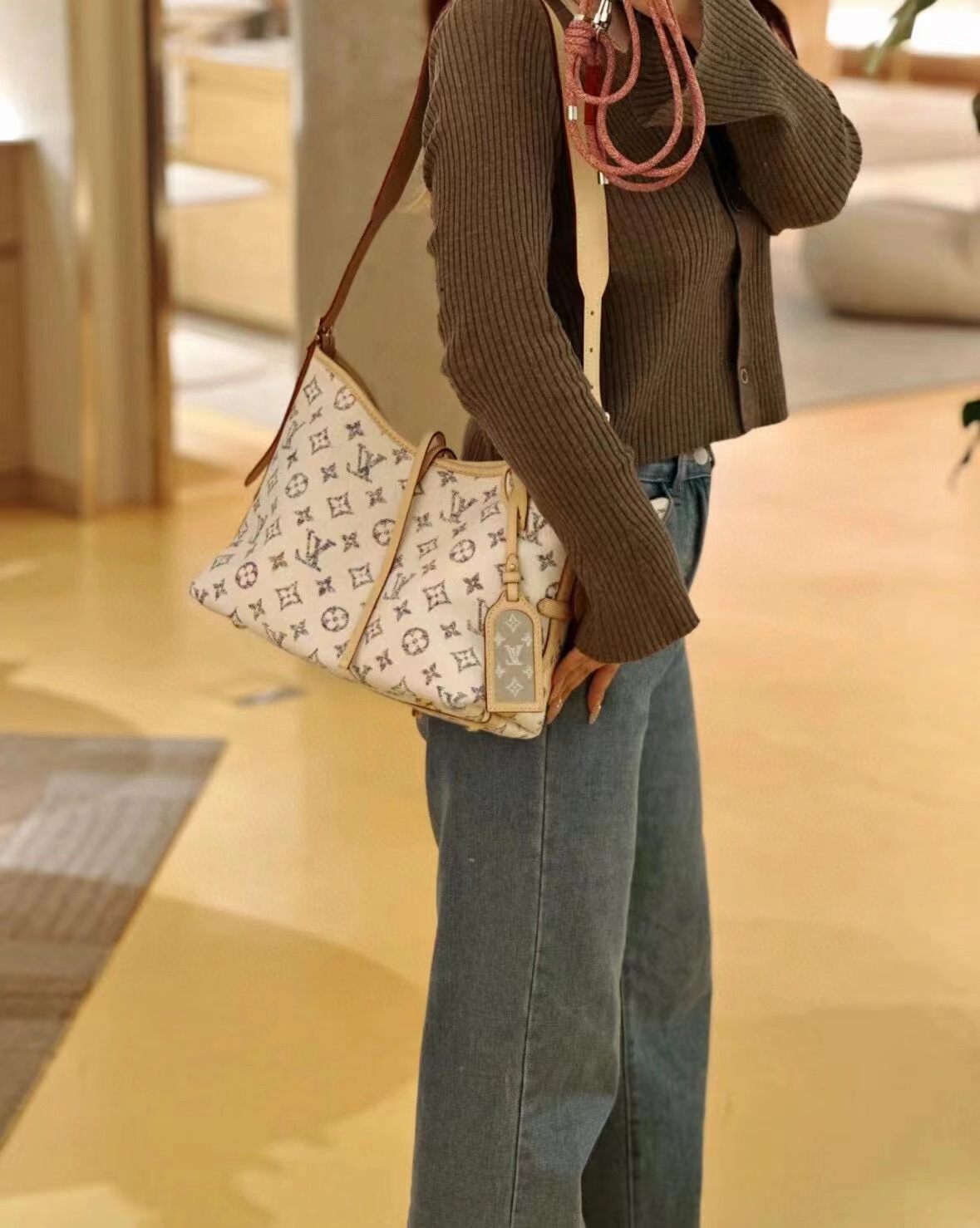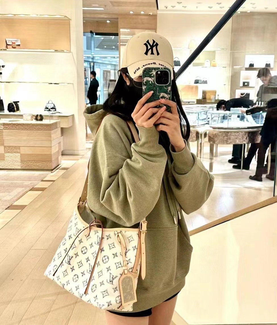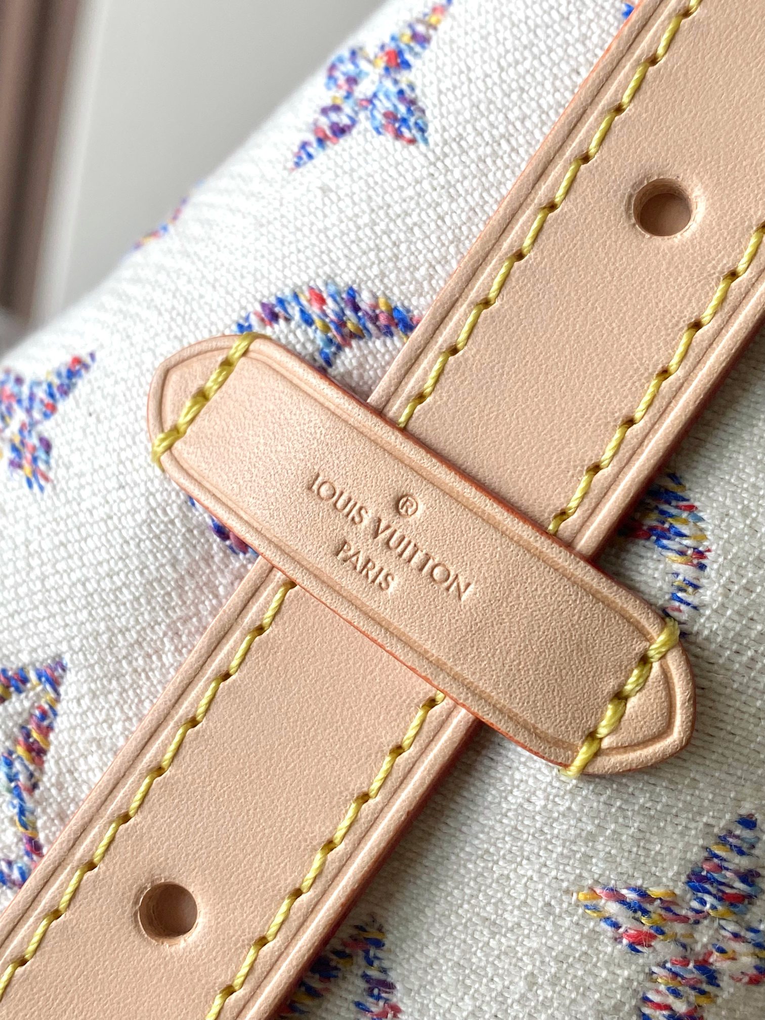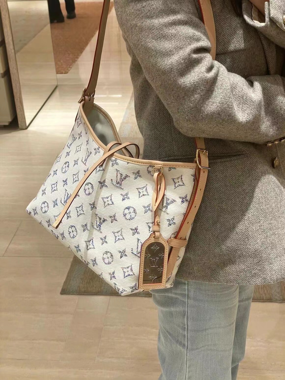 本款 CarryAll 小号手袋出自 Nautical 系列,Monogram 提花织物搭配牛皮革饰边