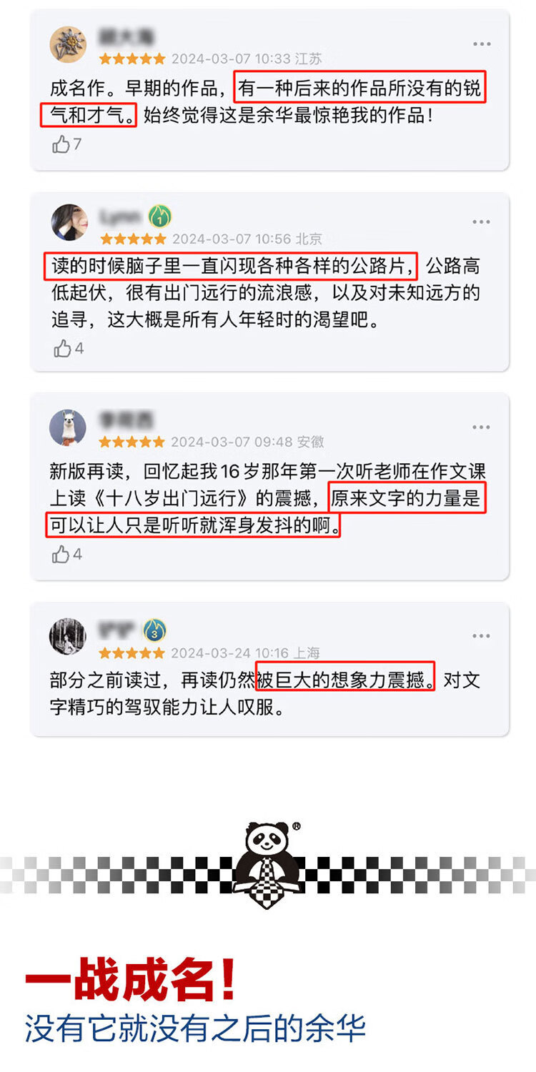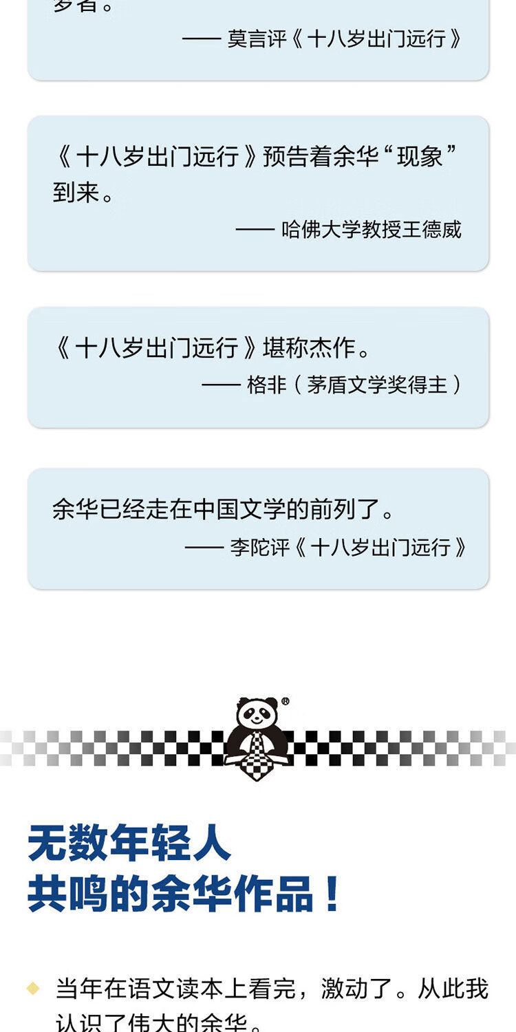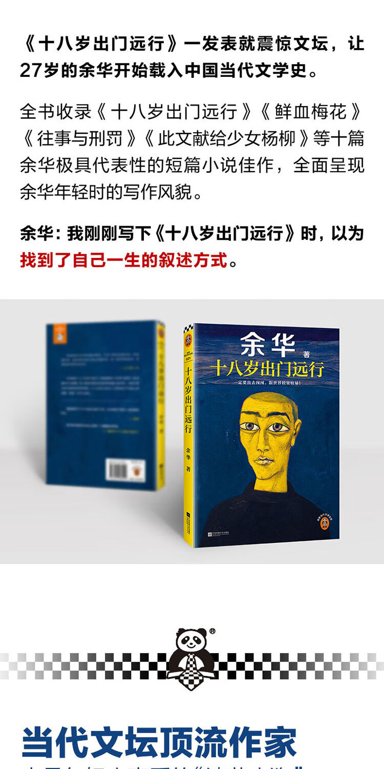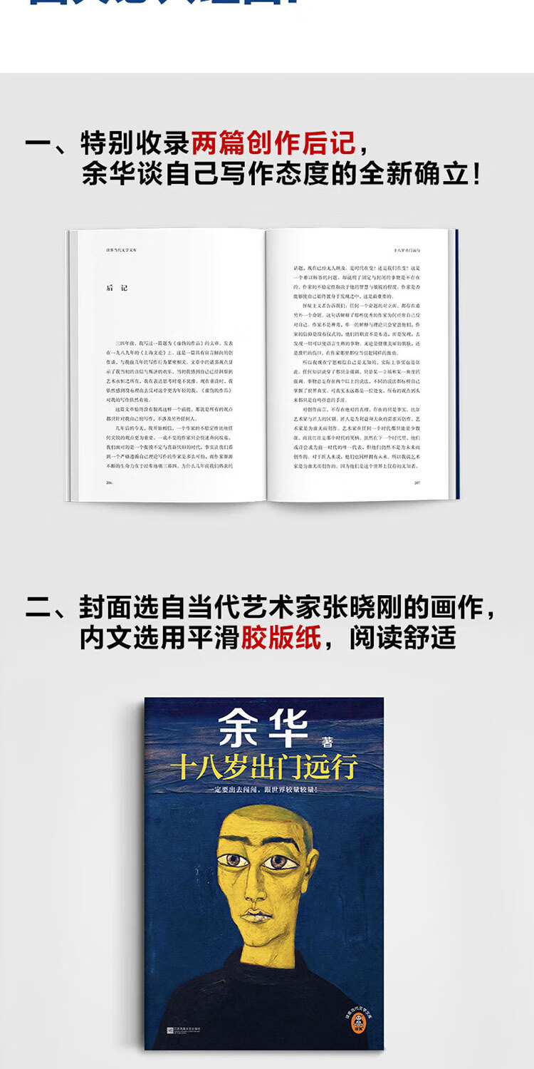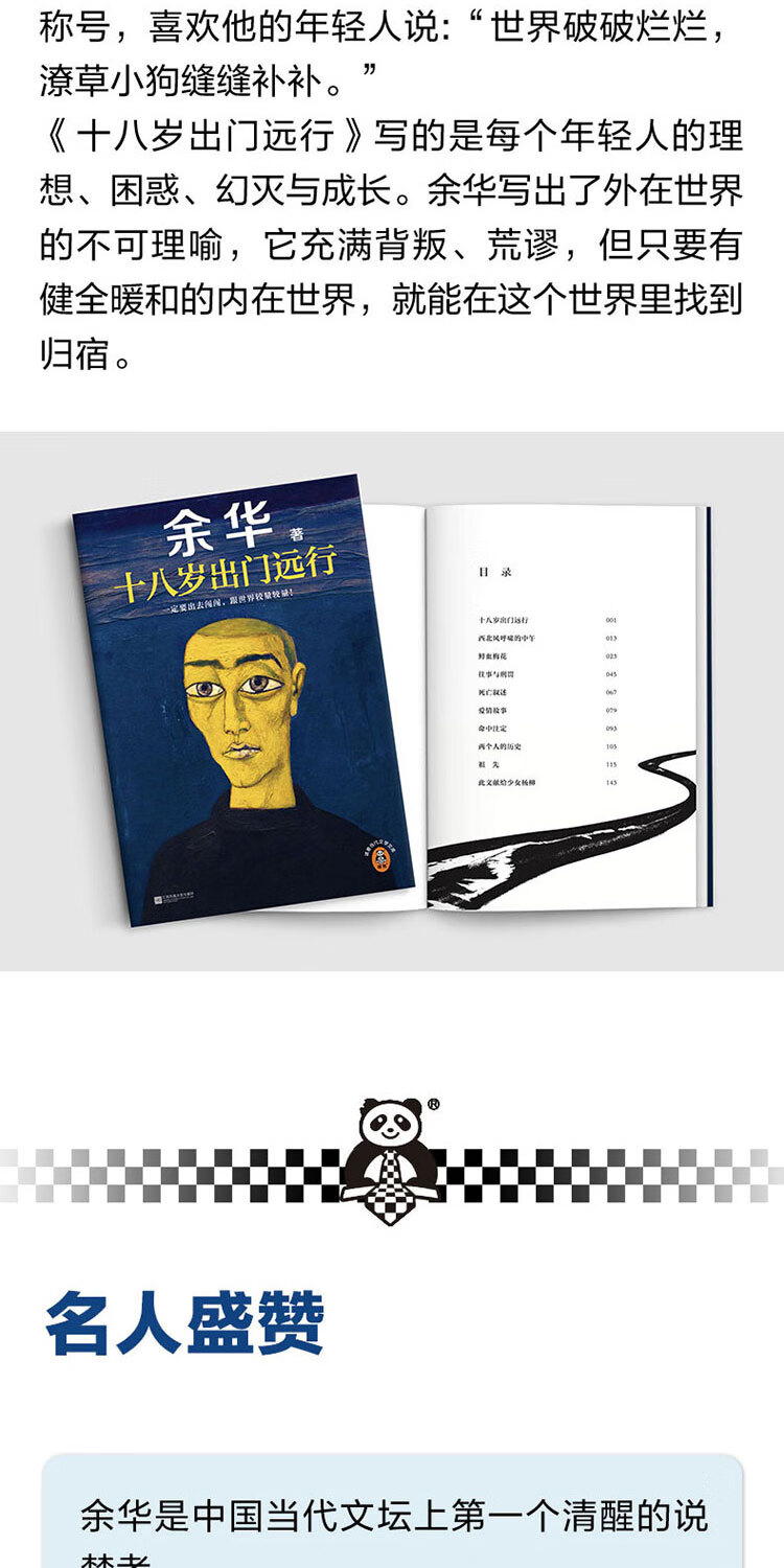 《十八岁出门远行》是余华的成名作,这篇小说被认为是余华整个创作生涯的原点。小说以一个精巧的寓言呈现了年轻人初入社会的普遍状态。余华写出了外在世界的不可理喻,它充满背叛、荒谬和残酷,但只要有健全暖和的内在世界,就能在这个世界里找到归宿,给年轻人以积极的力量。