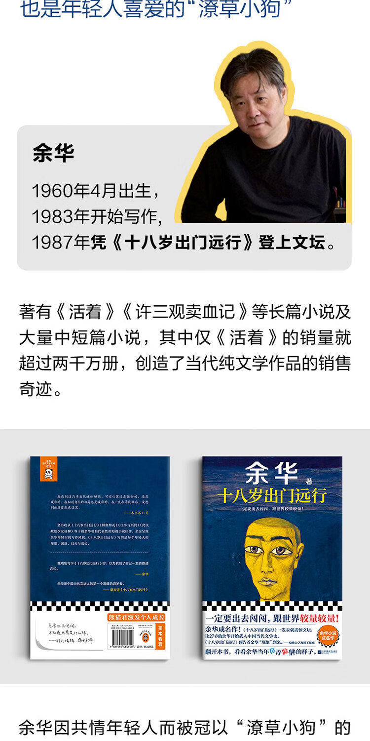 1960年4月出生,1983年开始写作,1987年凭《十八岁出门远行》登上文坛。著有《活着》《许三观卖血记》等长篇小说及大量中短篇小说,其中仅《活着》的销量就超过两干万册,创造了当代纯文学作品的销售奇迹。