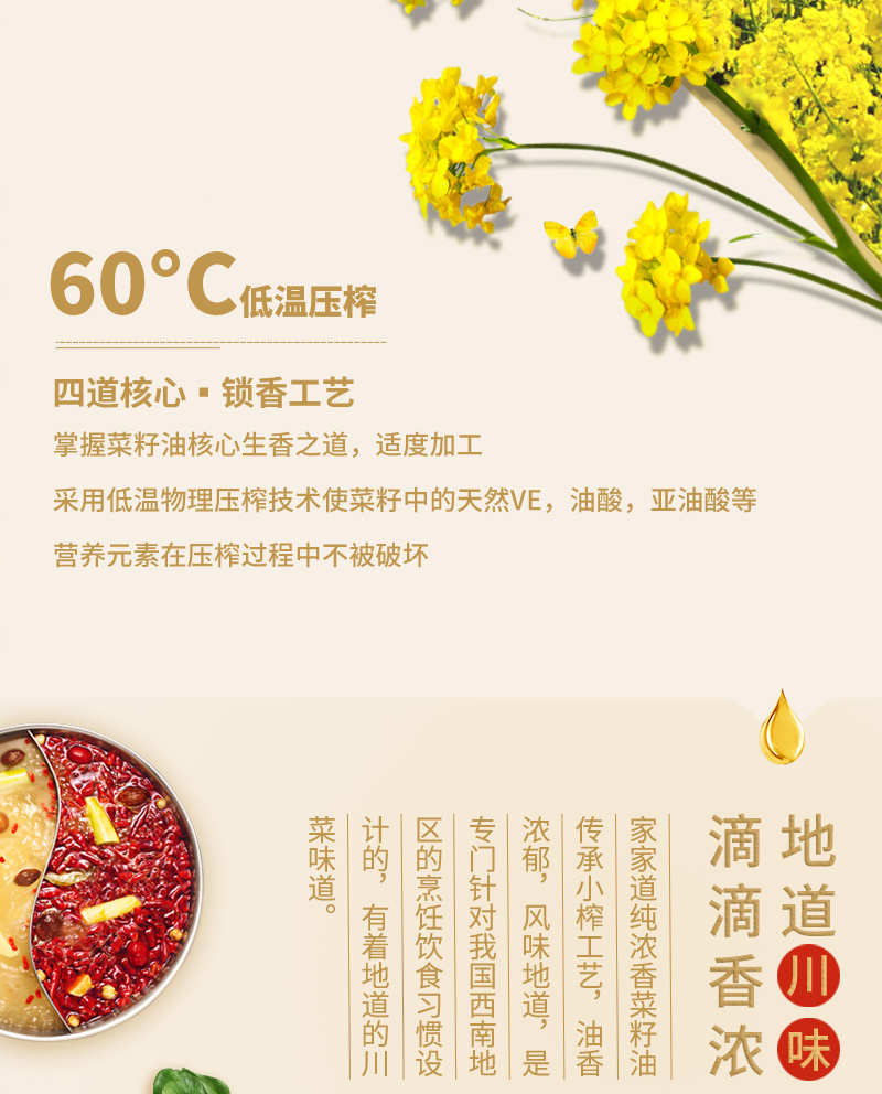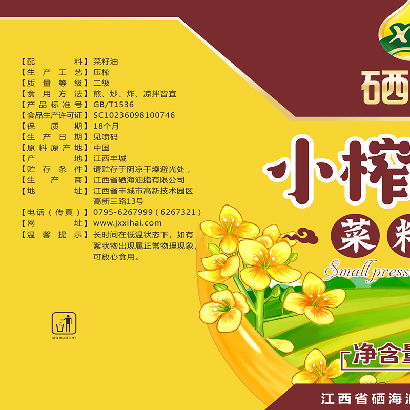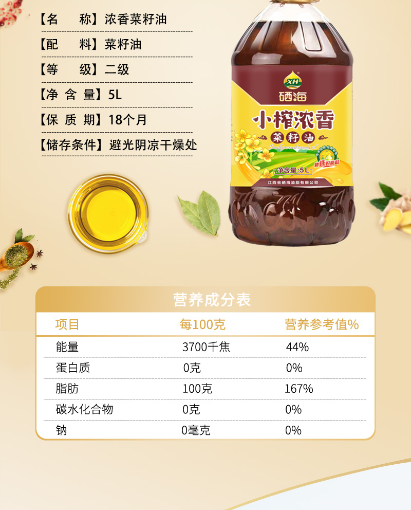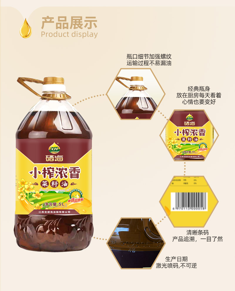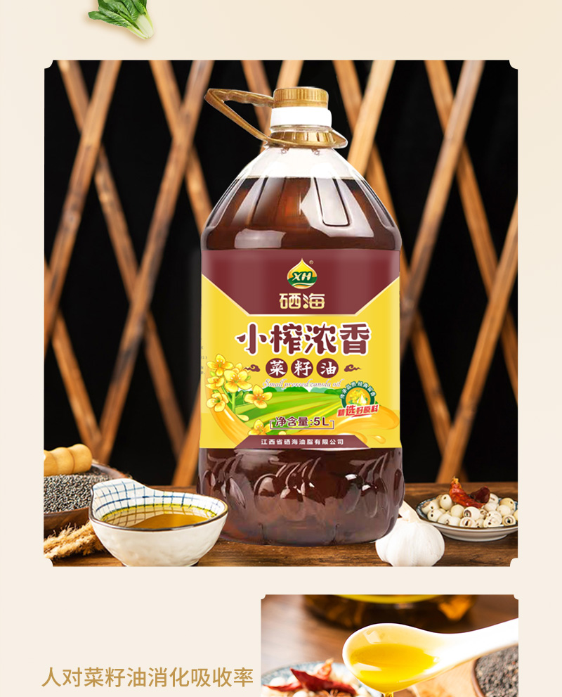 【品名】硒海小榨浓香菜籽油60度低温压榨风味十足5Lx1瓶