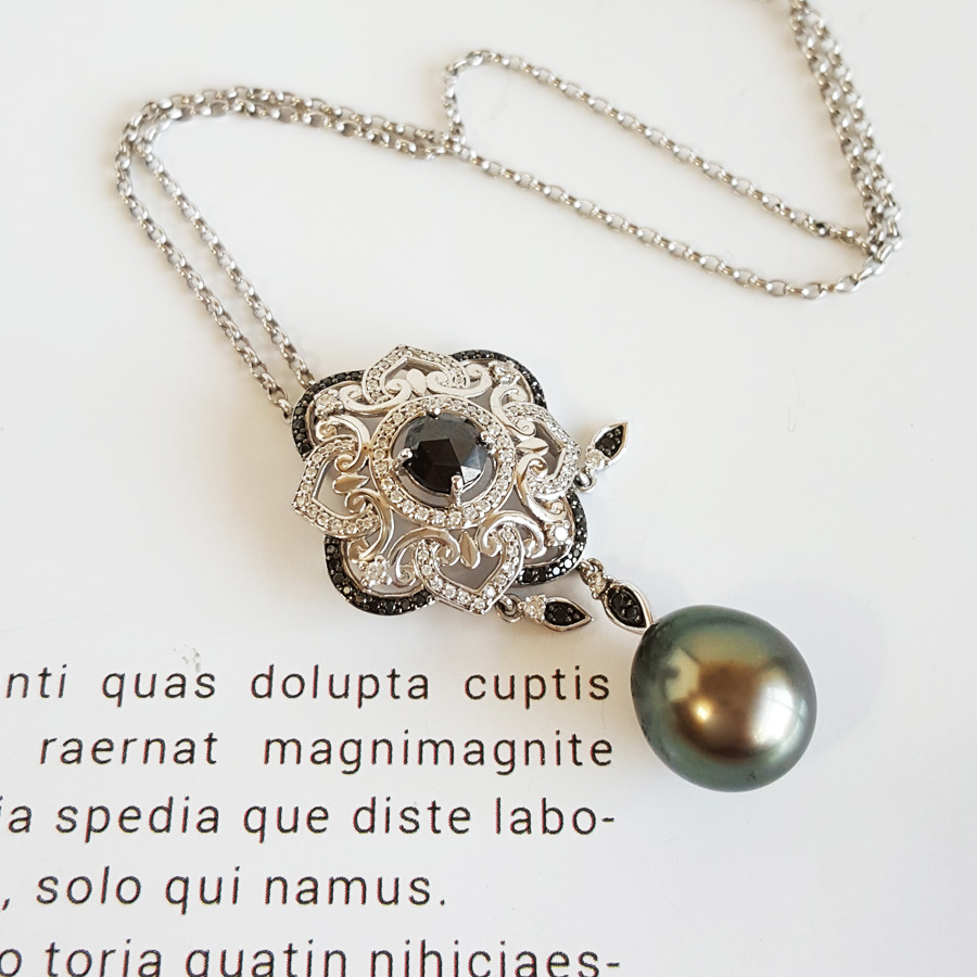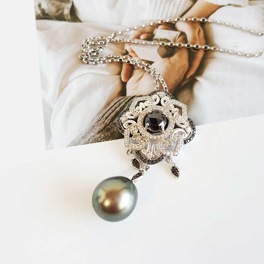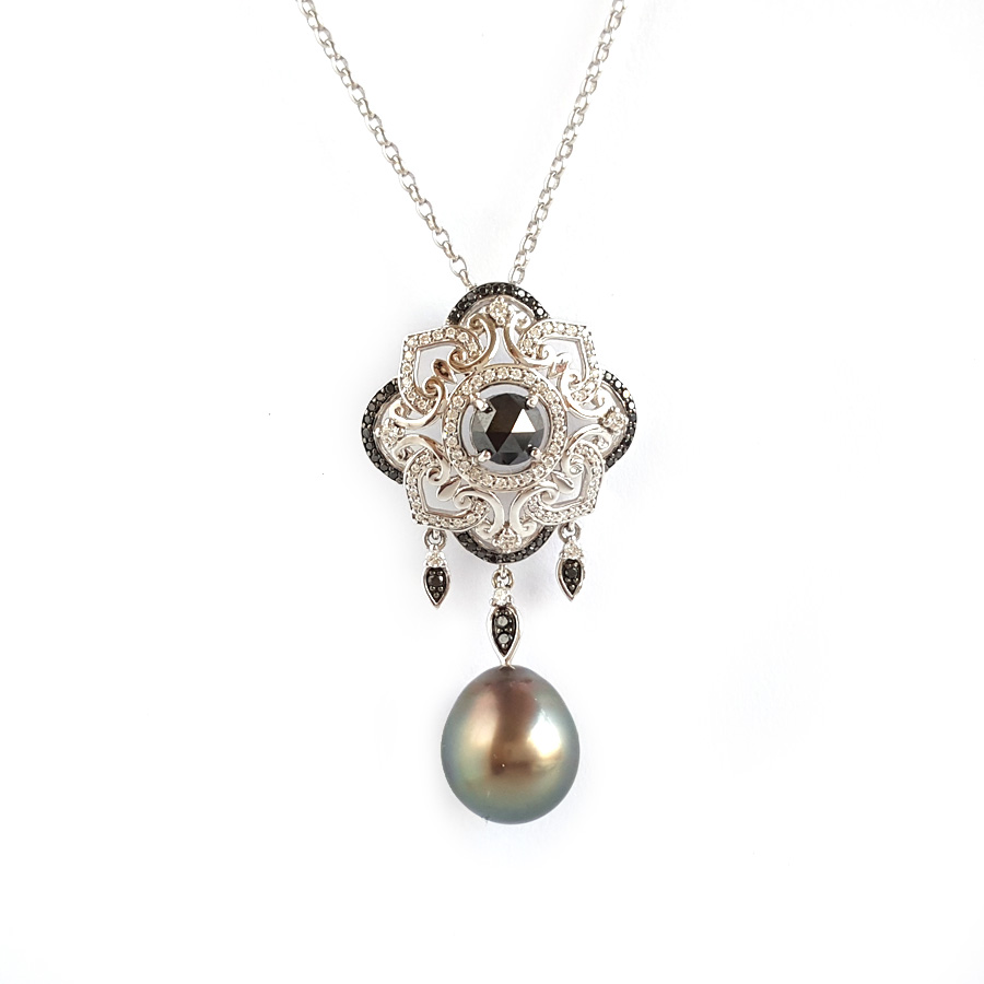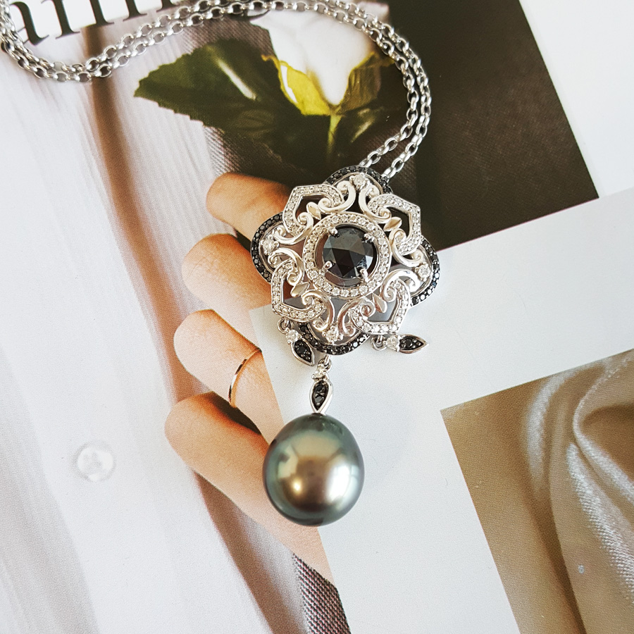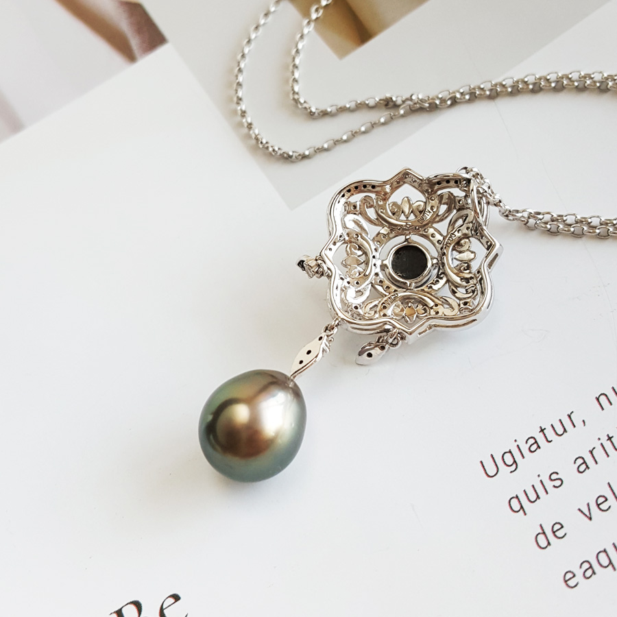 名称 | AU750白金豪镶钻镶天然近完美约12.8*11.2MM水滴形孔雀绿大溪地海水珍珠吊坠项链 |