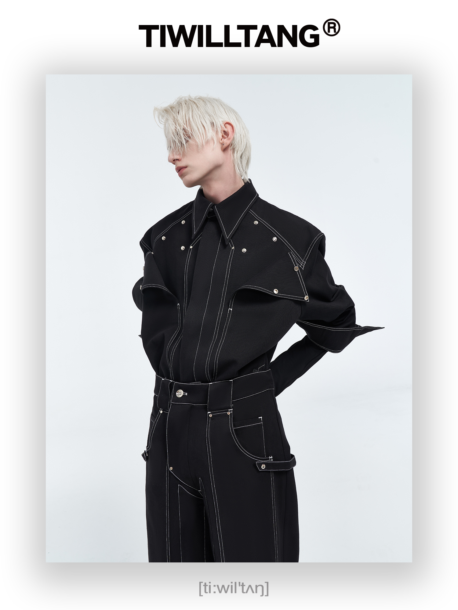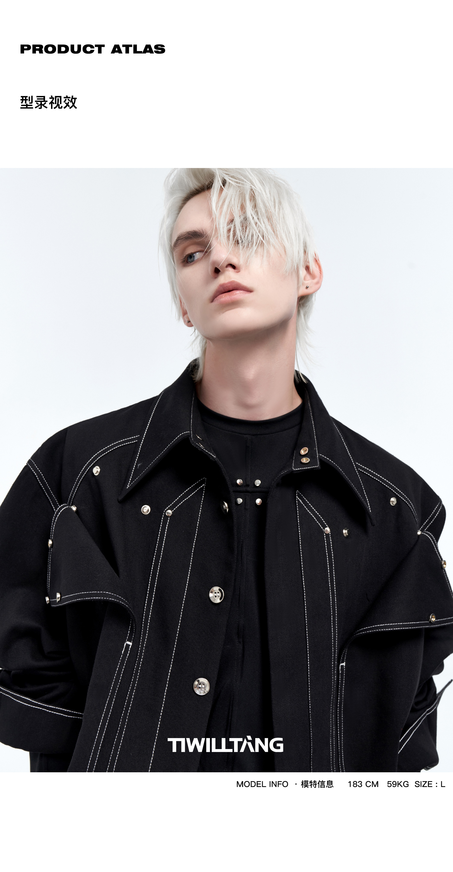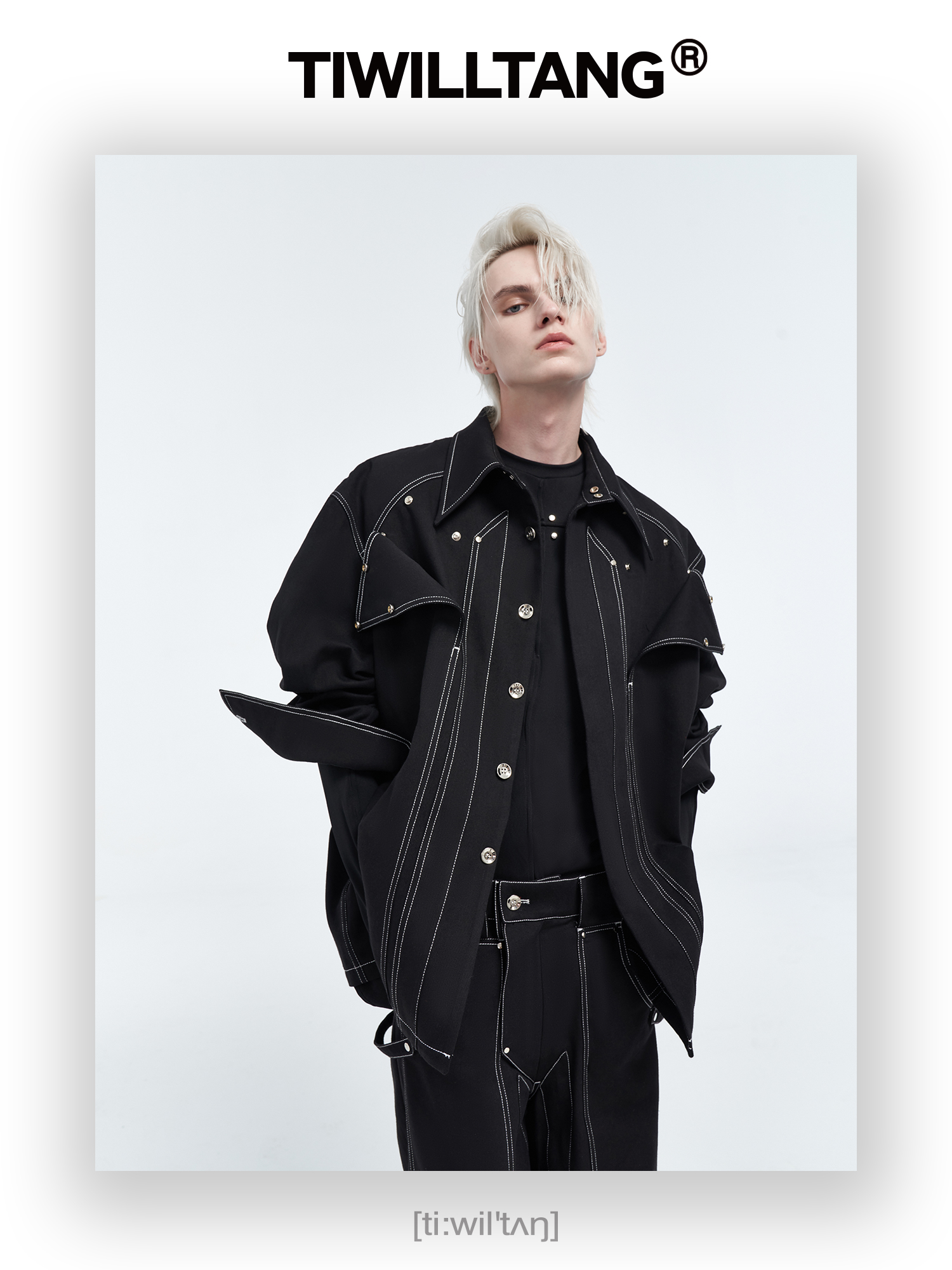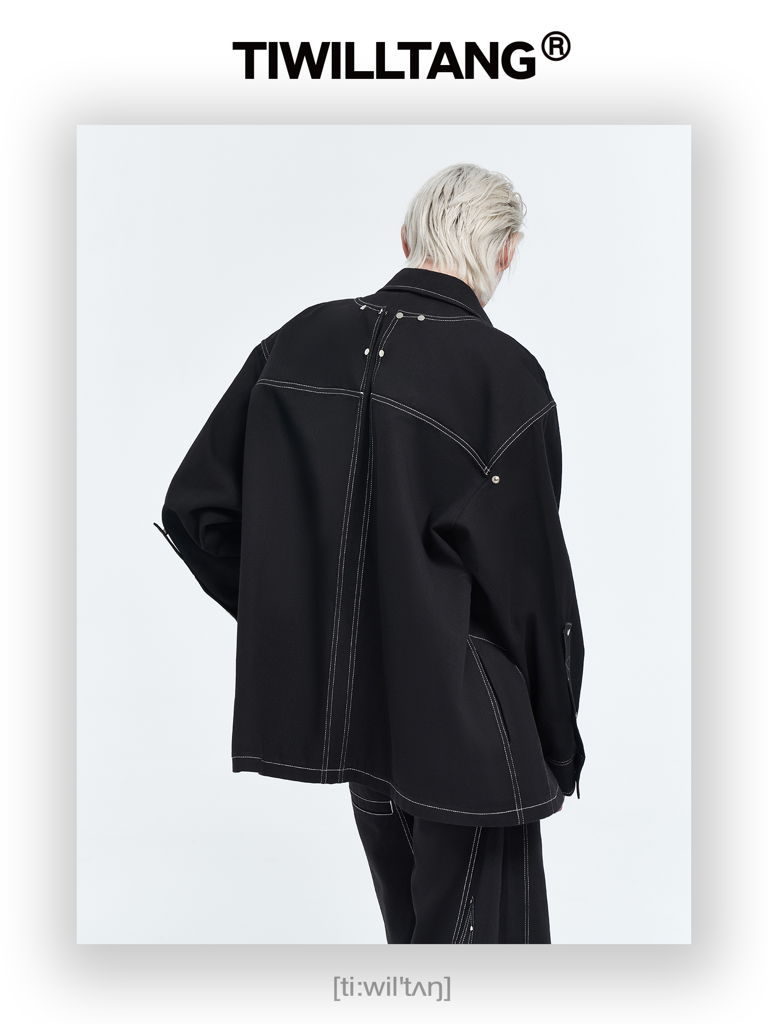 TIWILLTANG启世录“纤裕制焕”黑色异形可拆卸铆钉工装夹克套装