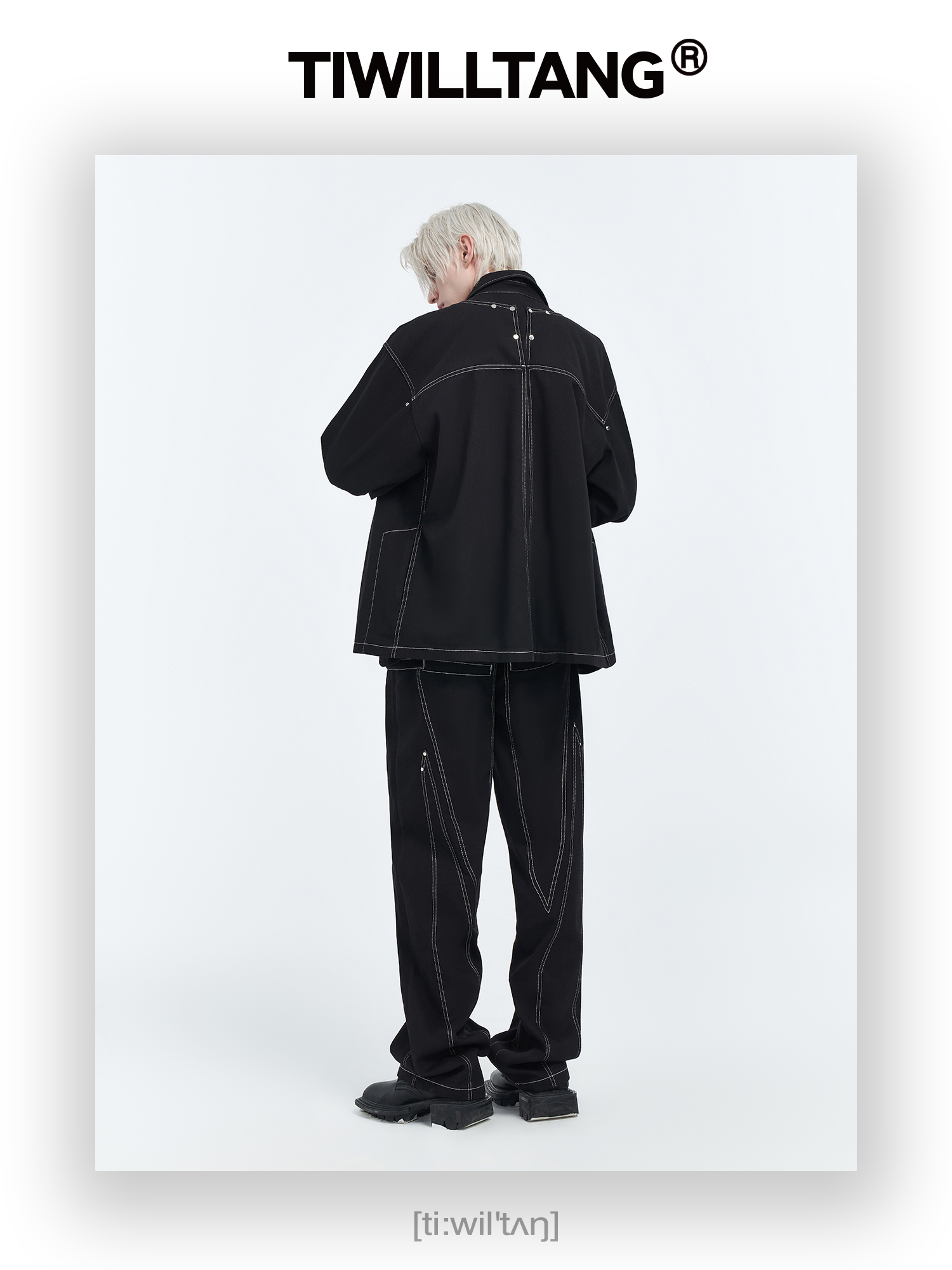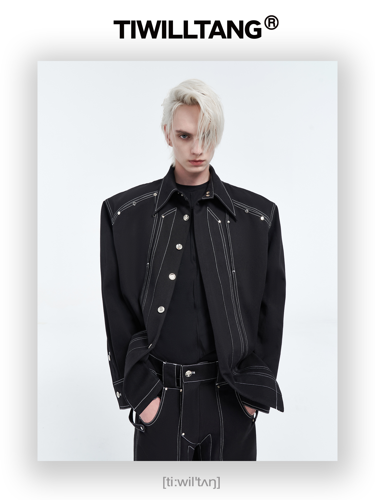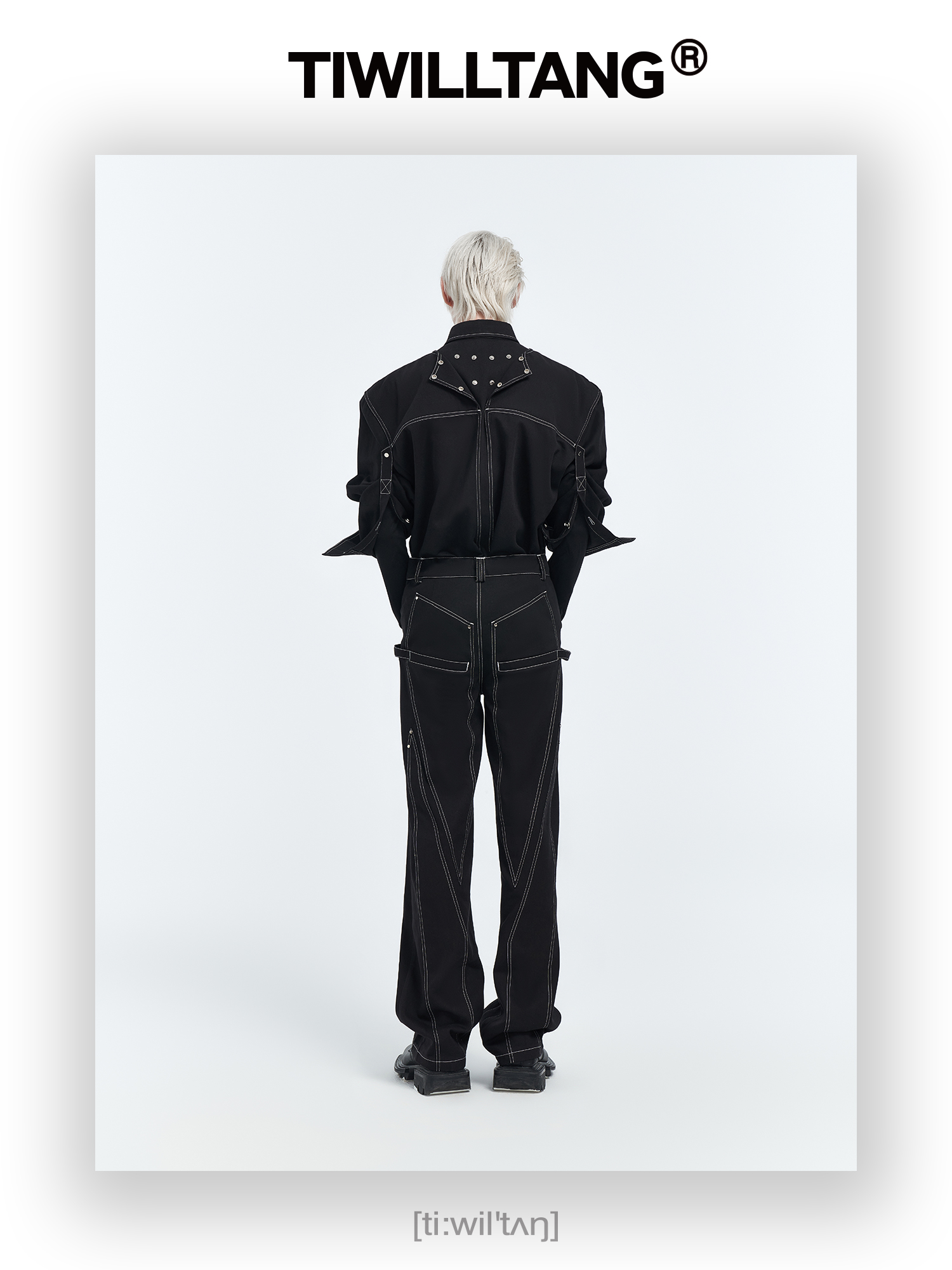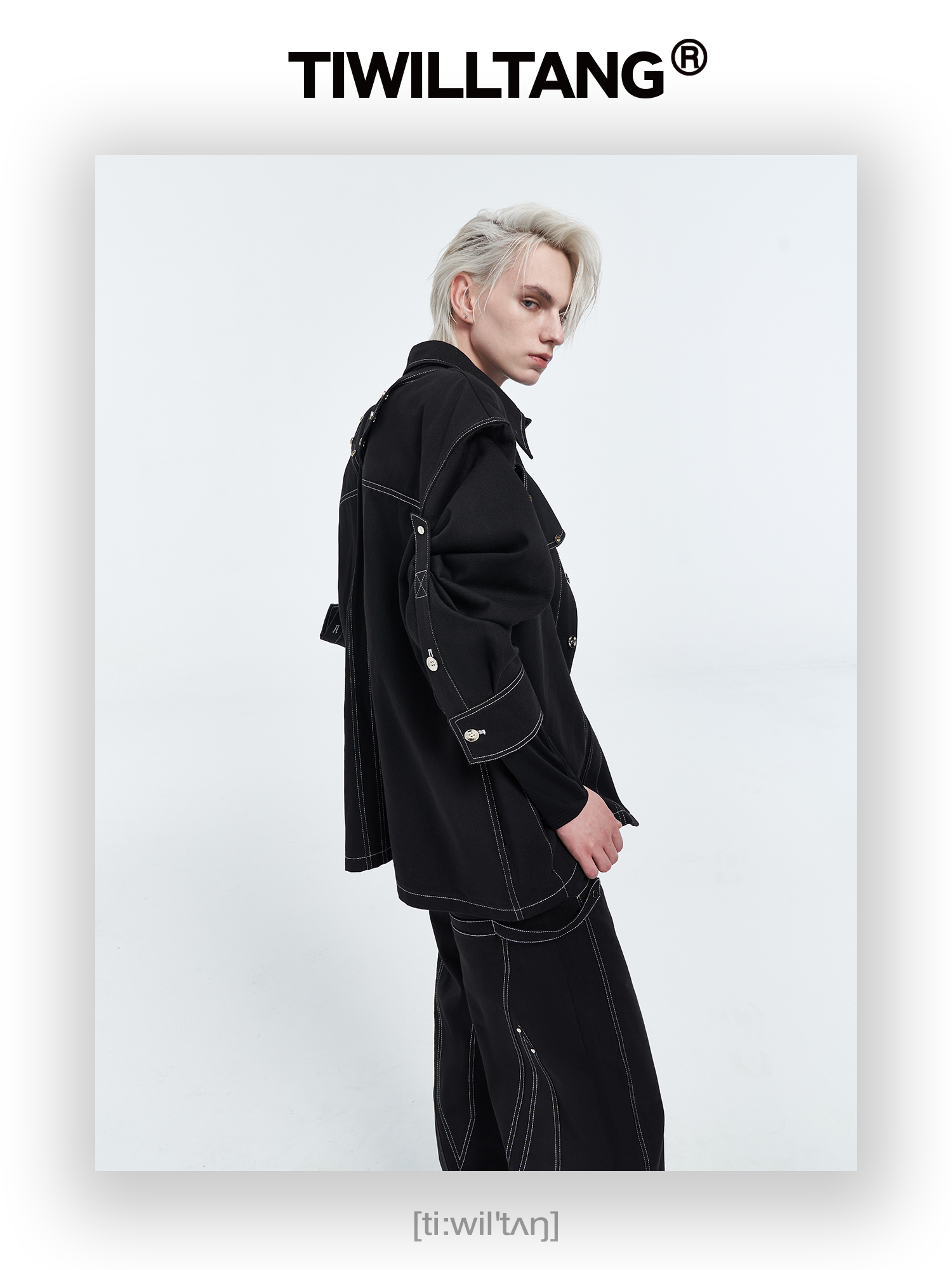TIWILLTANG启世录“纤裕制焕”黑色异形可拆卸铆钉工装夹克套装
