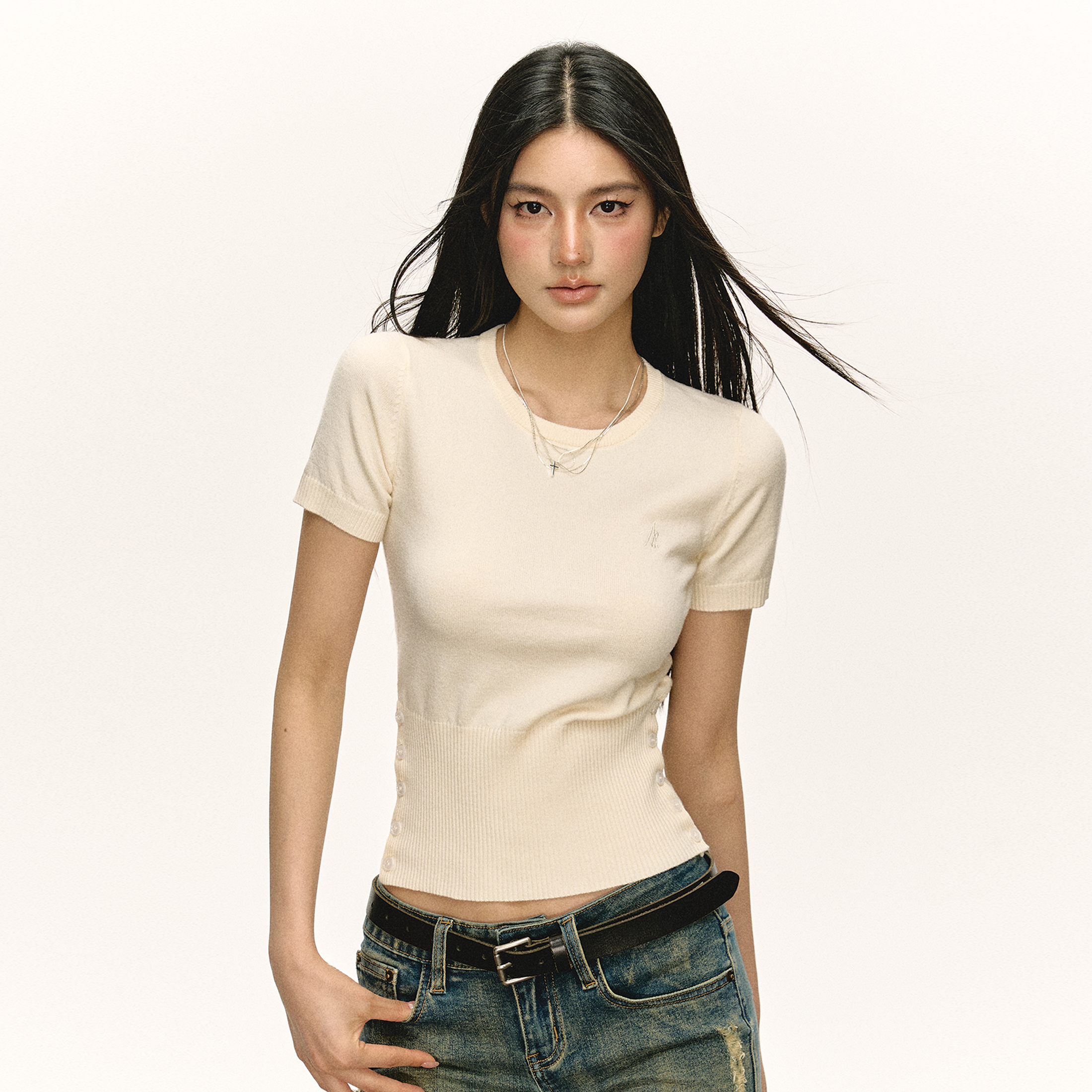 Ariseism 美式复古修身针织短袖T恤女早秋新款基础百搭上衣