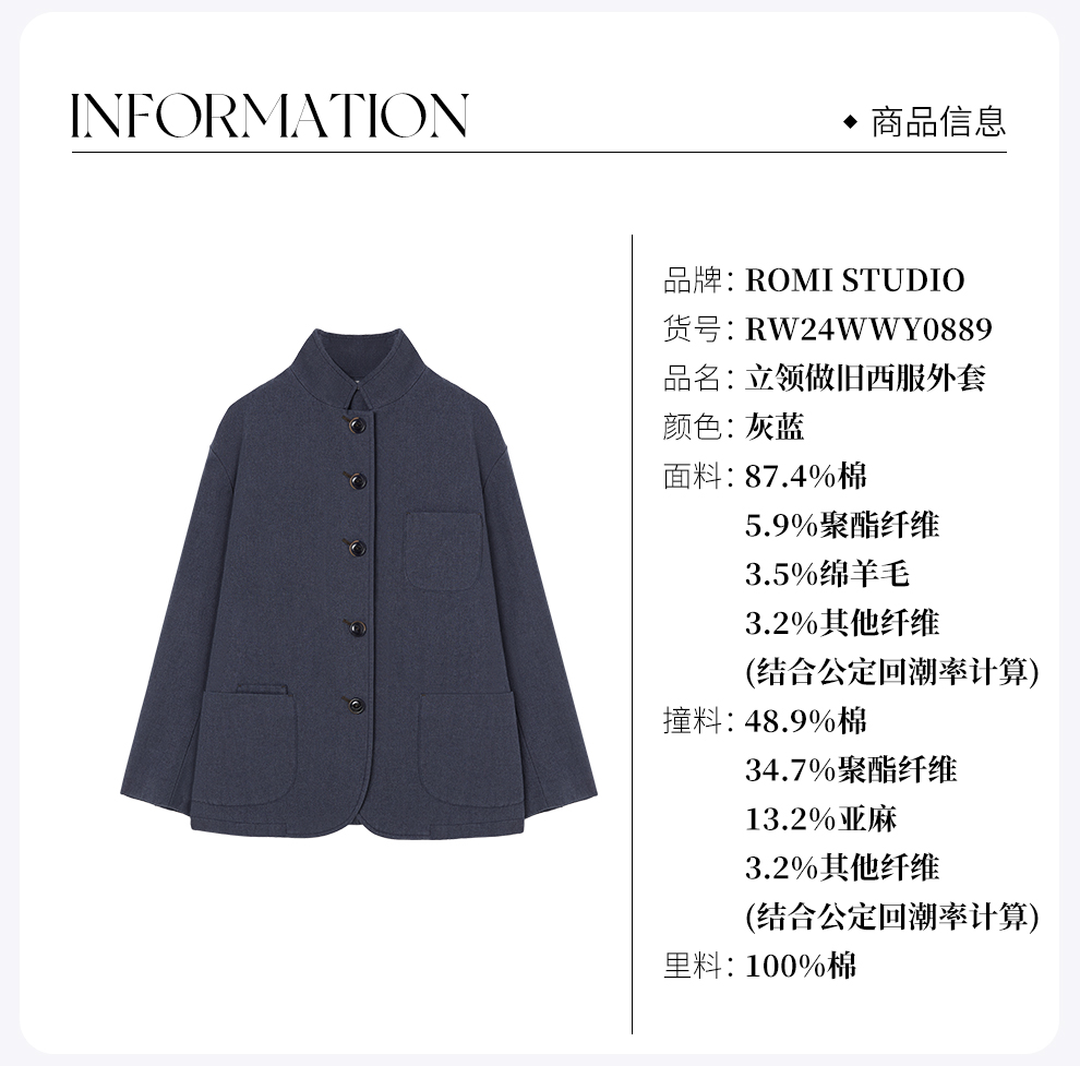 ROMI STUDIO“低调优雅”绵羊毛棉混纺立领做旧西装外套RW24WWY0889