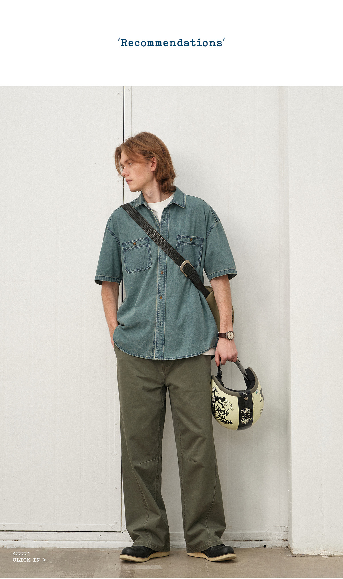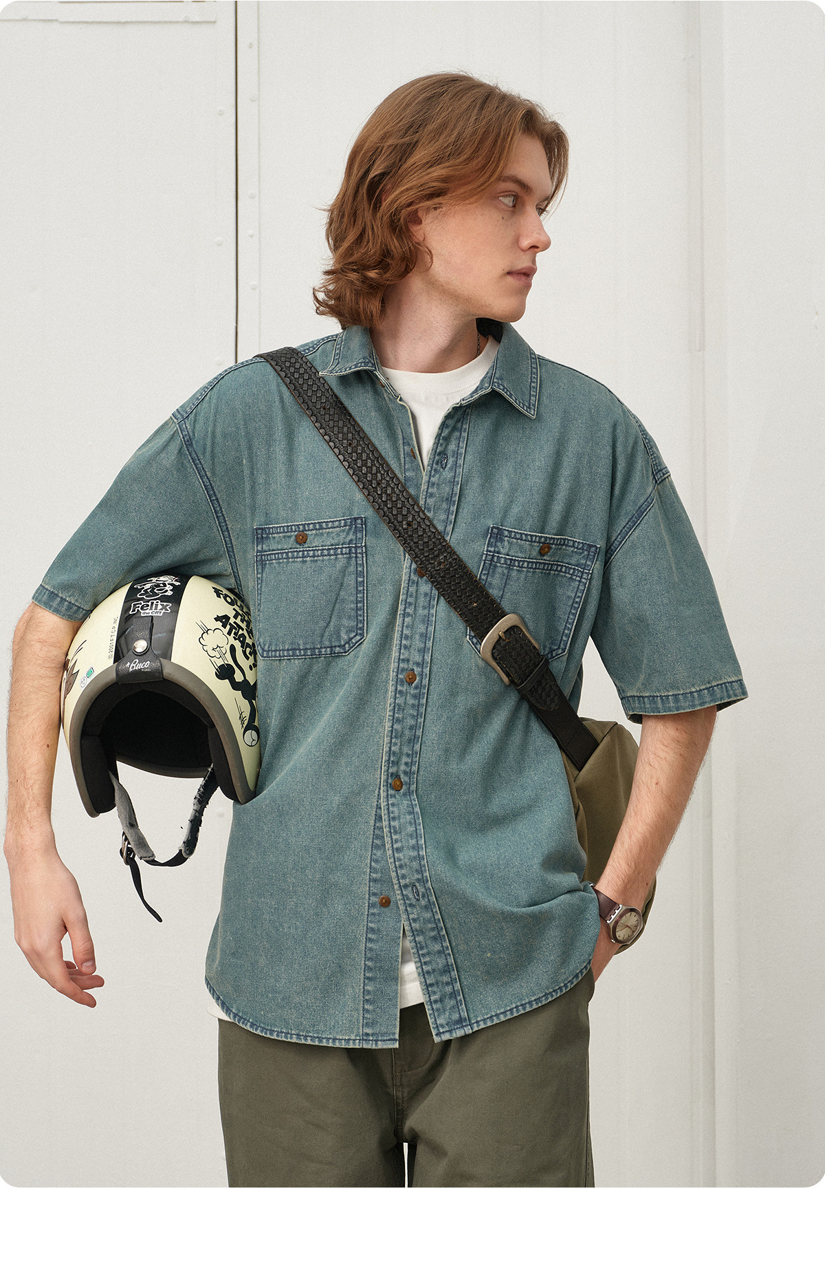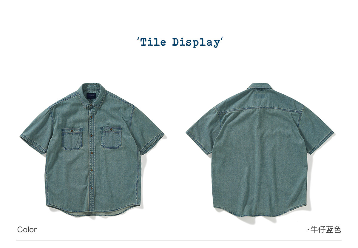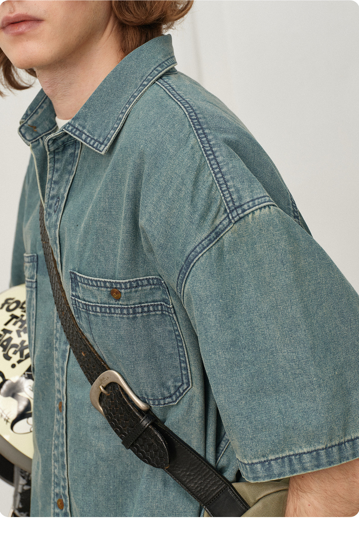 714street日系水洗做旧短袖牛仔衬衫25春夏新款美式复古宽松衬衣