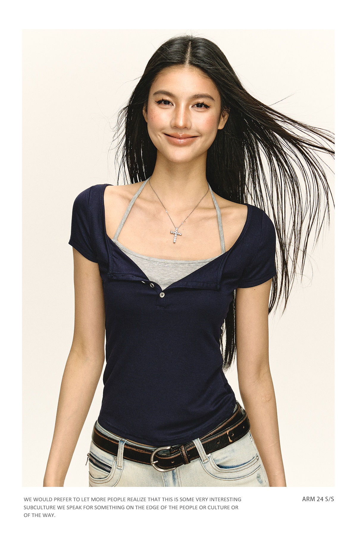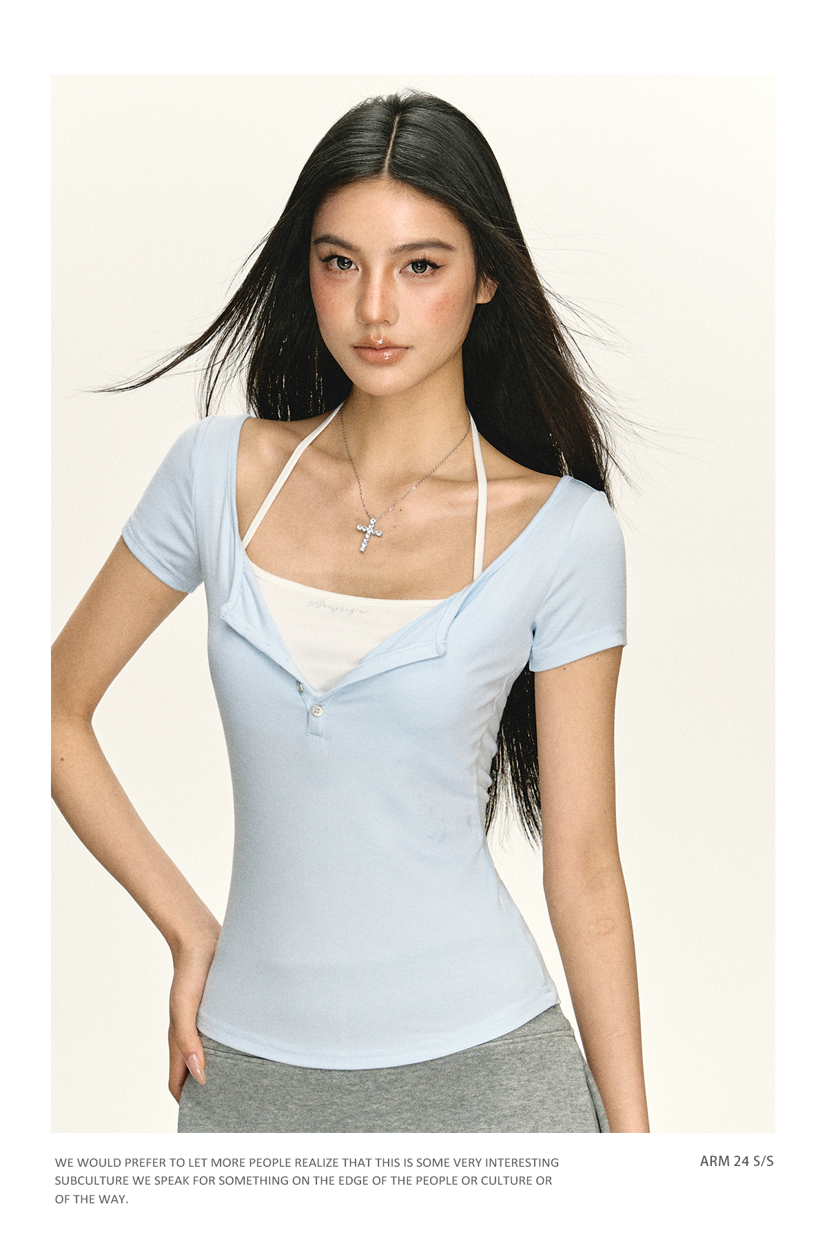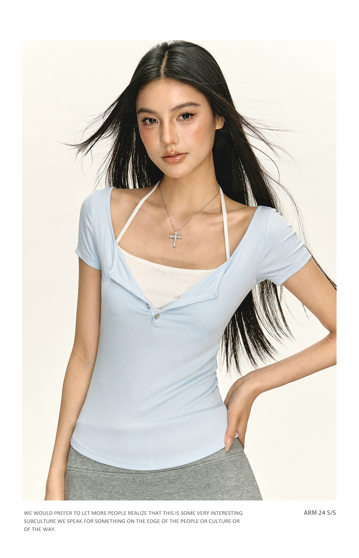 Ariseism 美式复古设计感烫钻假两件短袖T恤女夏季新款修身上衣