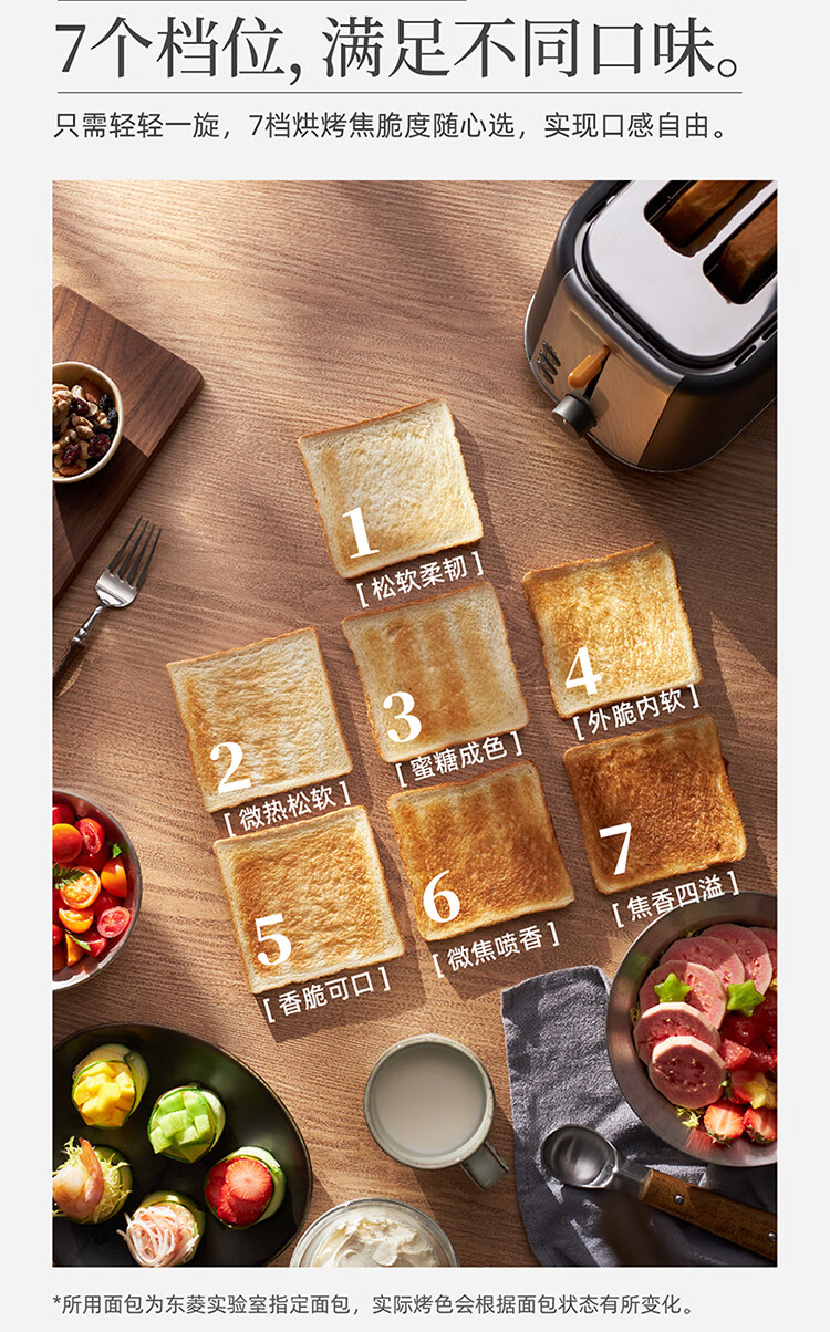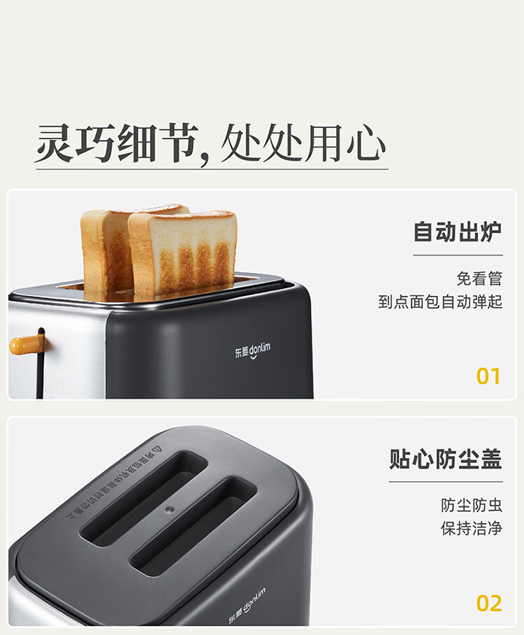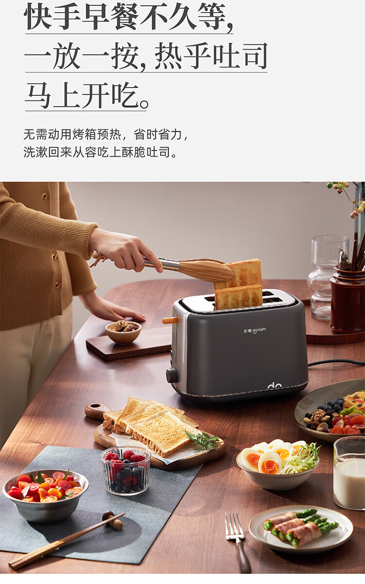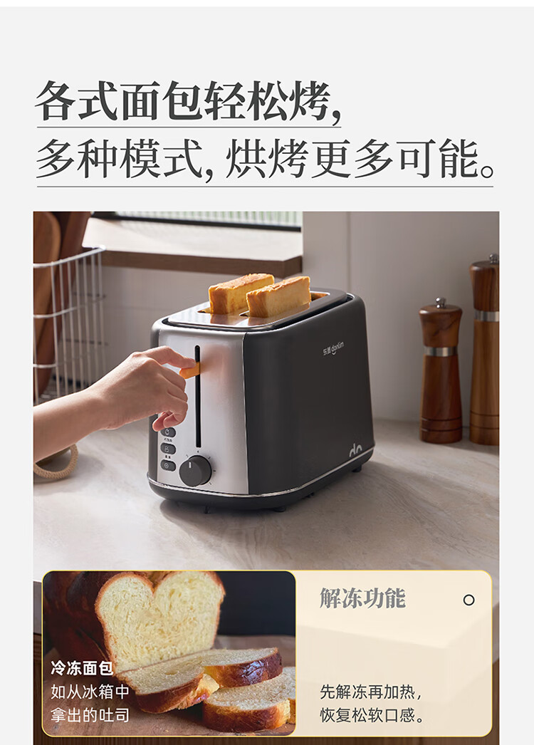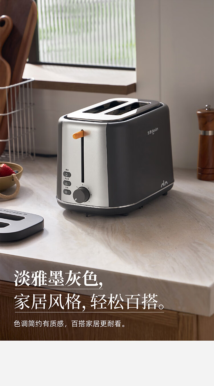 东菱(Donlim)烤面包片家用料理早餐机 2片宿舍小功率多士炉烤吐司神器DL-1405 7档烘烤百搭墨灰色