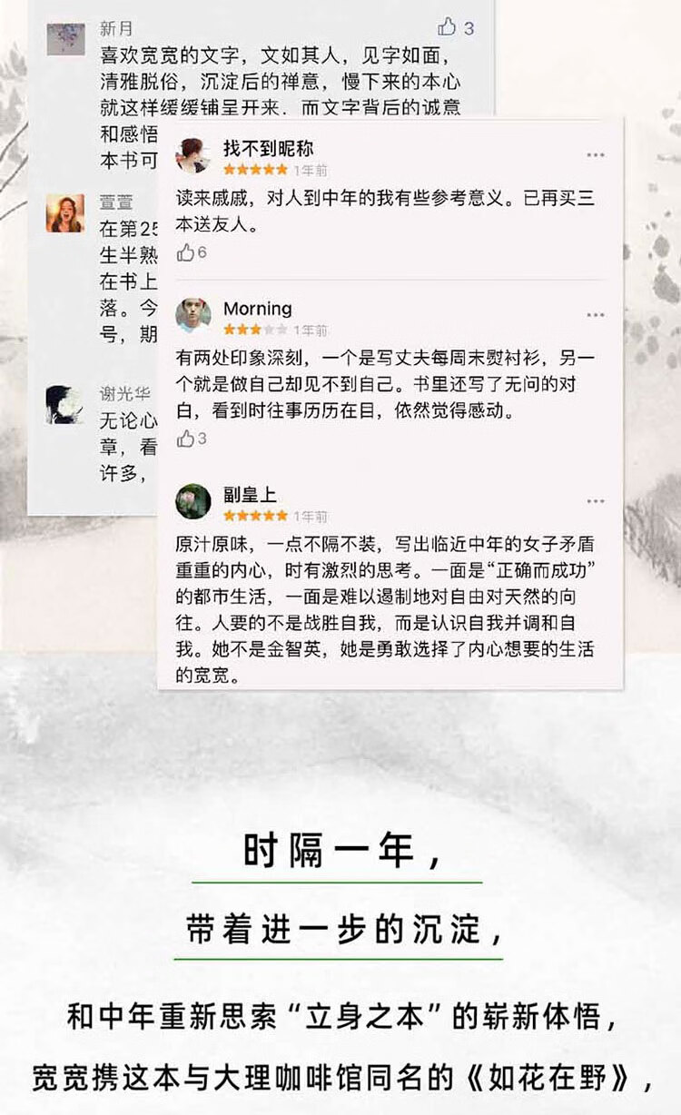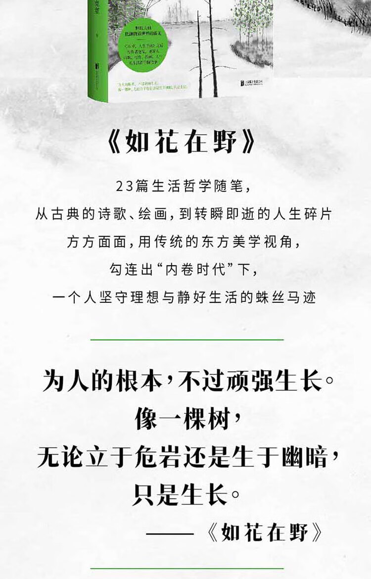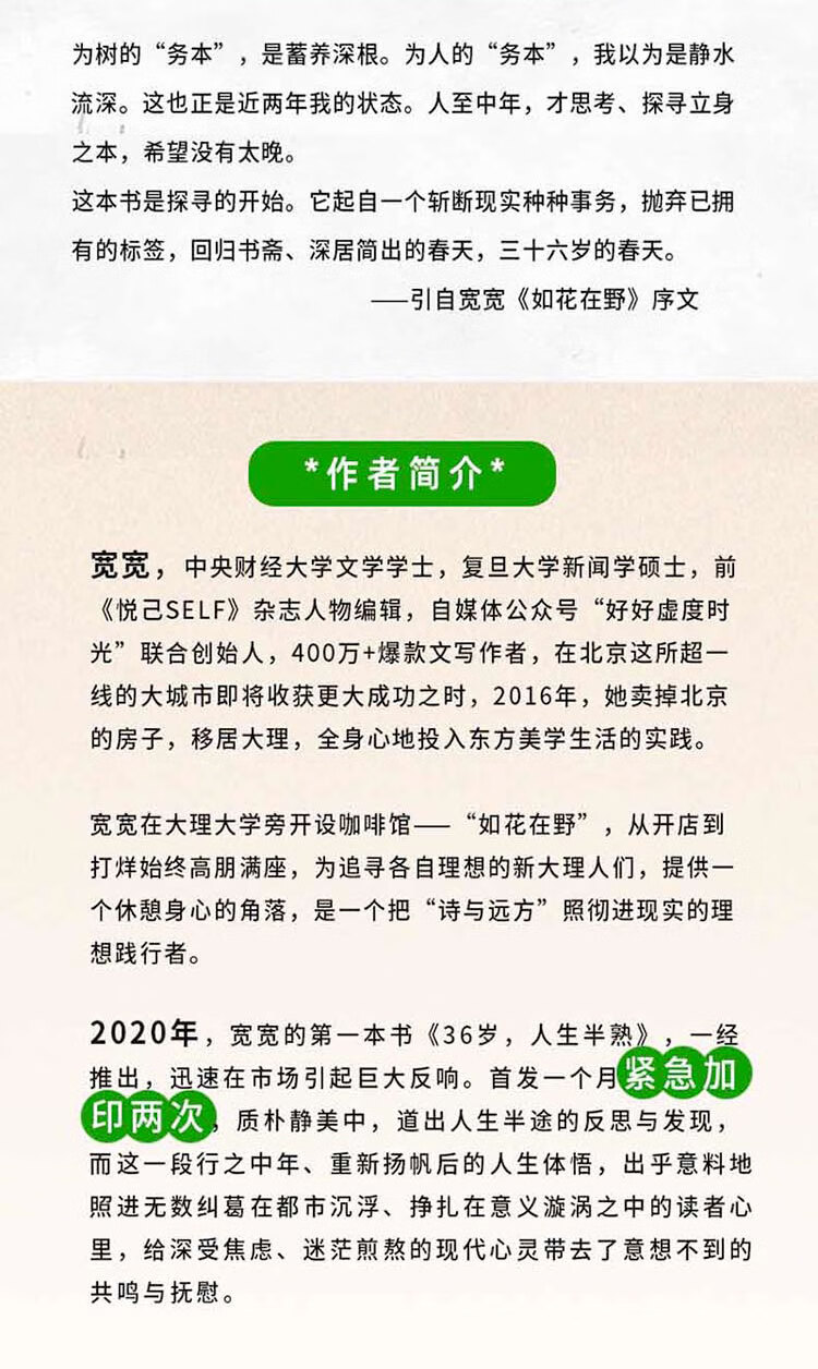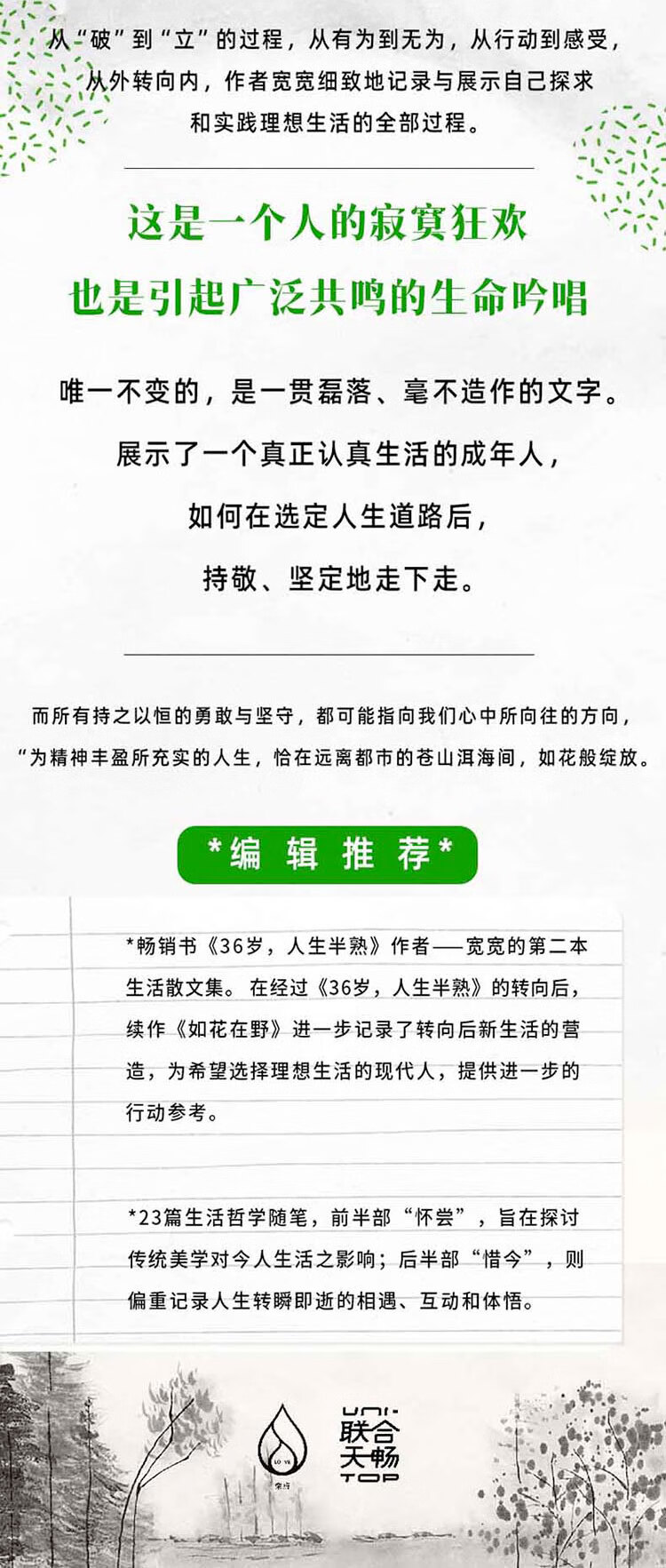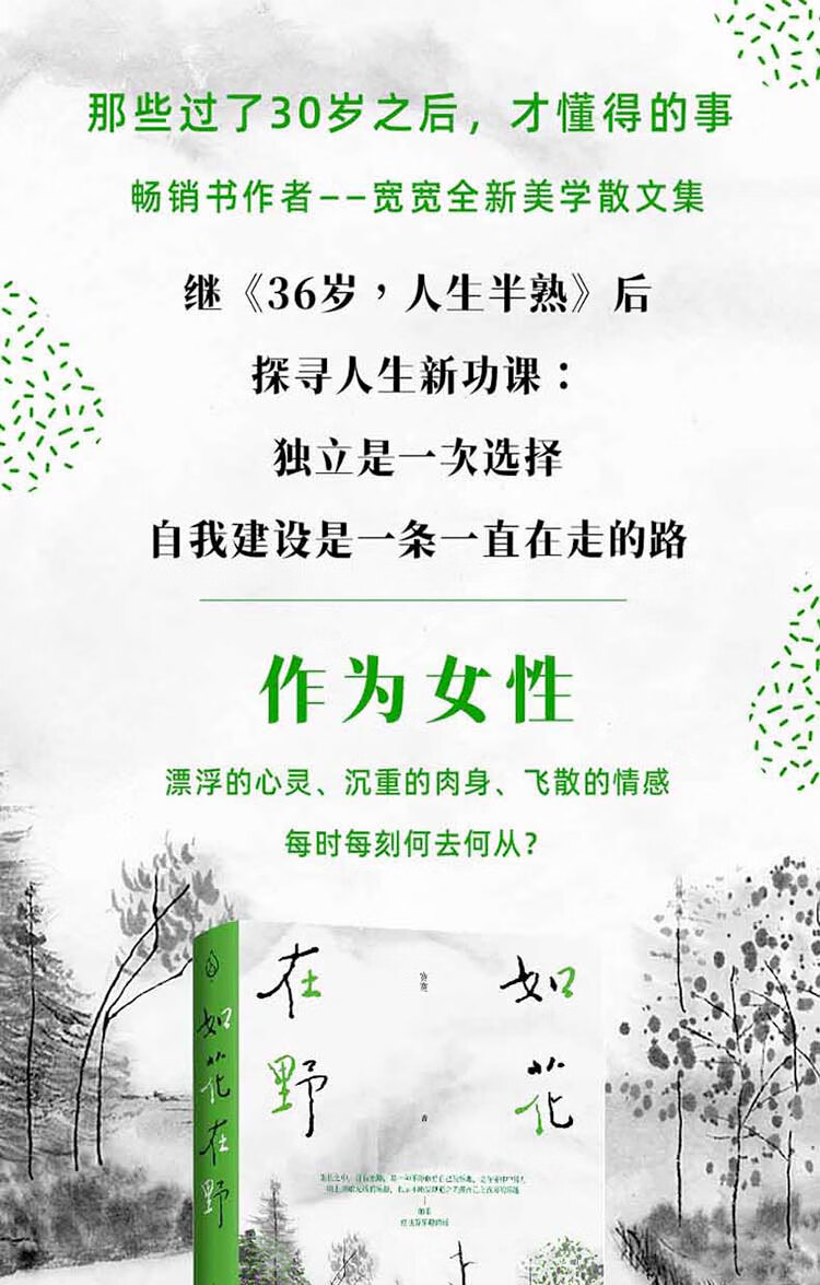 如果说《36岁,人生半熟》是人生面临选择之际的“破”和迷茫,《如花在野》则是作者宽宽对人生新阶段的“立”的记录,书写的,是年近不惑、穿过迷雾后的笃定与从容。23篇生活哲学随笔,包含“怀偿”和“惜今”两部分,从对幼时生活碎片,到个人情感的回溯,及至友人的生死悲欢,更多的,却是在平凡的日常中挖掘出的美,以及对写作、对东方美学、对时代背景下个人之路的深入思考。这个“立”的过程,从有为到无为,从行动到感受,从外转向内,是一个人的狂欢,也是能引起广泛共鸣的生命吟唱。而一贯真诚,毫不造作的文字,延续了前作的优点与沉思,向读者展示了选定自己的路后,坚定地往下走,可能到达的方向——为精神丰盈所充实的人生,在远离都市的苍山洱海间,如花般绽放,展现生命的原初能量,欲望的自然姿态。