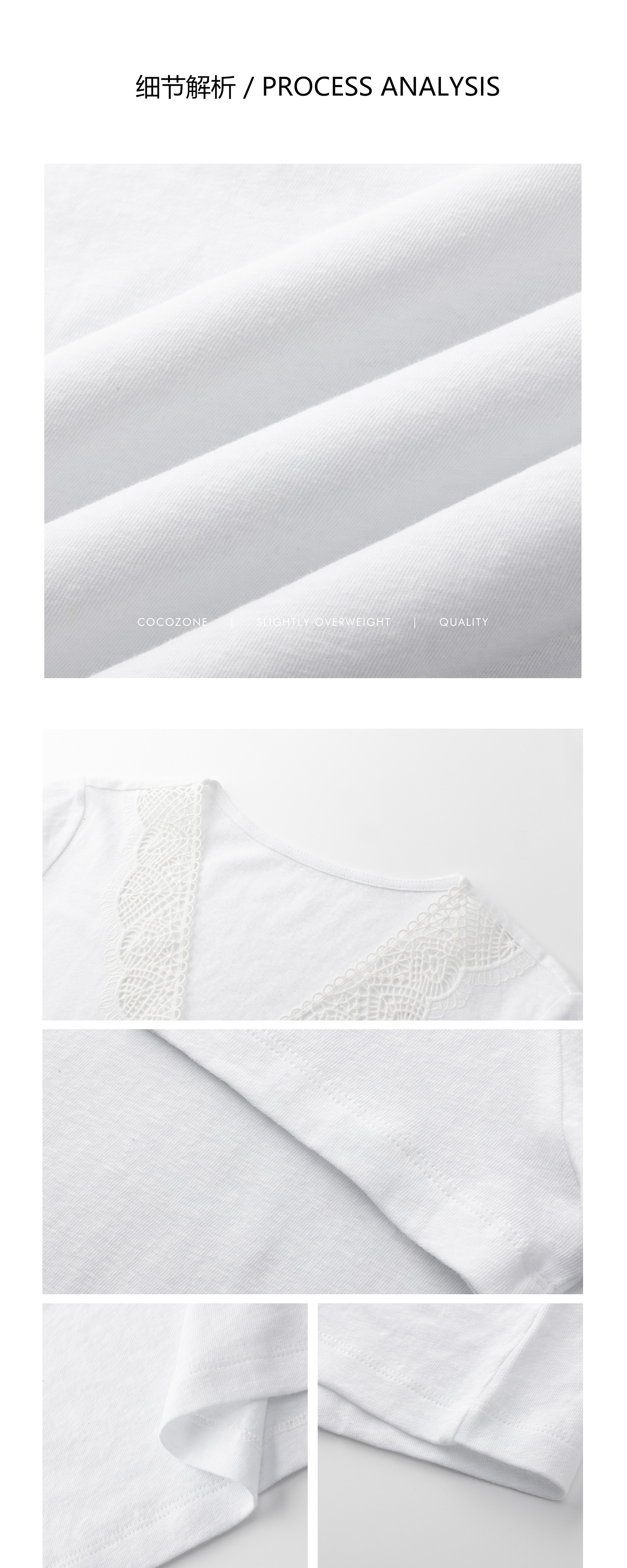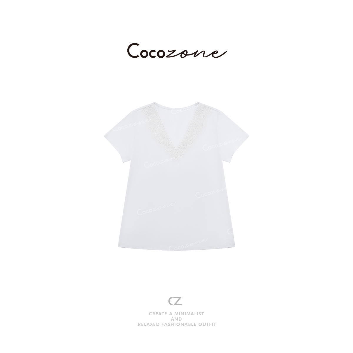 COCO ZONE 刘一一【棉亚麻混纺】纯色休闲蕾丝V领短袖T恤CD1A0520