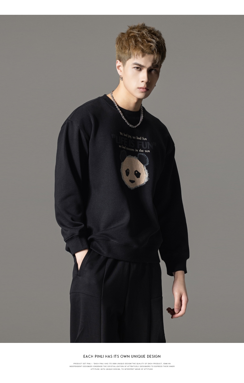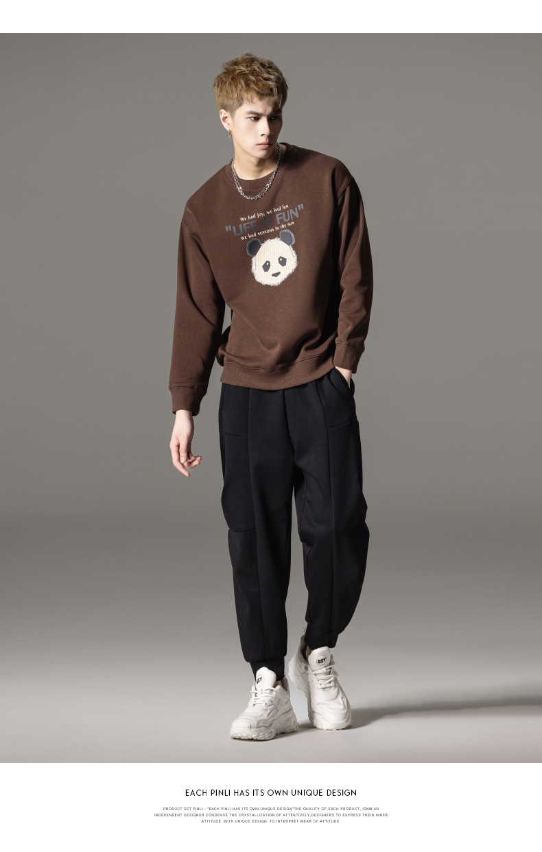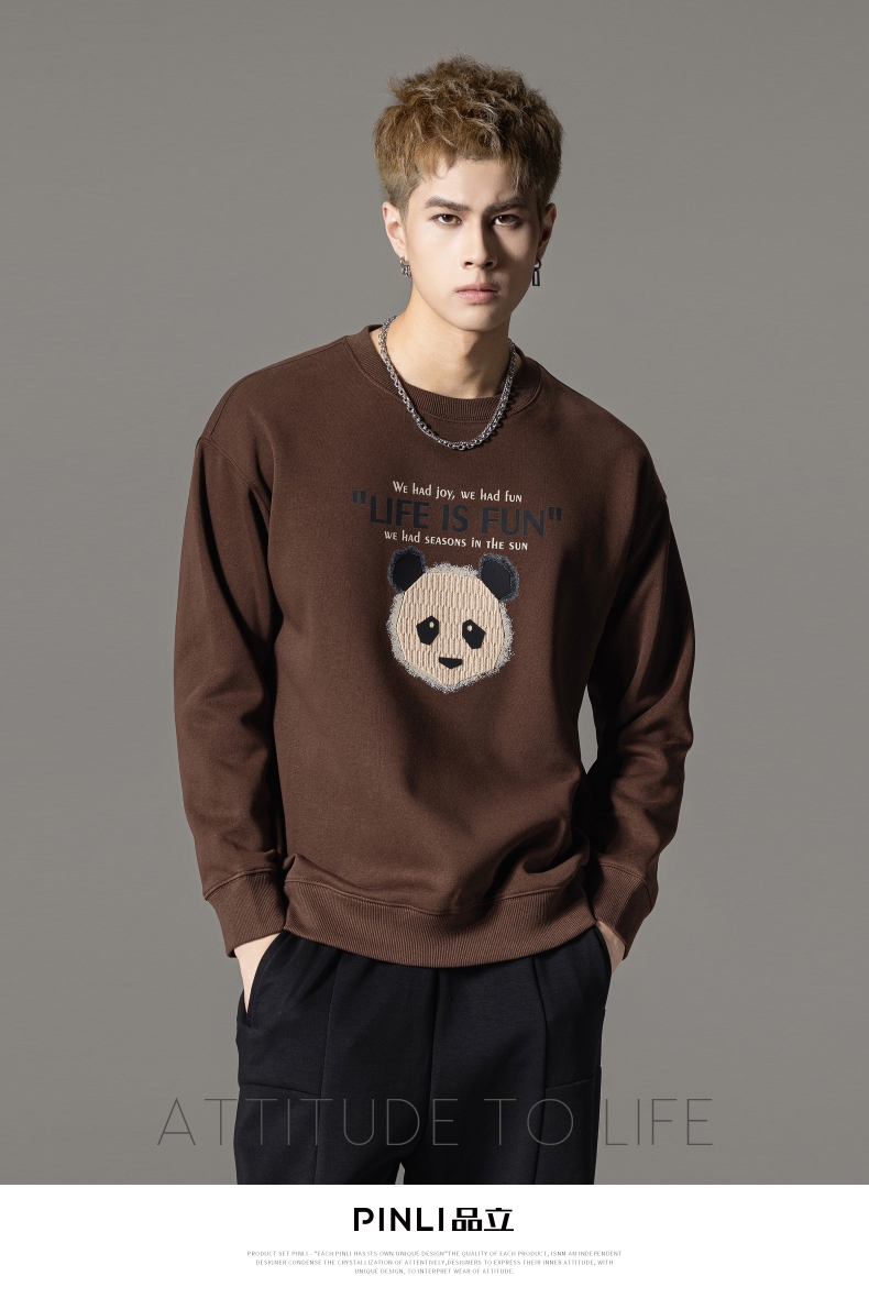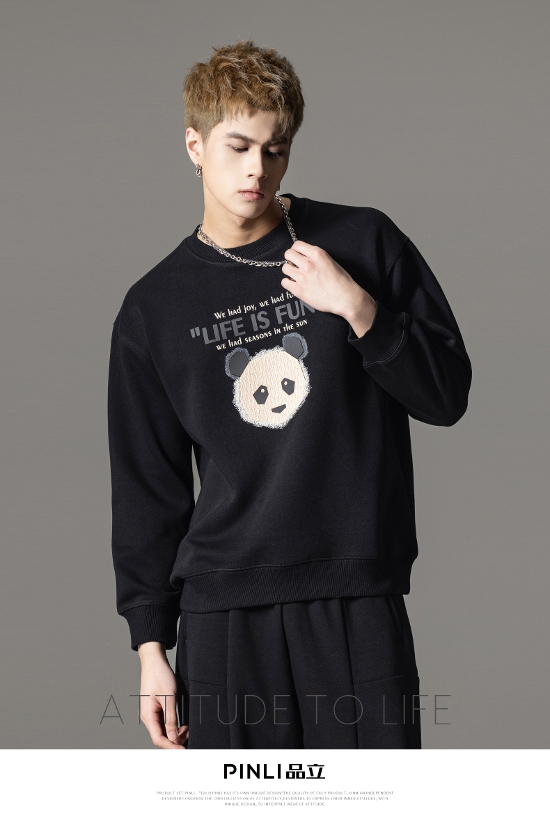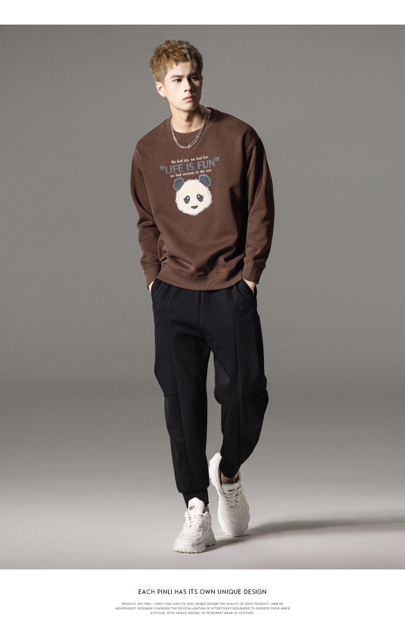 PINLI品立秋冬新款男士熊猫贴布压胶字母烫画圆领套头卫衣潮BG233109037
