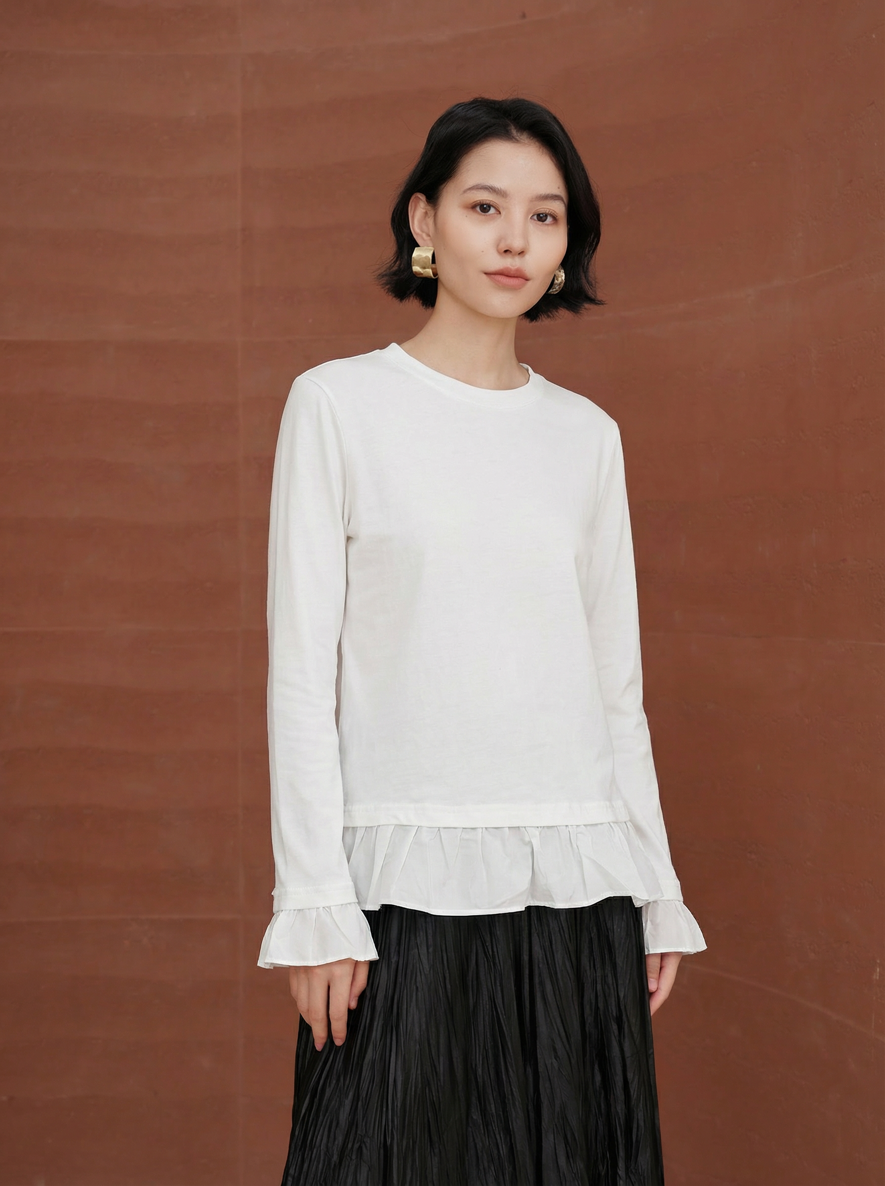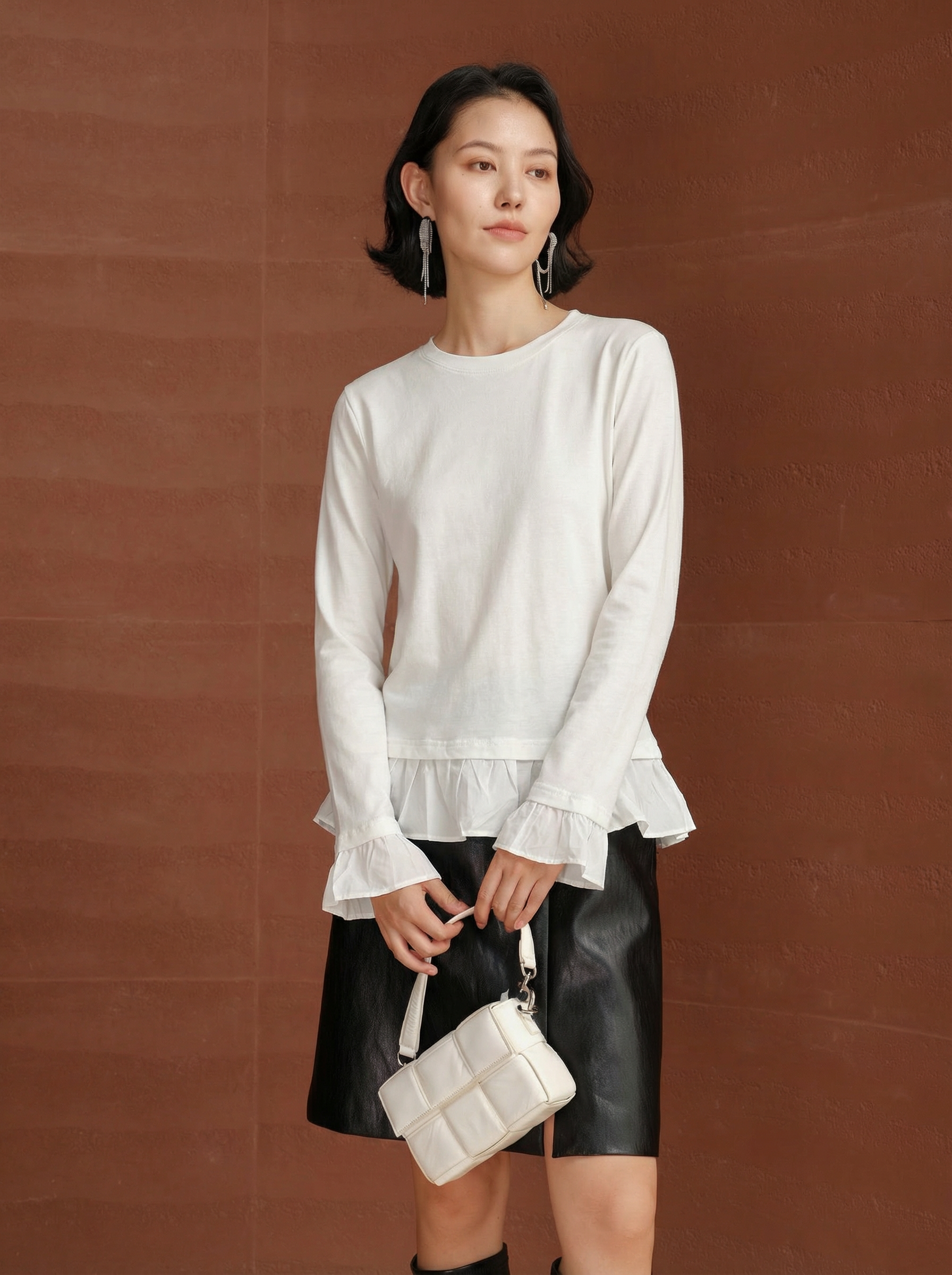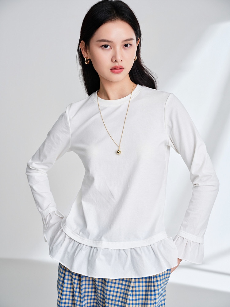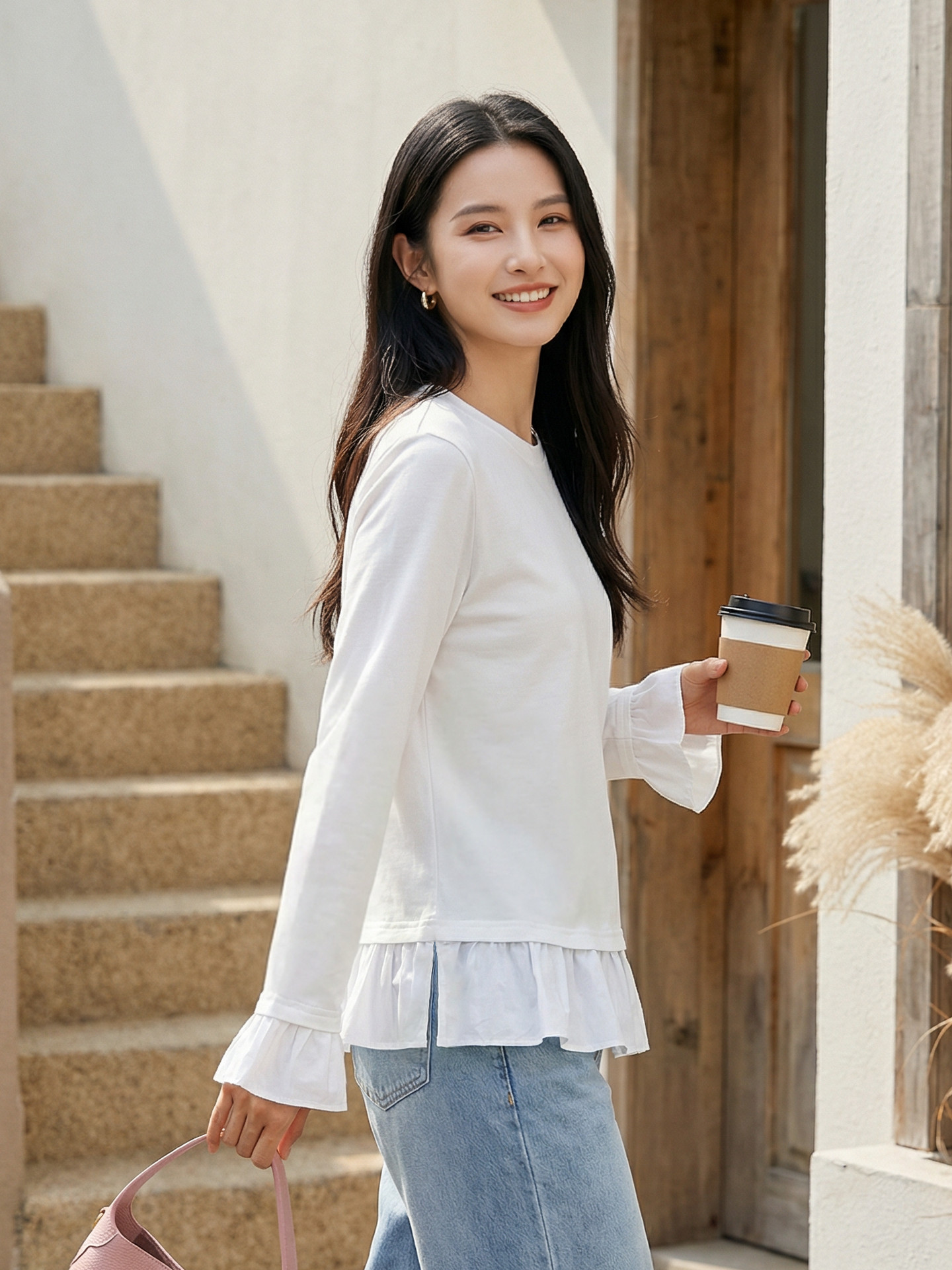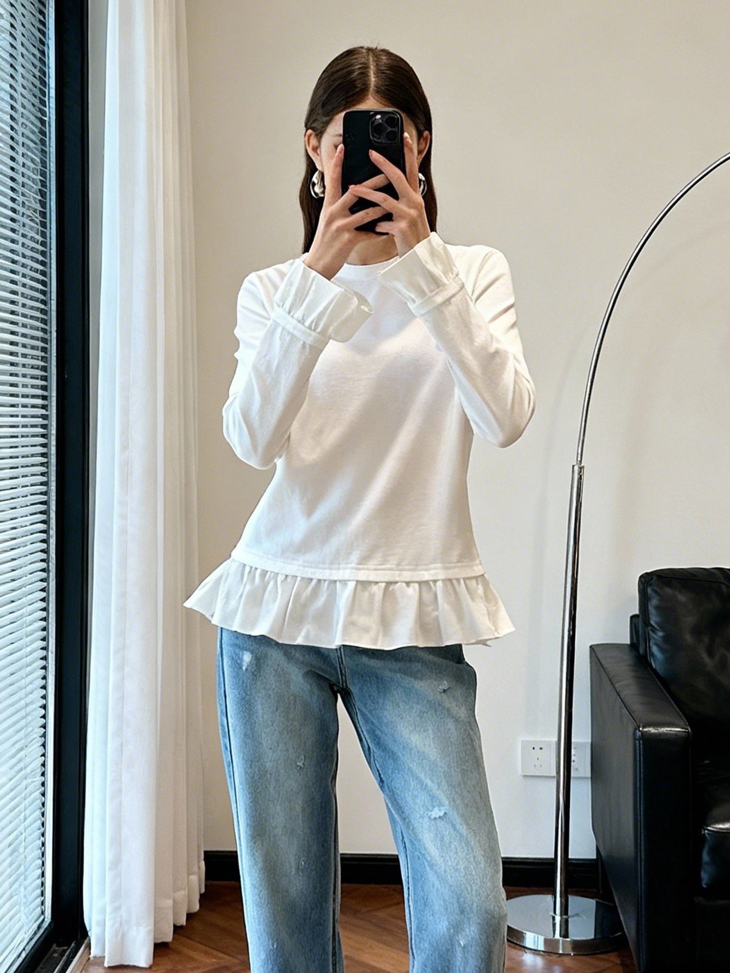 基础白 T 基础上,袖子、下摆做了独特的芭蕾风花边设计,瞬间打破常规 T 恤的单调感~
