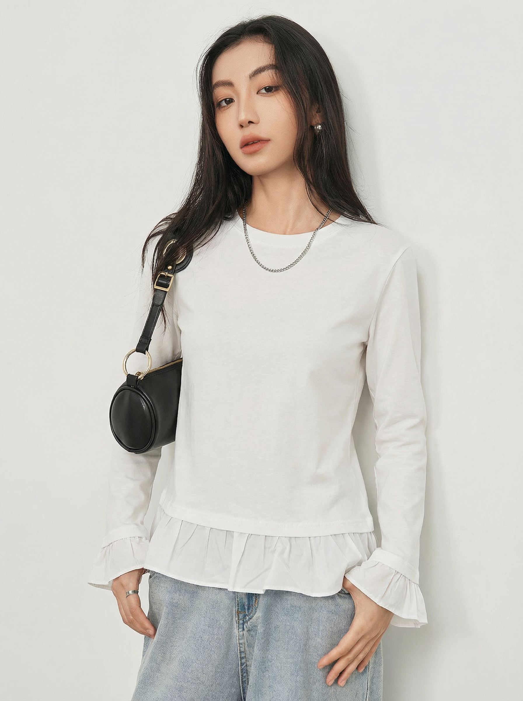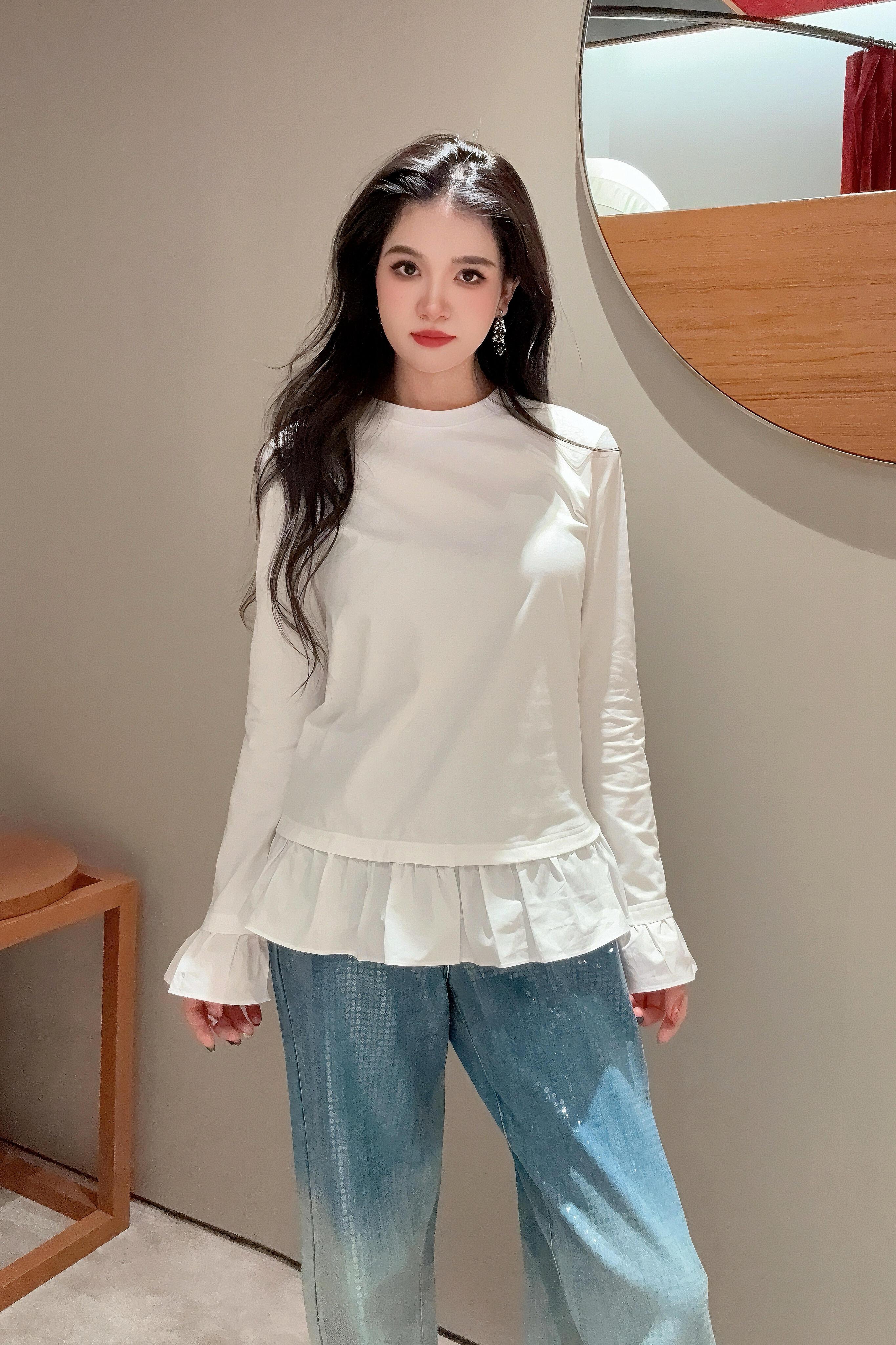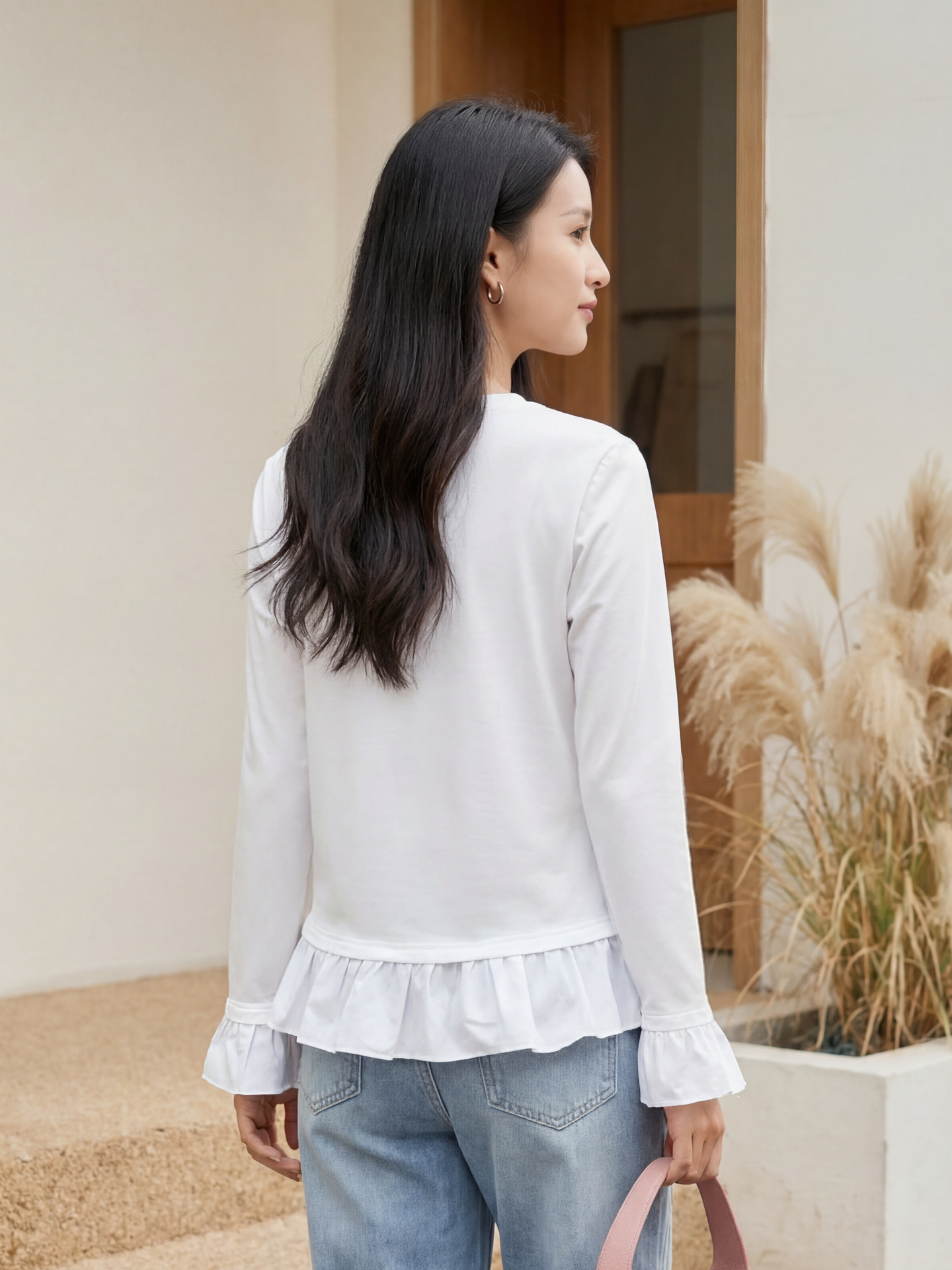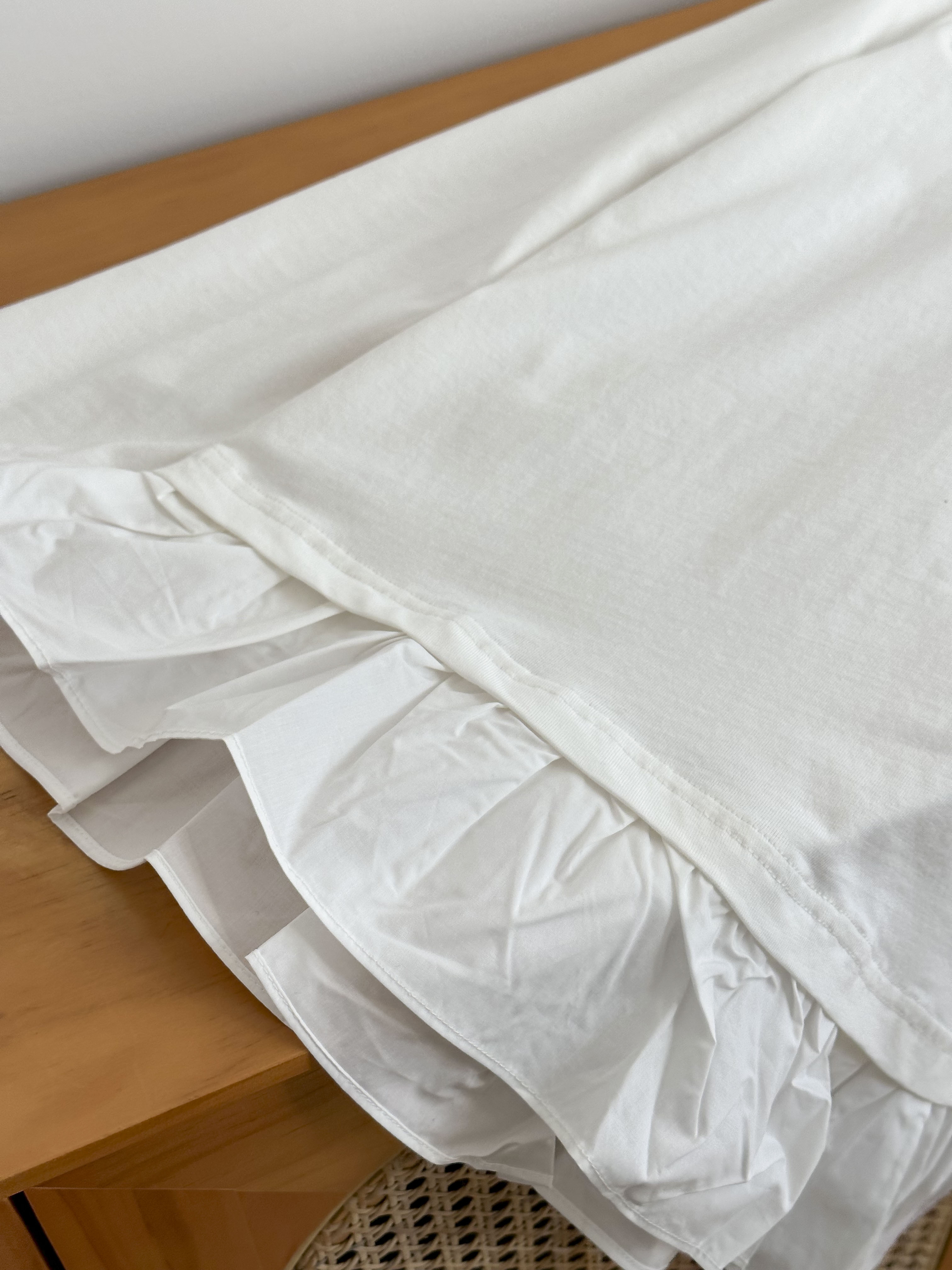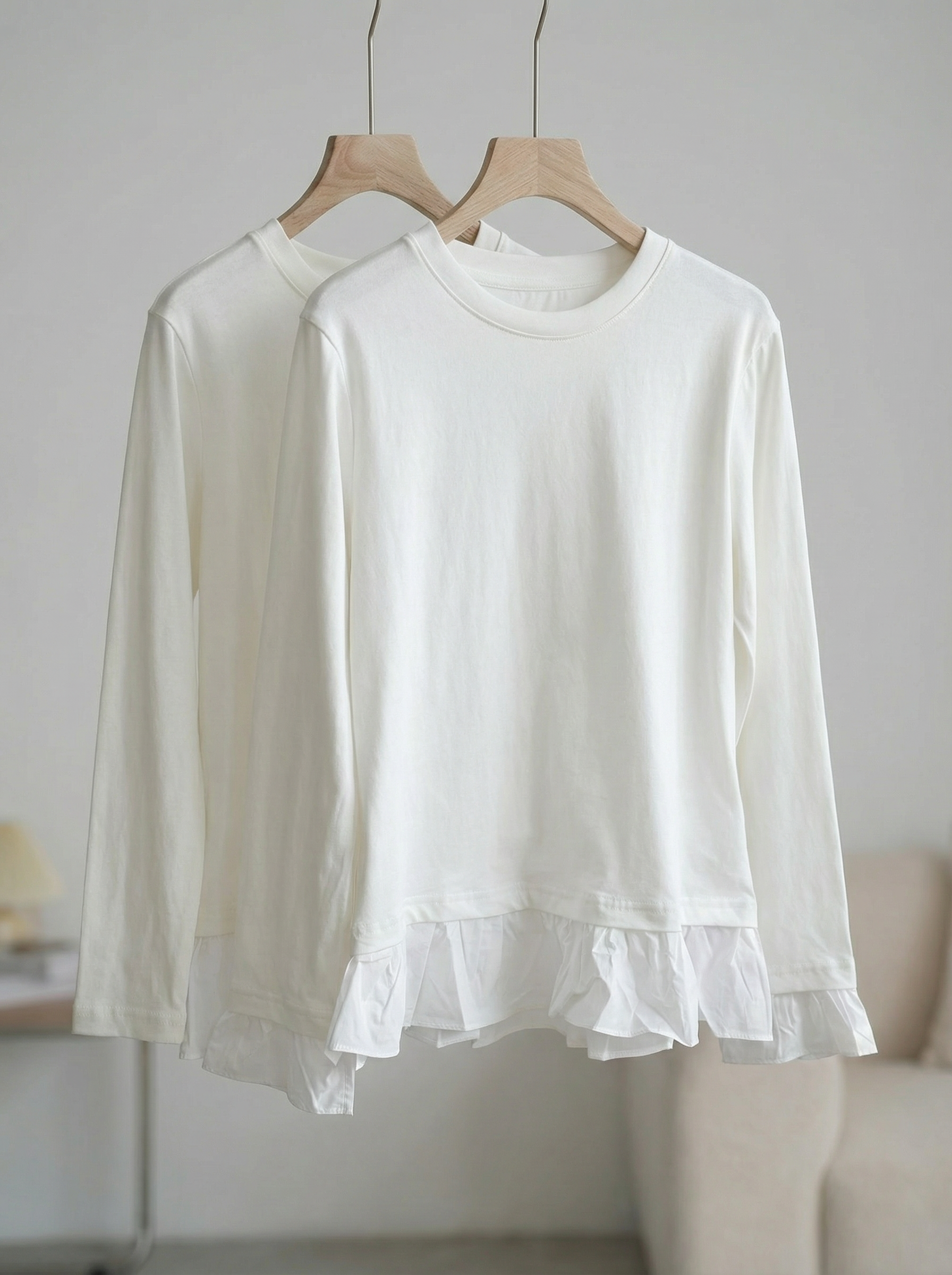 基础白 T 基础上,袖子、下摆做了独特的芭蕾风花边设计,瞬间打破常规 T 恤的单调感~