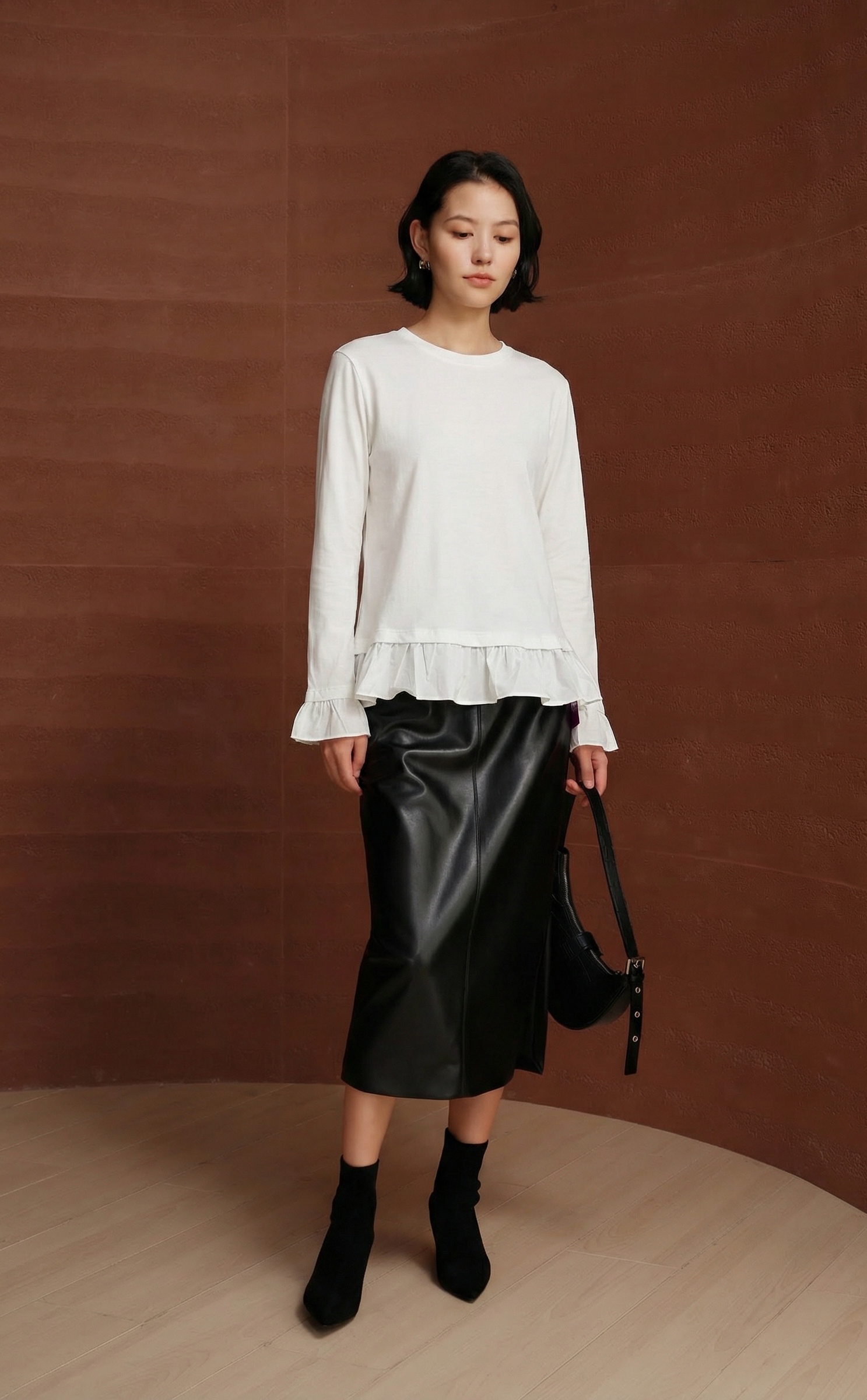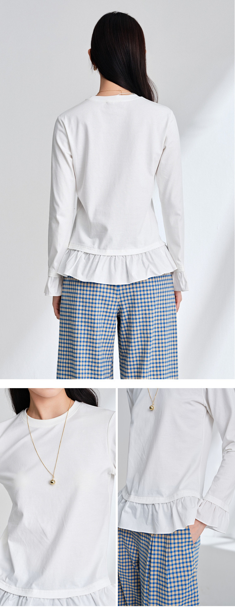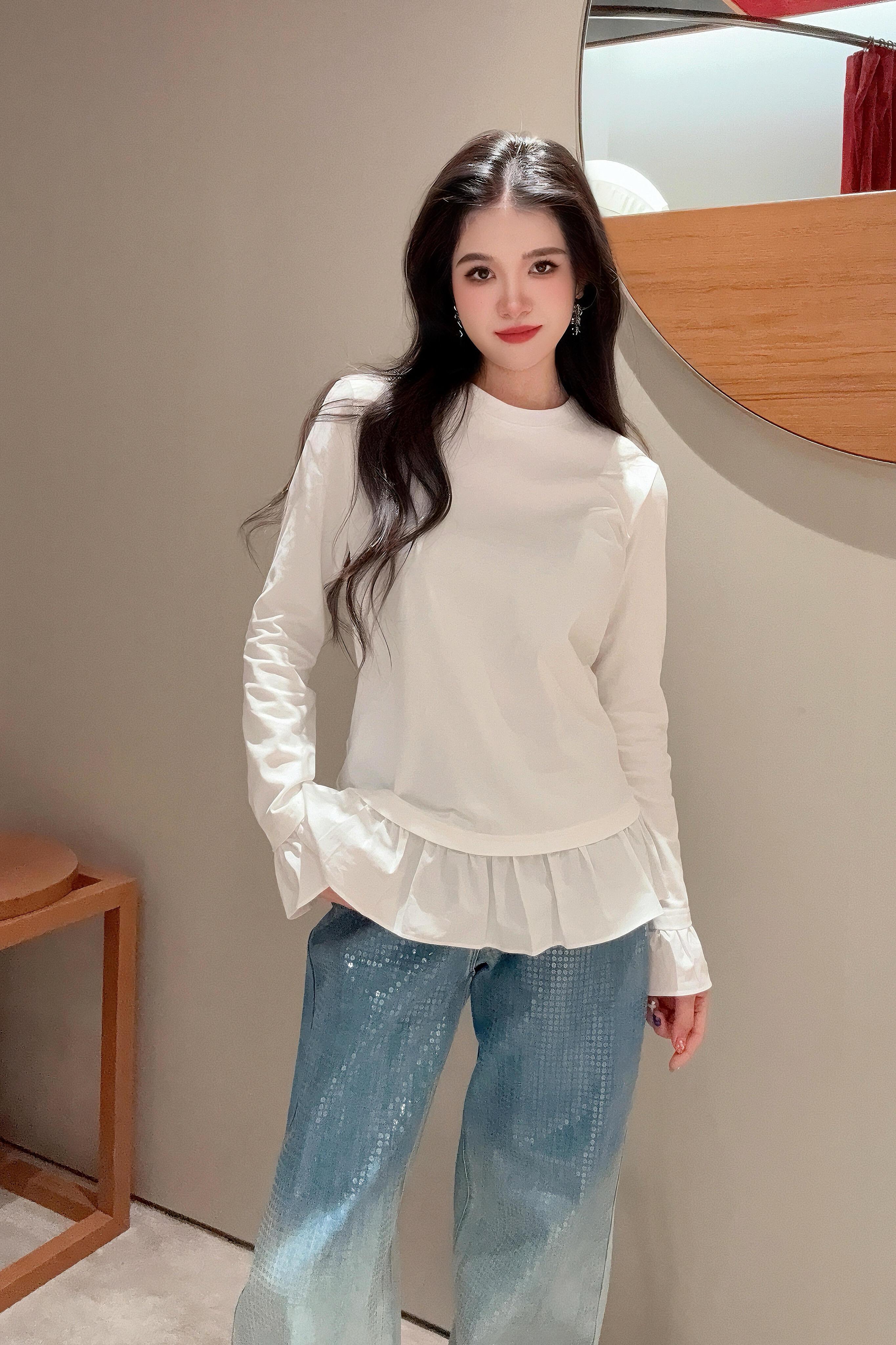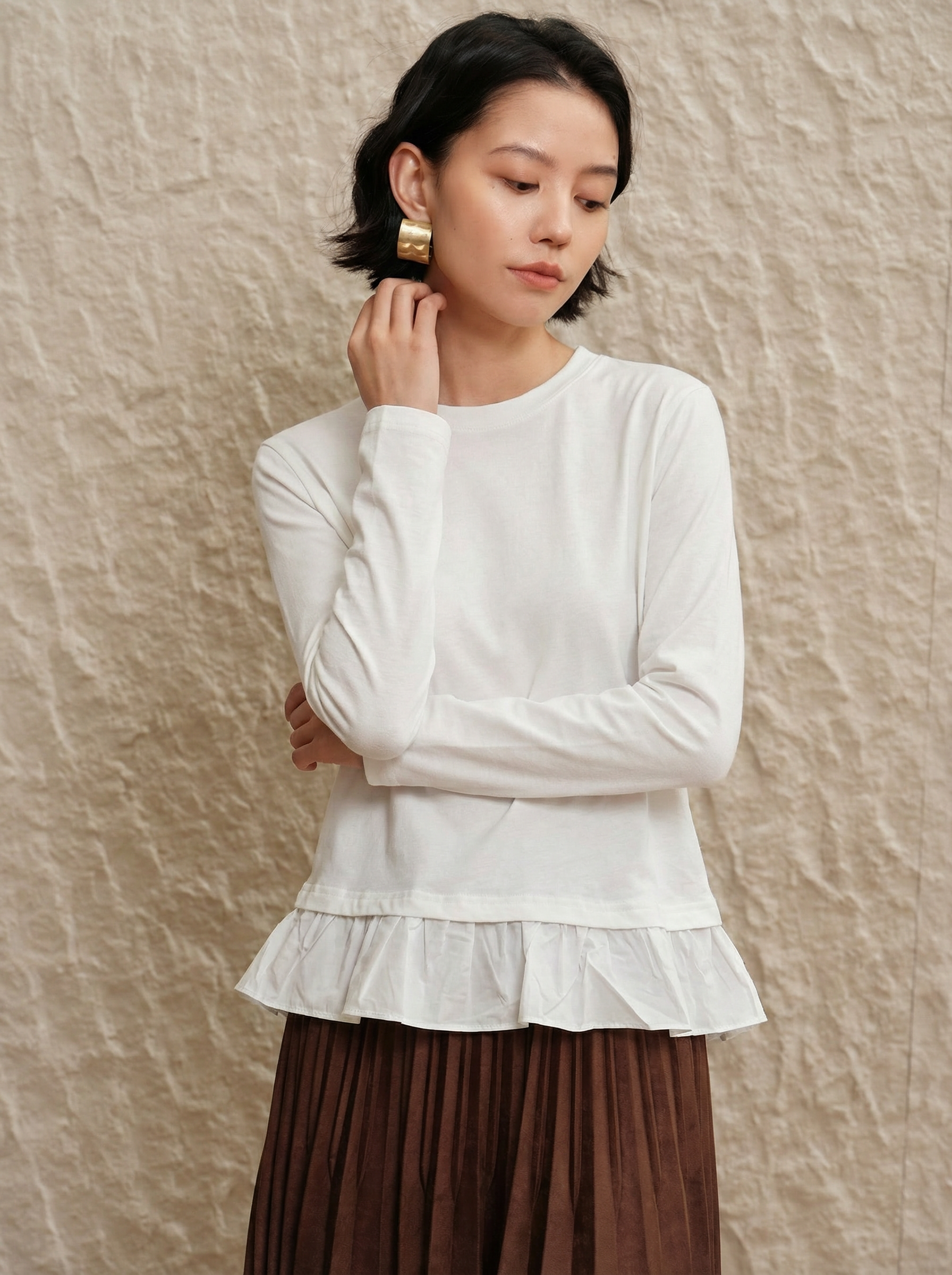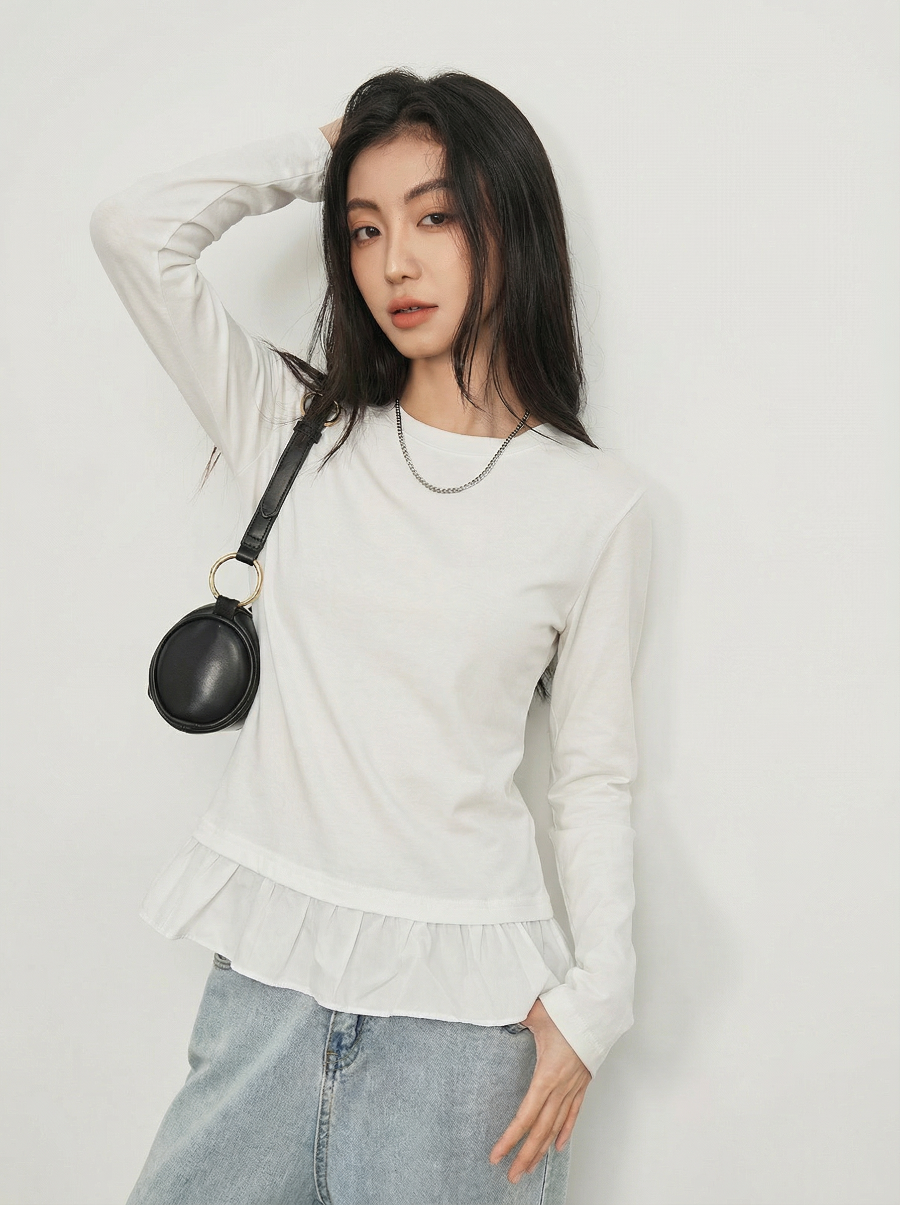 基础白 T 基础上,袖子、下摆做了独特的芭蕾风花边设计,瞬间打破常规 T 恤的单调感~