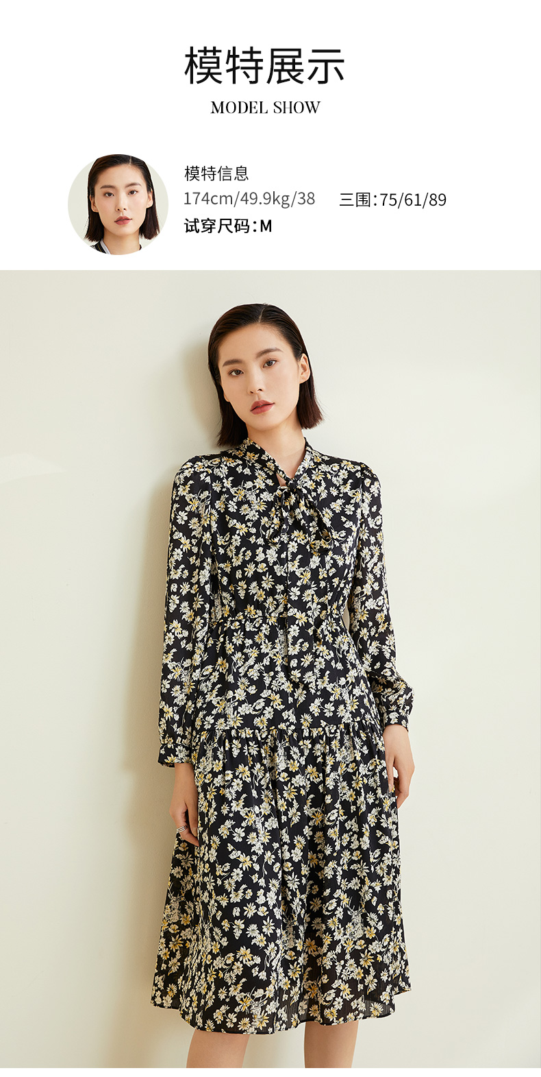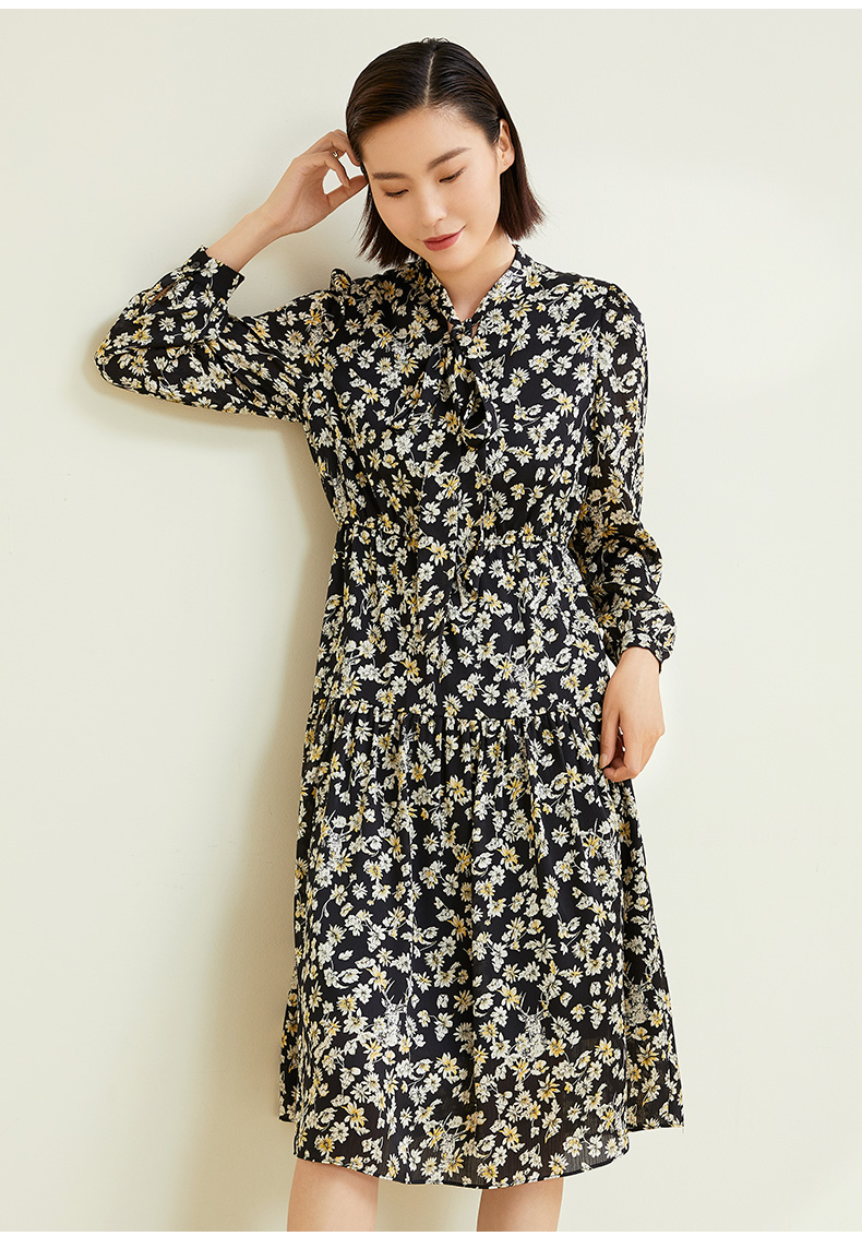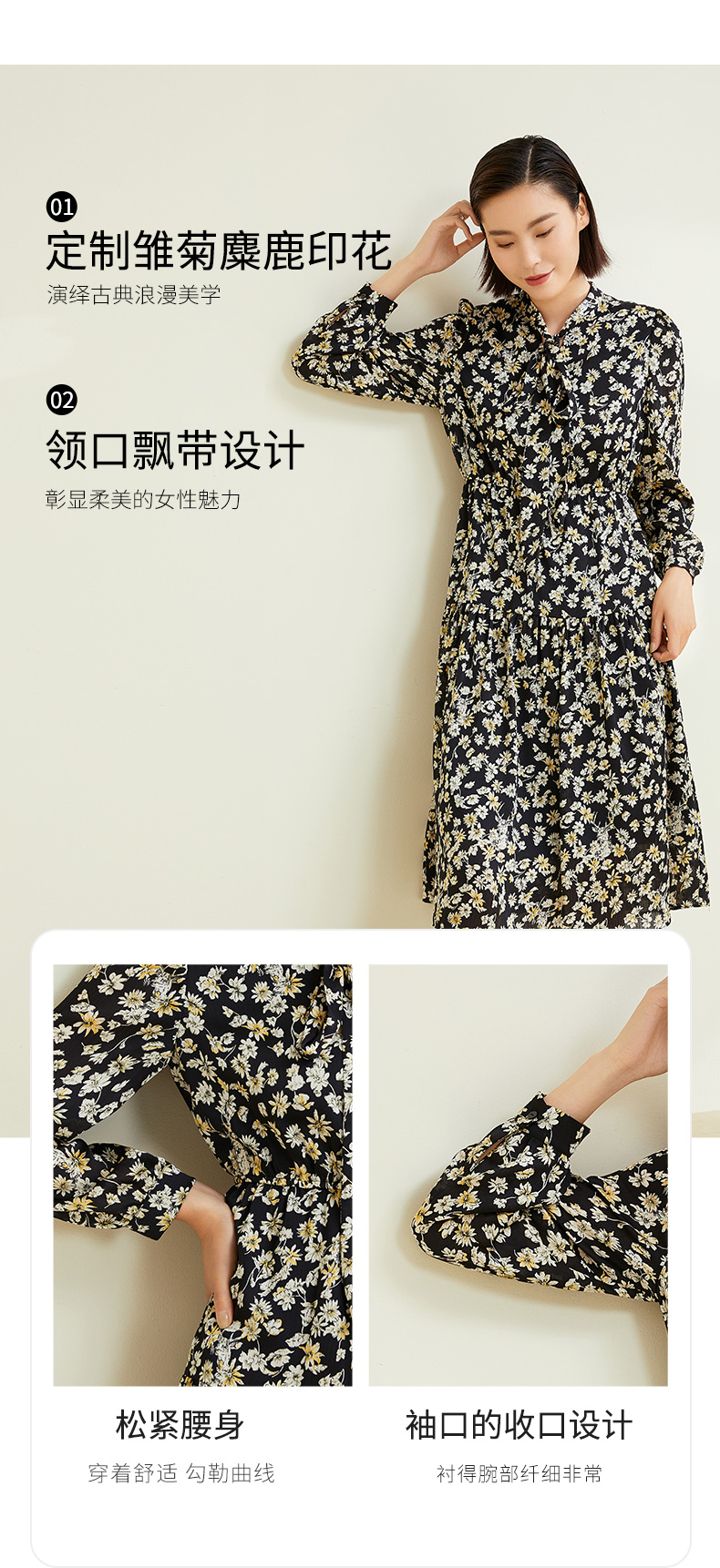 玳莎显瘦连衣裙女2022新款秋季优雅碎花长袖飘带设计感中长款裙子 CC35301