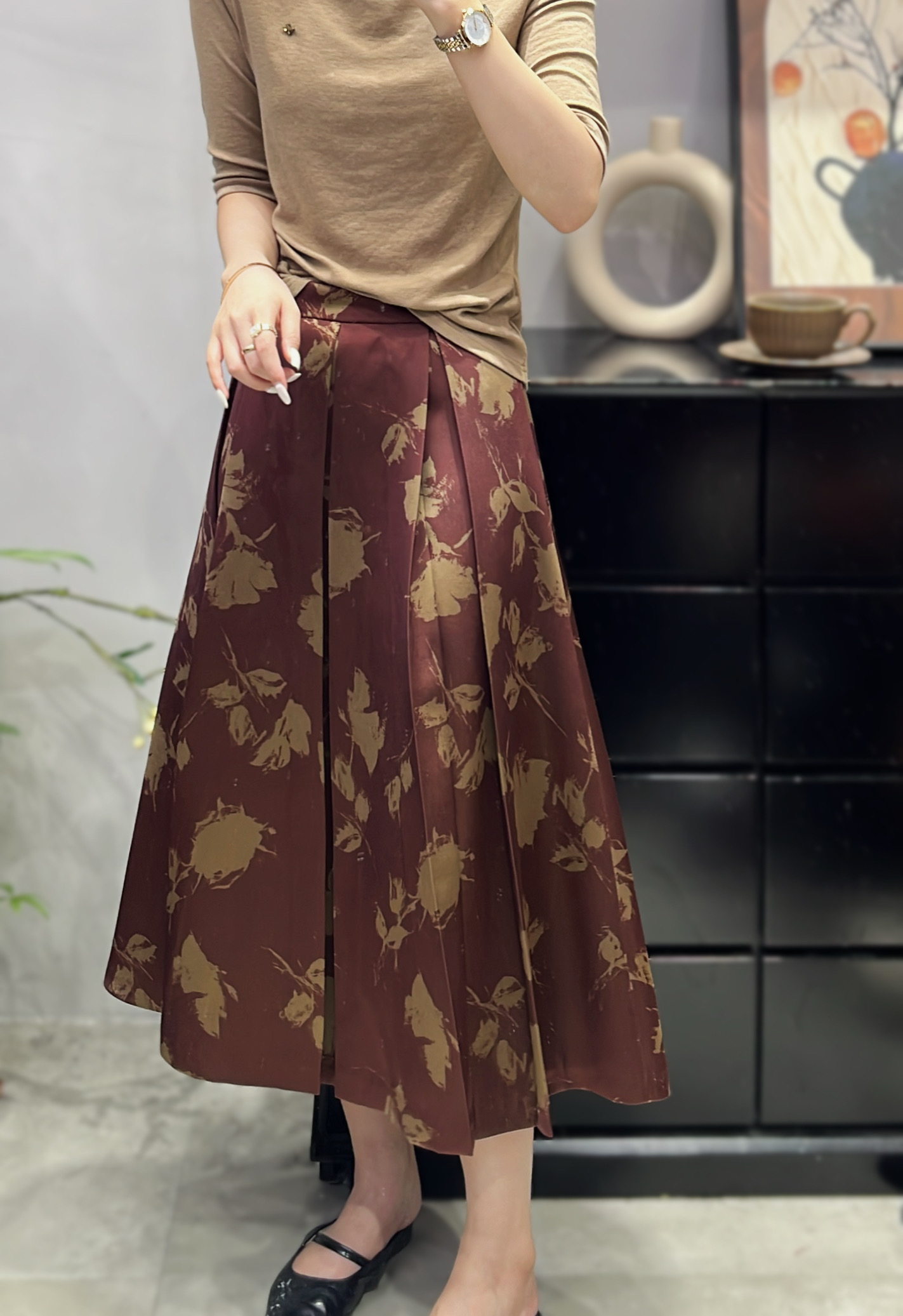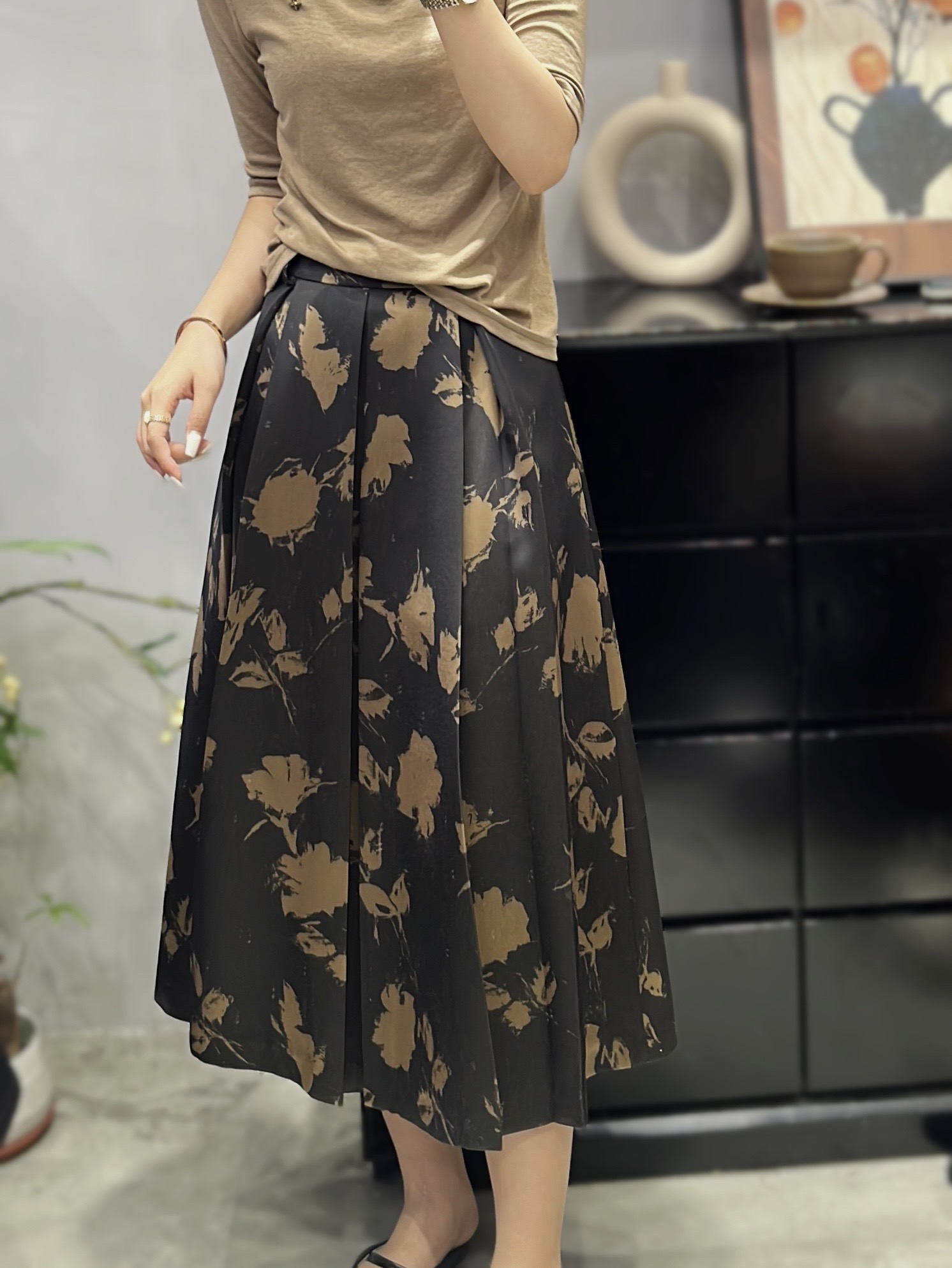 伯妮斯茵 | 复古水墨风 黑金花卉压褶半身裙 高腰中长款 A 字裙 春夏气质显瘦裙 HJ3B59
