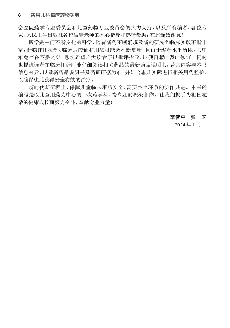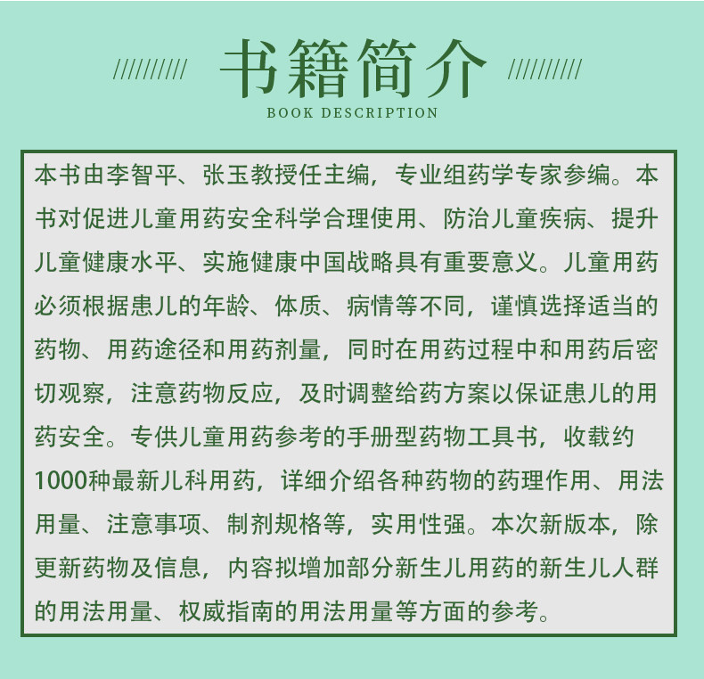 本书由李智平、张玉教授任主编,专业组药学专家参编。本书对促进儿童用药安全科学合理使用、防治儿童疾病、提升儿童健康水平、实施健康中国战略具有重要意义。儿童用药必须根据患儿的年龄、体质、病情等不同,谨慎选择适当的药物、用药途径和用药剂量,同时在用药过程中和用药后密切观察,注意药物反应,及时调整给药方案以保证患儿的用药安全。专供儿童用药参考的手册型药物工具书,收载约1000种最新儿科用药,详细介绍各种药物的药理作用、用法用量、注意事项、制剂规格等,实用性强。本次新版本,除更新药物及信息,内容拟增加部分新生儿用药的新生儿人群的用法用量、权威指南的用法用量等方面的参考。
