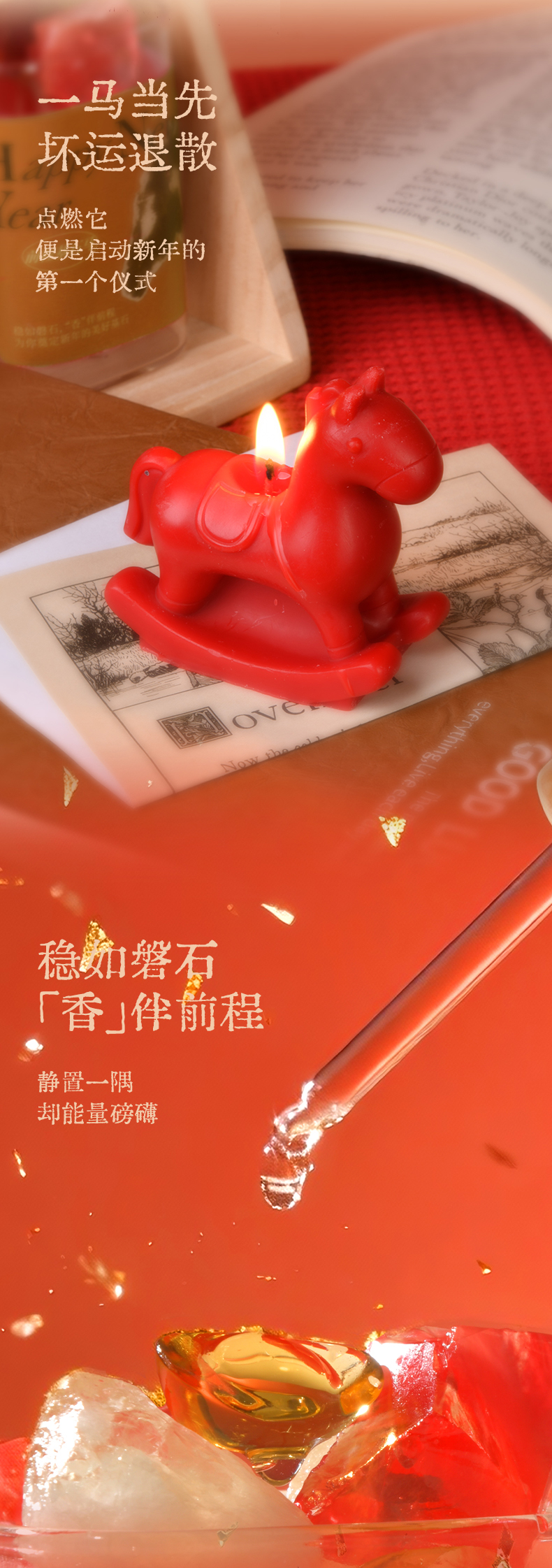 规格:马年造型蜡烛*1 香气手账护手霜12g*2 (玫瑰列车*1 早安松松*1) 扩香晶石杯*1 晶石*15(晶石红熔炼*6 白晶石*3柠檬黄水晶*4 元宝黄水晶*2) 香薰精油 10ml*1 祝福卡片*1