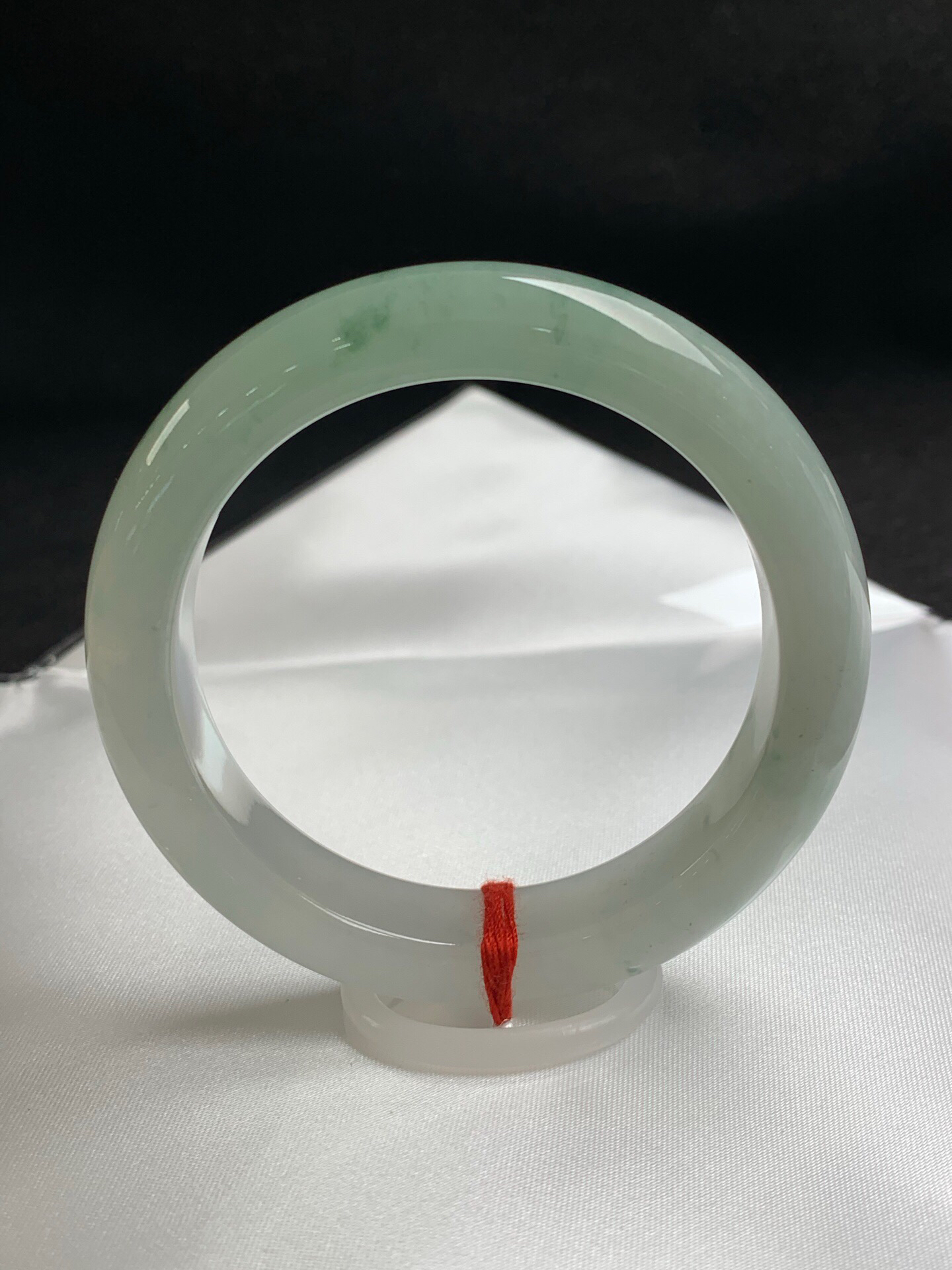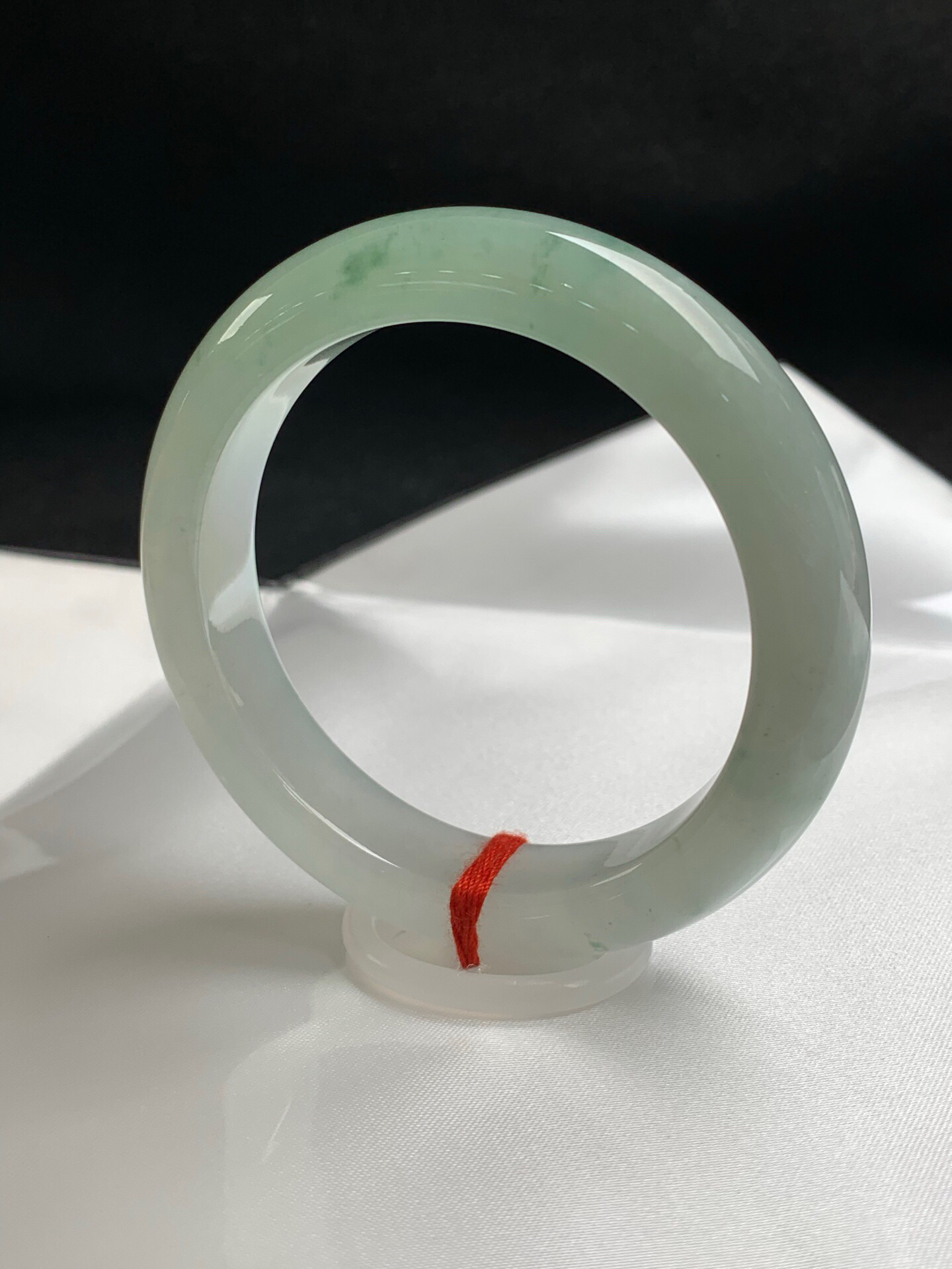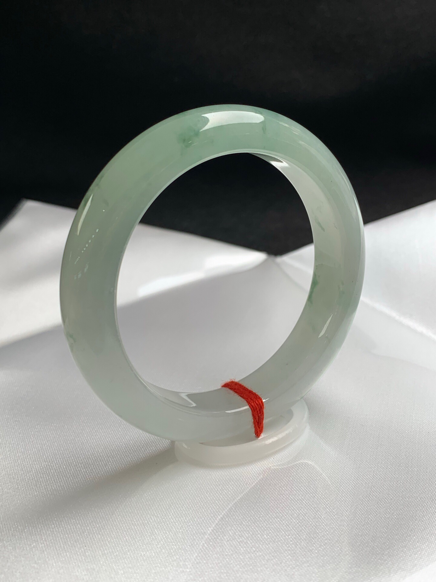 620324,54圈口,糯冰飘花正圈平安镯,半截晴底飘花半截白底,1/3截部位种水冰透有光,条形厚装,水润细腻