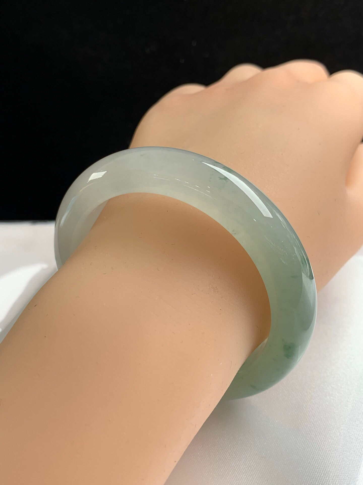 620324,54圈口,糯冰飘花正圈平安镯,半截晴底飘花半截白底,1/3截部位种水冰透有光,条形厚装,水润细腻,完美,尺寸:54-12.5-9,超值价💰24500 #优石客珠宝#香玉荟萃