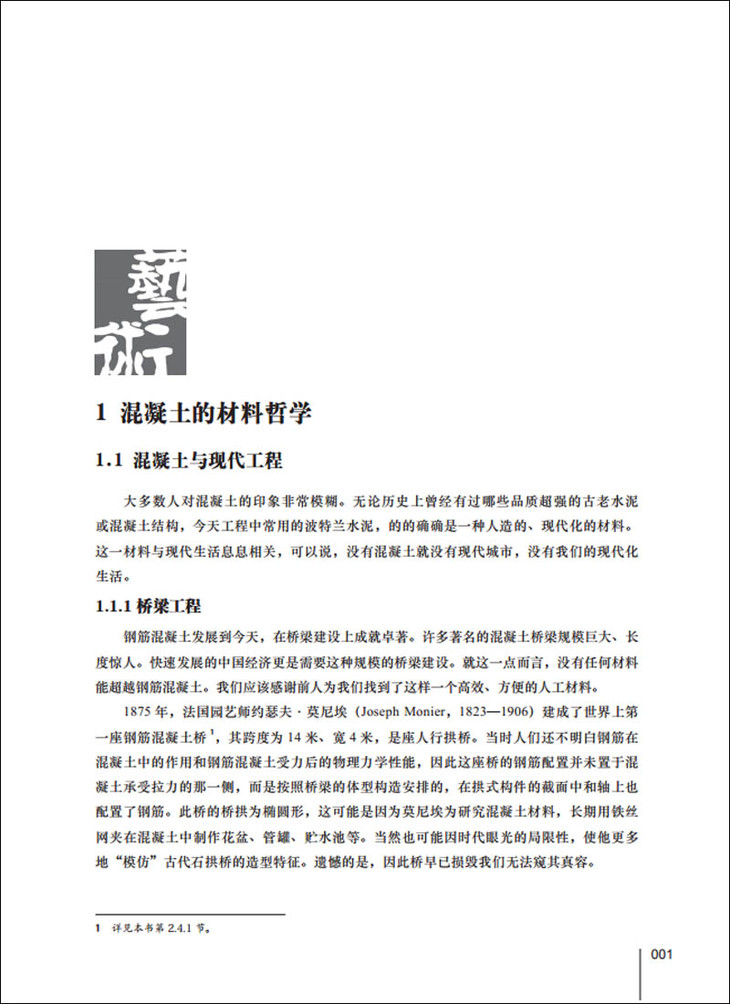 混凝土是建造现代城市和保障现代生活的基础材料,但其在本质上更接近于工艺材料而非工程材料。《混凝土艺术》一书力图展示混凝土的全部特征:让文化界理解混凝土,让设计师应用混凝土,让工匠们迷恋混凝土,让艺术家倚重混凝土。当代中国,融合了西方技术哲学和中国传统工艺思维的新型工业审美模式正在形成。工程师和设计师必须协同作战,勇往直前。工程师赢得尊严,设计师享有自由。
