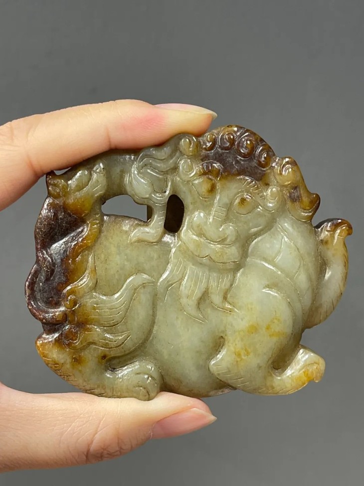 此和田褐沁白玉瑞狮腰带扣环尺寸大,整料镂空透雕琢磨而成,瑞狮体态优美、细节栩栩如生,灵动飘逸、粗细有致,握于掌中温润细腻,爱不释手。