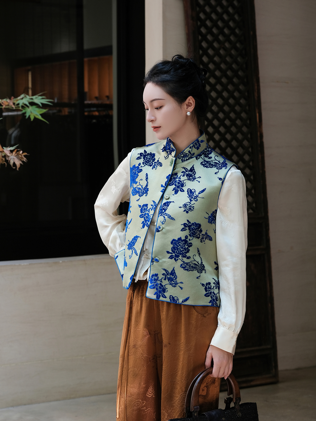 盛唐牡丹 |花香引蝶真丝宋锦新中式马甲正反两穿(里料随机花纹)