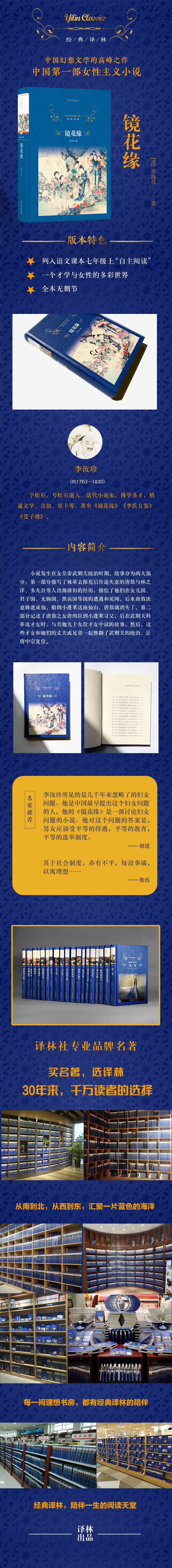 《镜花缘》常被称作“中国版的《格列佛游记》”。与英国讽刺名家乔纳森·斯威夫特的这部讽刺杰作相似,《镜花缘》展示了瑰奇的想象力、对当时社会现实的批判、万象包罗的才情、辛辣幽默的上佳笔法。晚清名家李汝珍在书中备述了100位才女的故事、品德和才思,笔法纵横,塑造了一个多彩的才学与女性世界。
