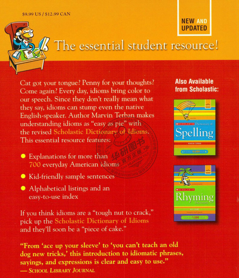 Cat got your tongue? Penny for your thoughts? Come again? Every day, idioms bring color to our speech. Since they don’t really mean what they say, idioms can stump even the native English-speaker. Marvin Terban makes understanding idioms “as easy as pie” with the revised SCHOLASTIC DICTIONARY OF IDIOMS. This essential resource features: