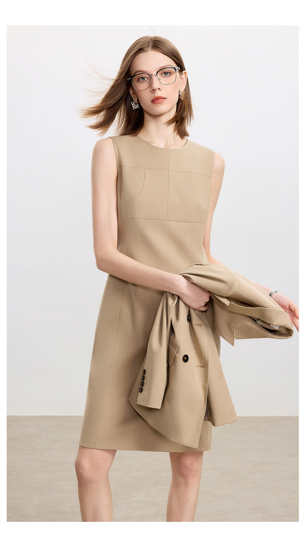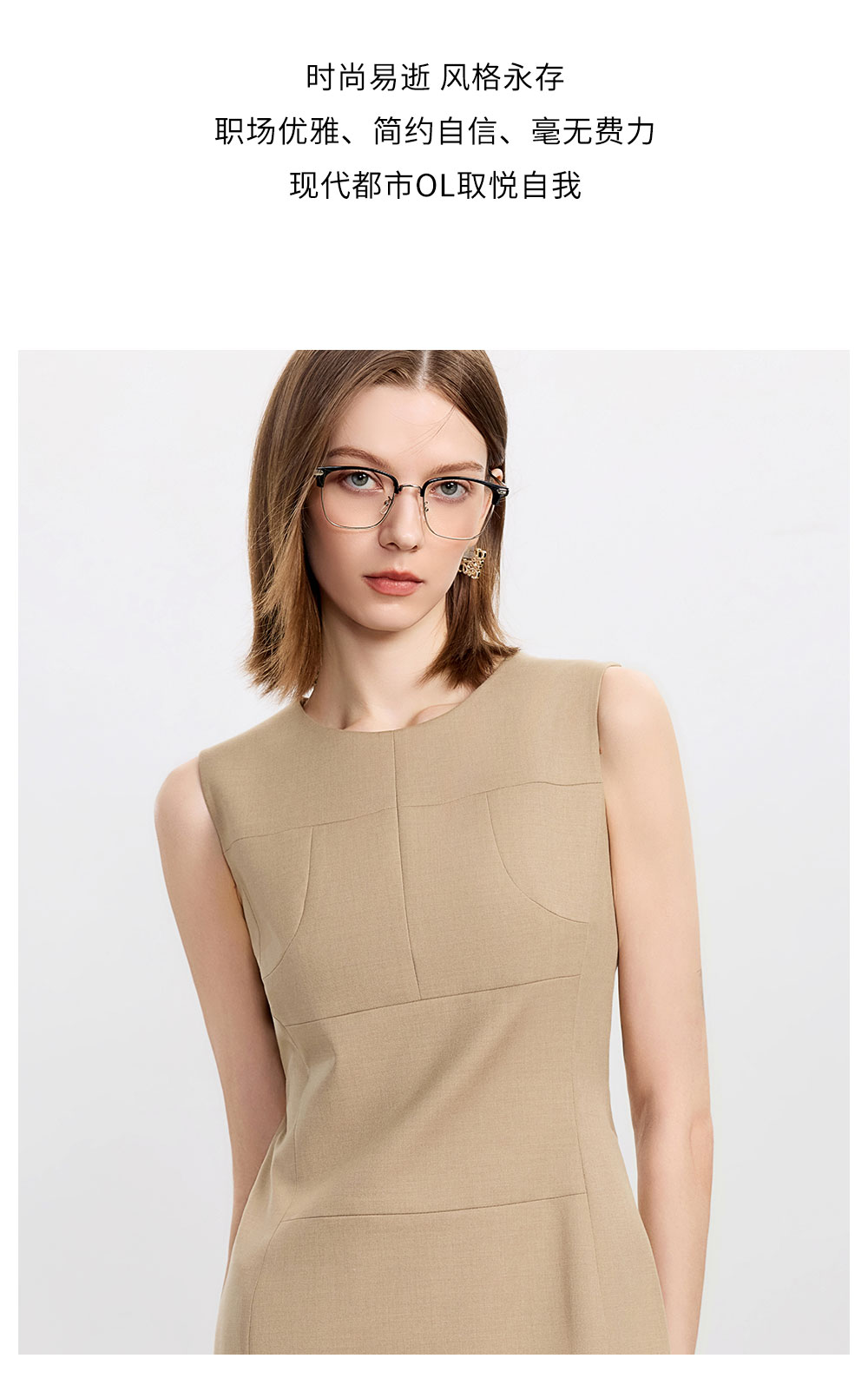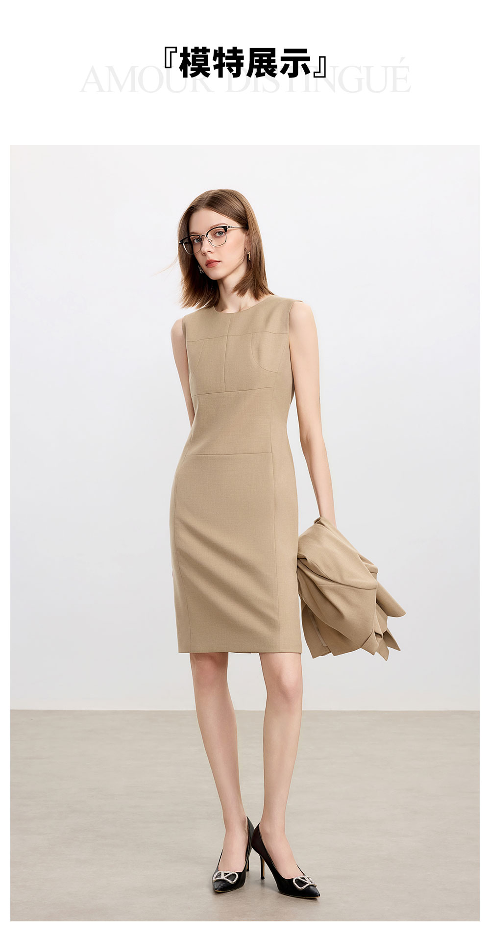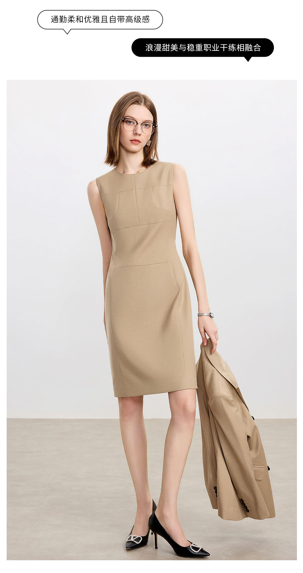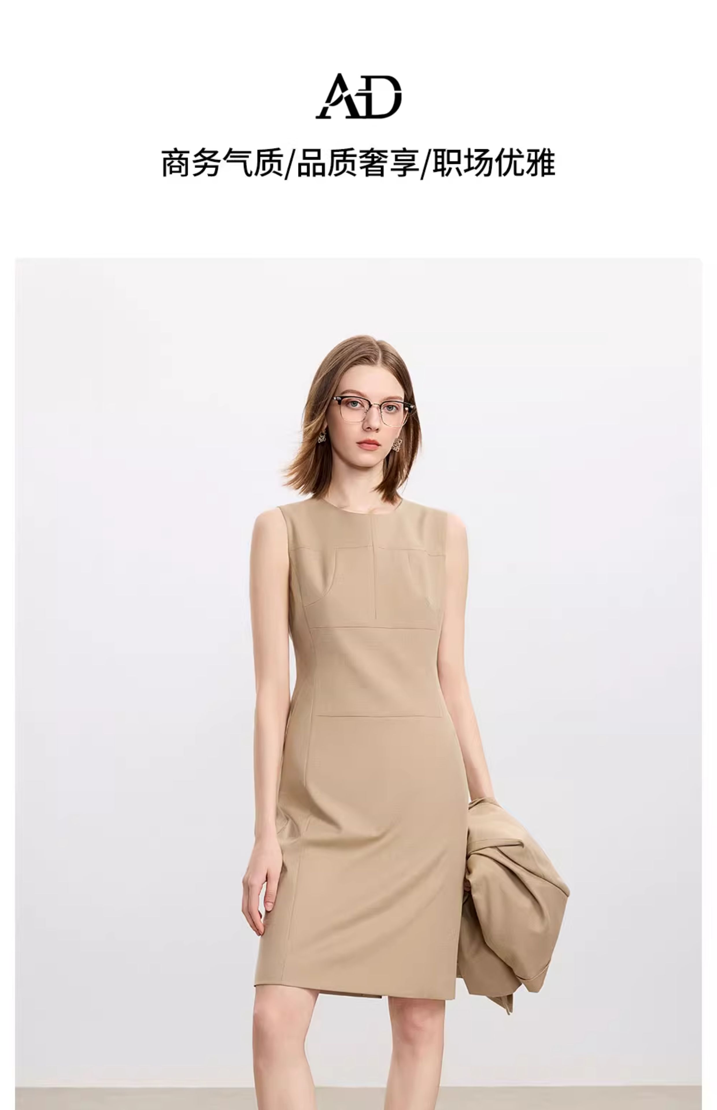 AD卡其色修身连衣裙女高端羊毛西装裙中长款秋冬内搭职业装