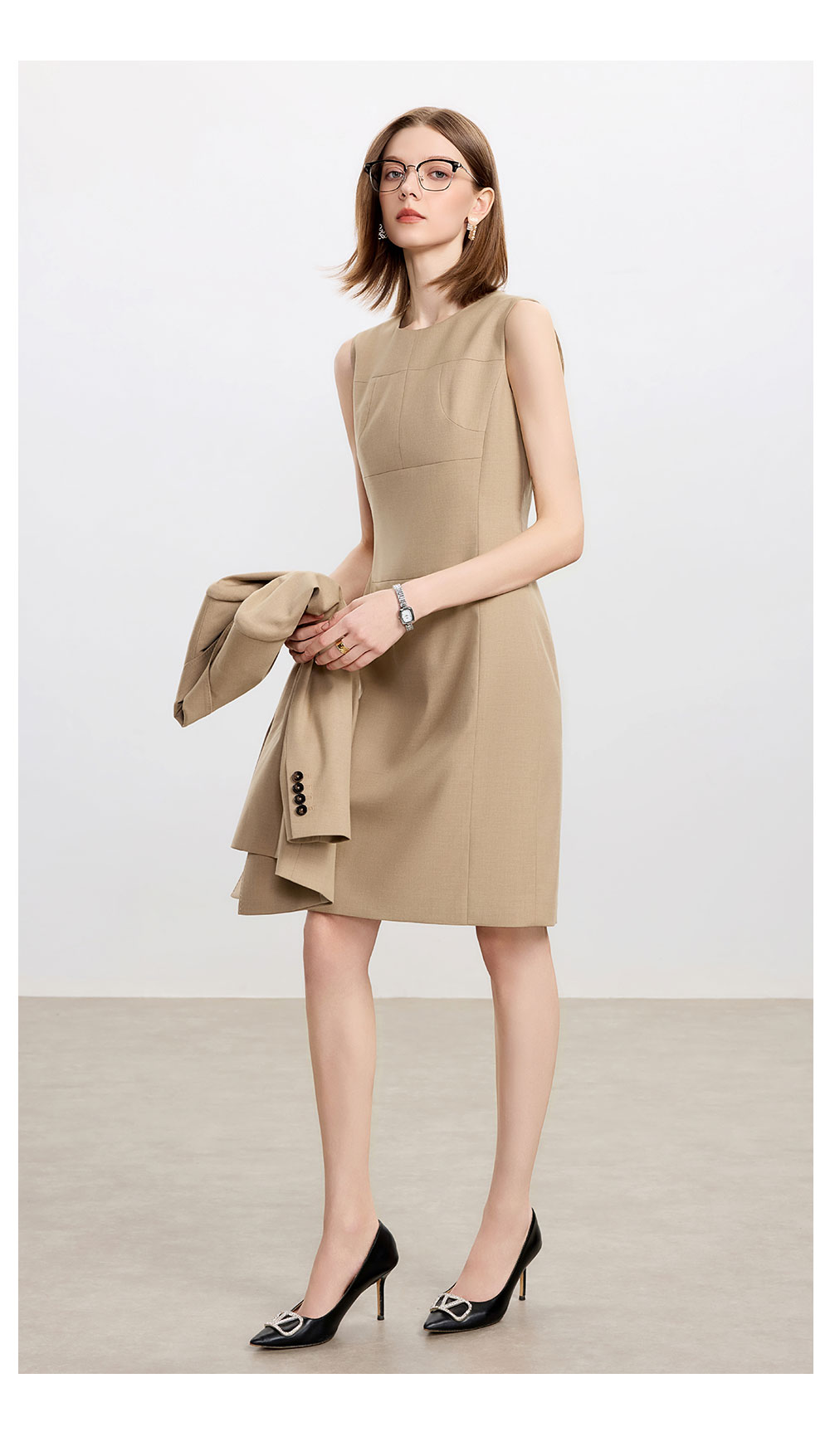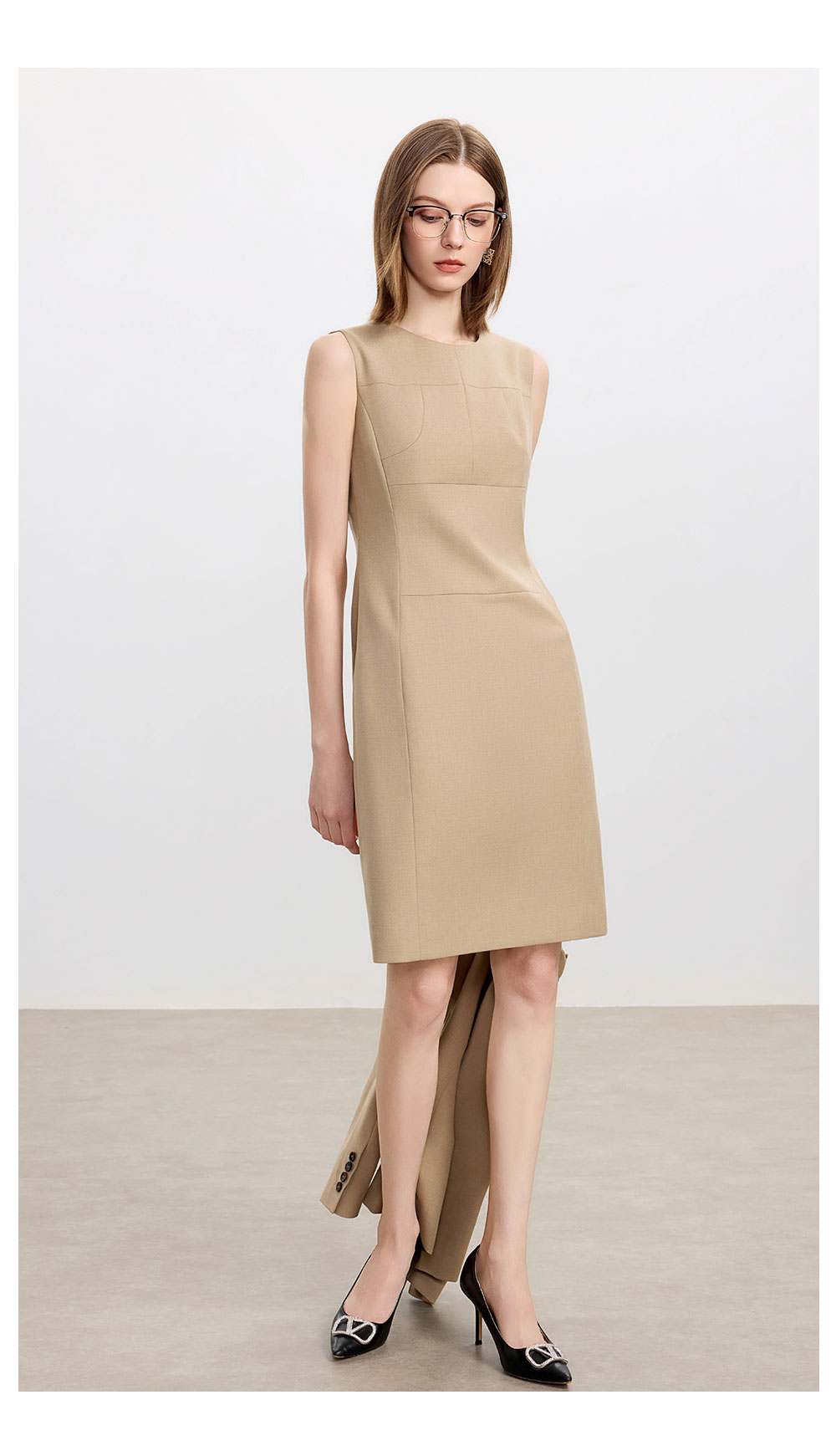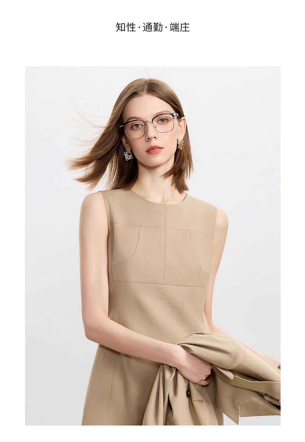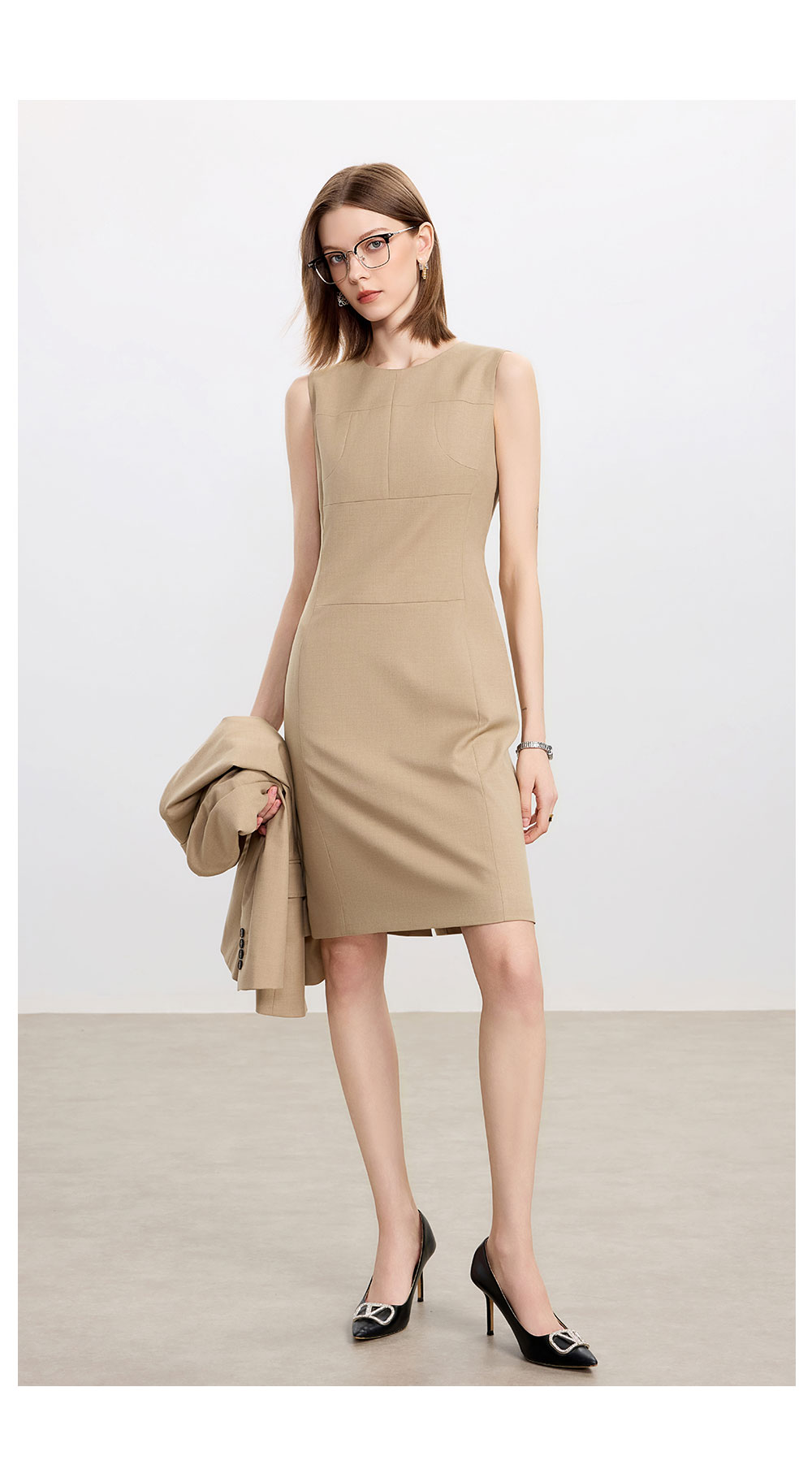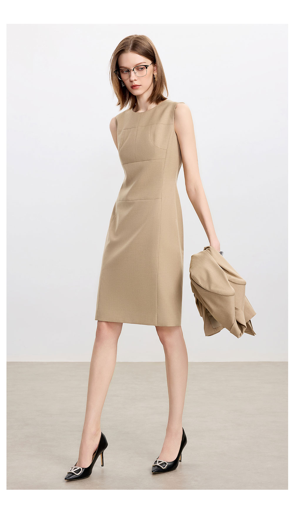 AD卡其色修身连衣裙女高端羊毛西装裙中长款秋冬内搭职业装