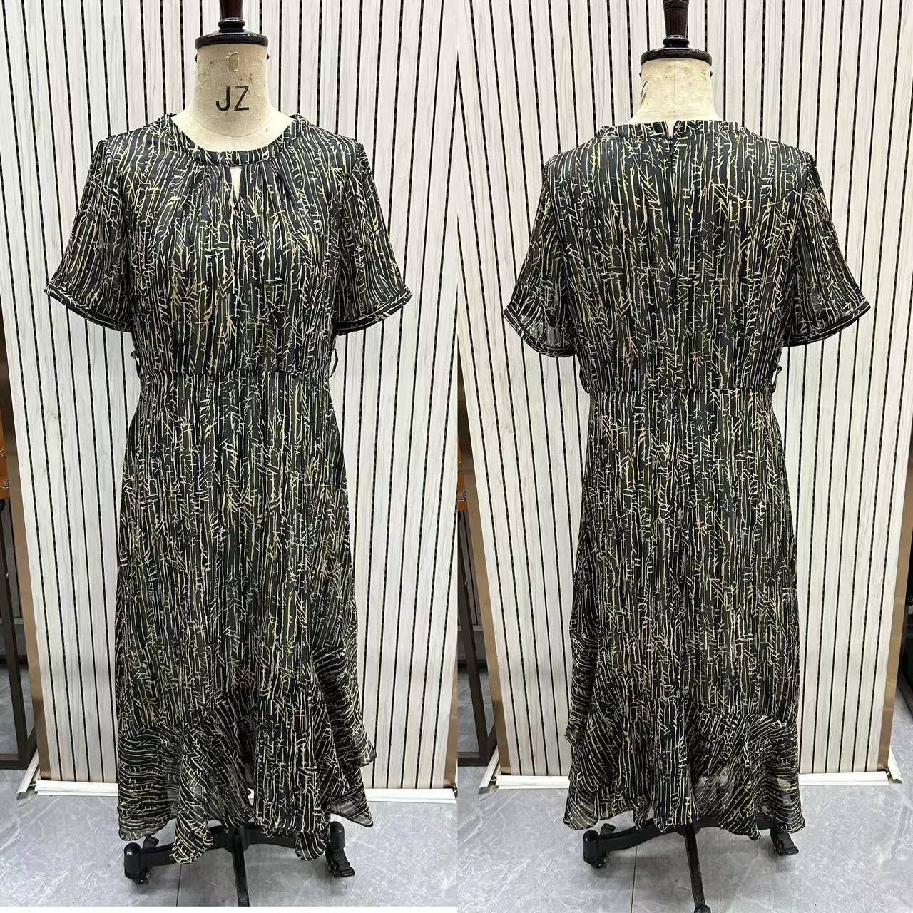 HJ1S75_木石黄色_连衣裙_夏季_圆领小镂空荷叶边短袖线条印花收腰显瘦百搭通勤中长裙_高级女装_BERNIEELEN 伯妮斯茵