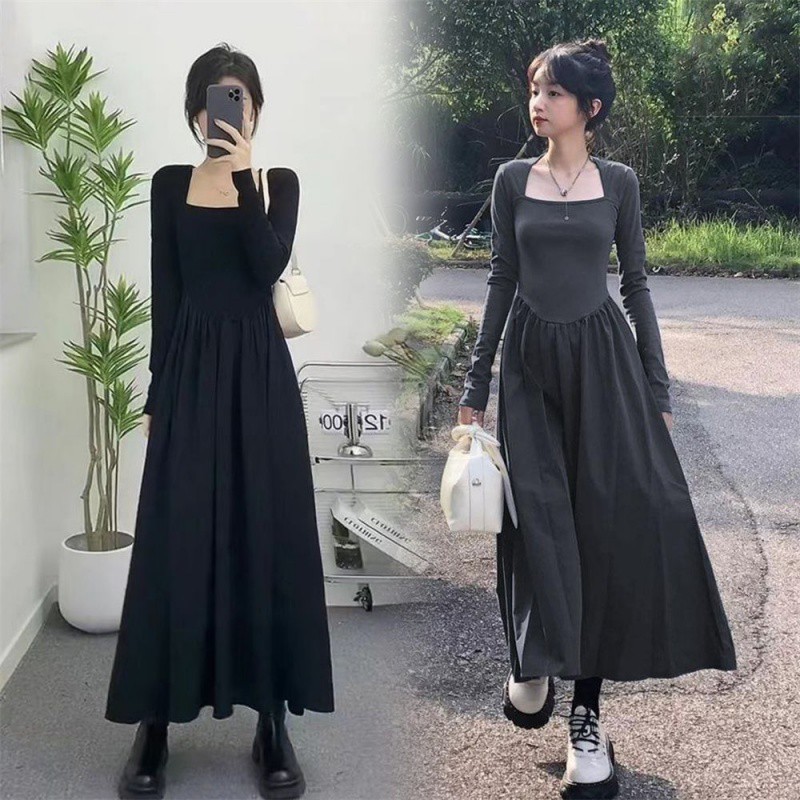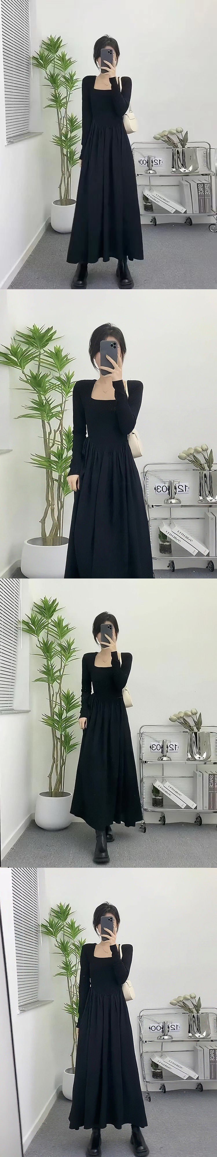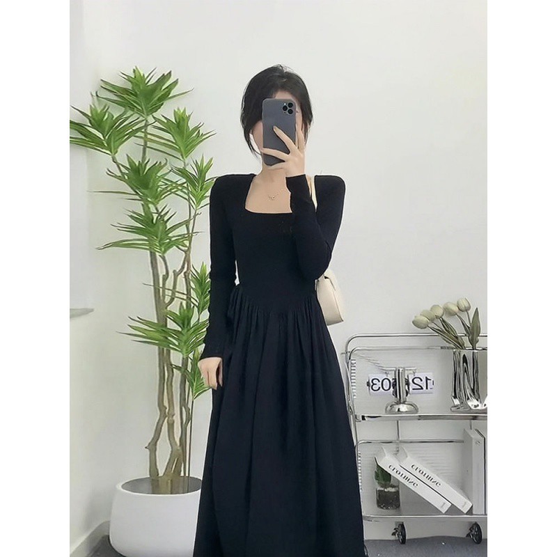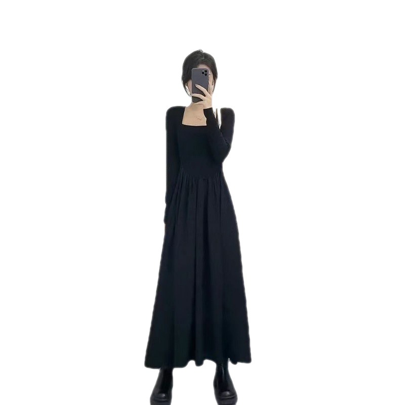 赫本风方领长袖连衣裙春夏2023新款高腰显瘦黑色打底长裙女