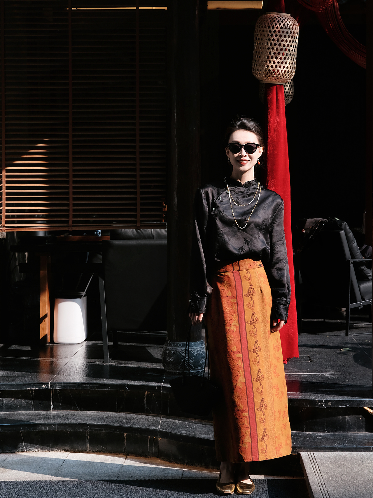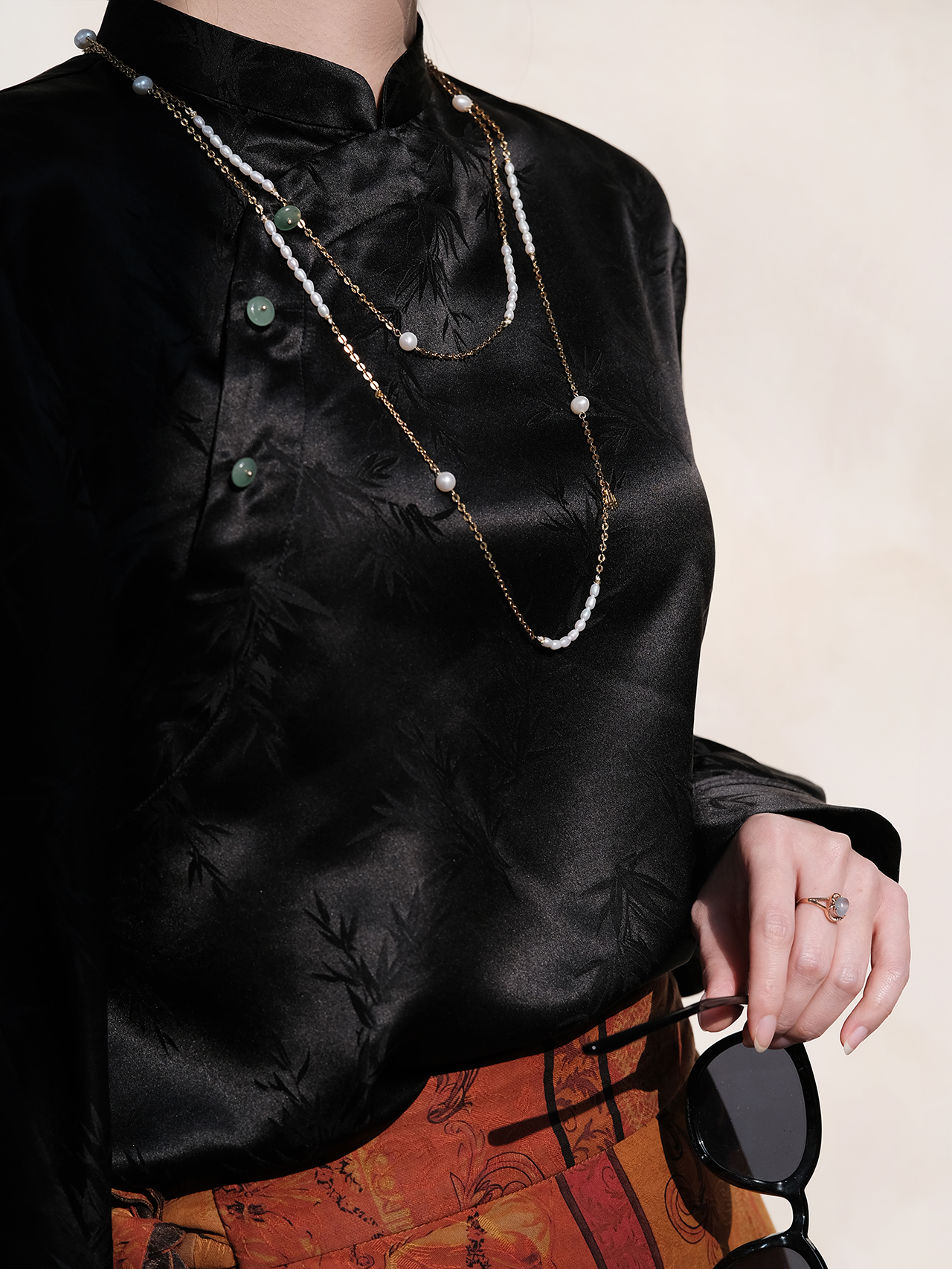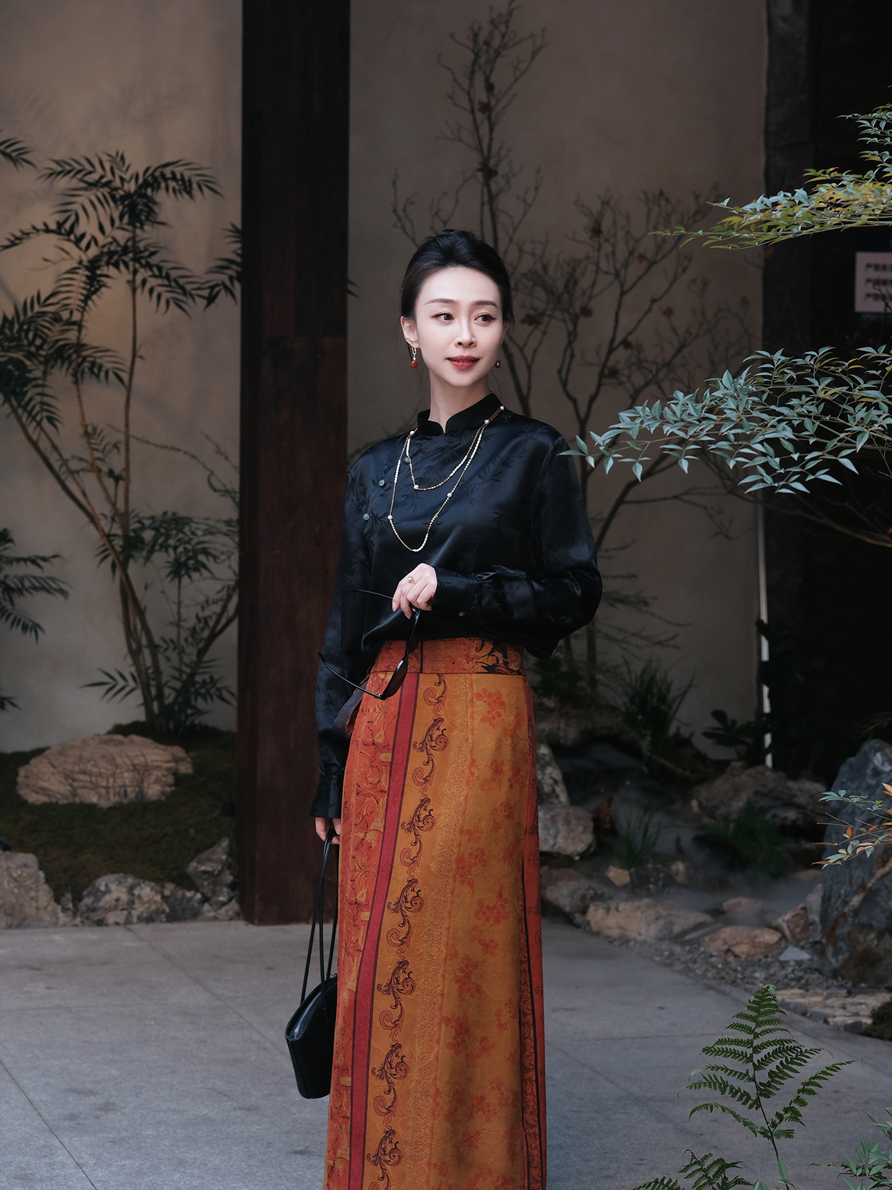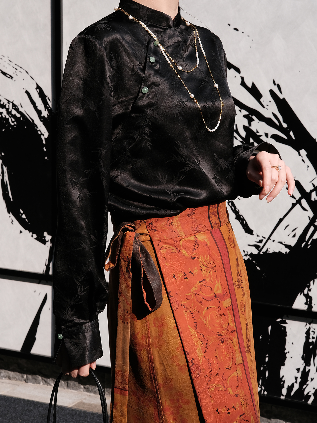 盛唐牡丹 |黑色真丝竹子纹偏襟上衣