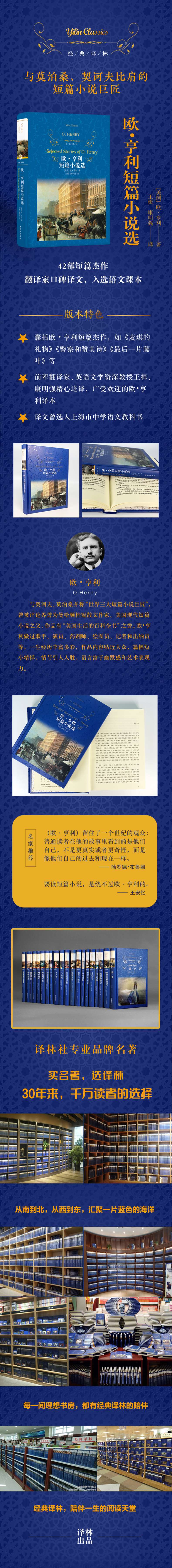 欧?亨利,美国短篇小说巨匠,被誉为美国的莫泊桑。一生创作短篇小说近三百篇。他的小说情节生动,结构紧凑,故事奇特,可读性强,而且经常有一个别出心裁、令人意想不到的结尾。这种独特的创作风格,对美国现代短篇小说影响很大,在文学史上占有不容忽视的地位。1918年美国设立“欧?亨利纪念奖”以奖励每年度*短篇小说。