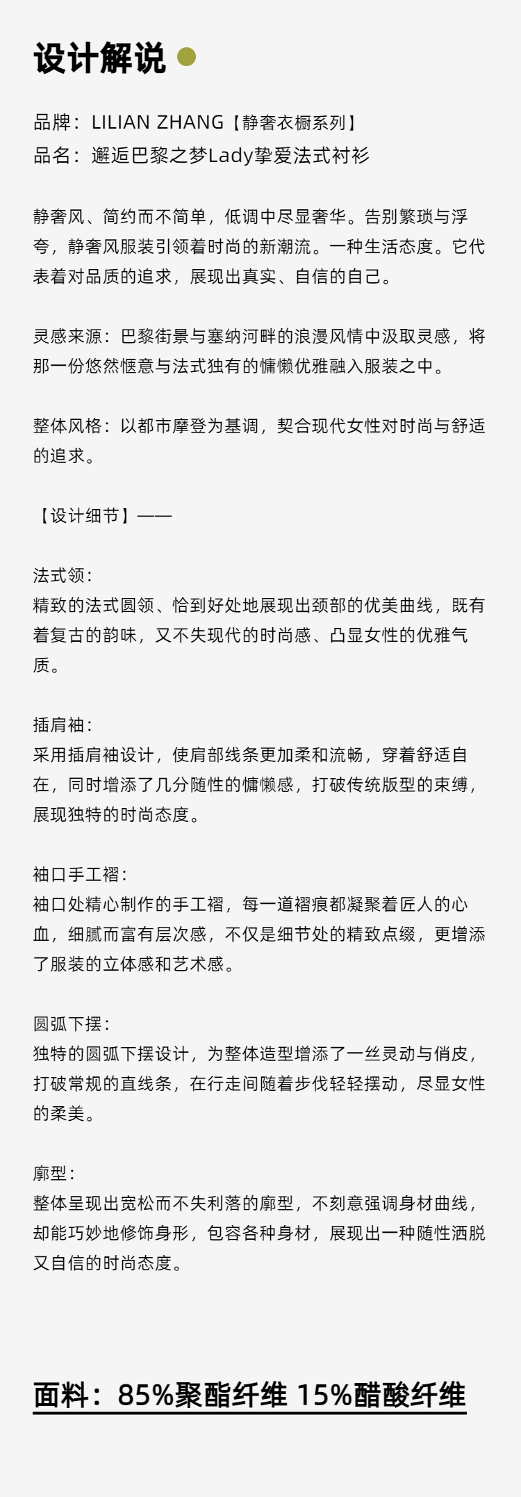 - LILIAN ZHANG ,创立于2008年,为 ARMANI 等国际品牌设计创作时装。 LILIAN ZHANG 坚持原创设计、坚持立体剪裁、坚持颠覆奢侈品价格、坚持简约经典 ,深受时尚女性喜爱。