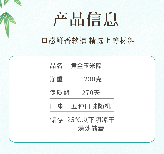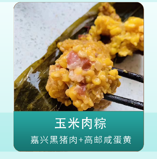 玉米蛋黄粽:玉米、饮用水、猪肉、咸鸭蛋黄、酱油、白砂糖、食用盐、白酒、味精