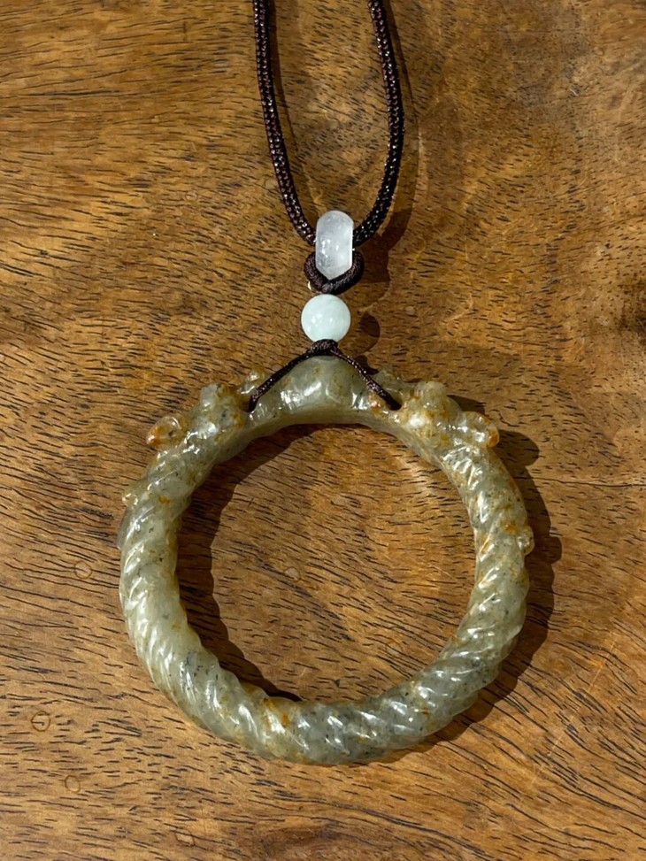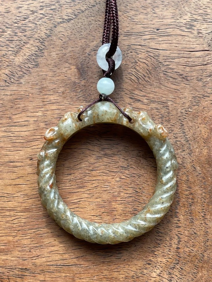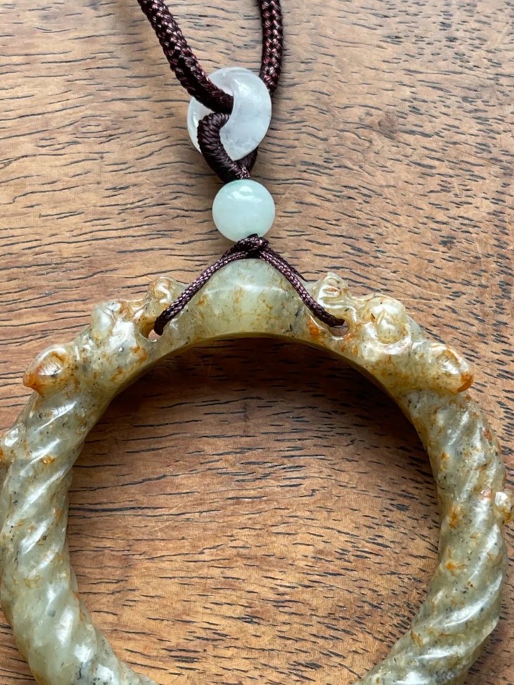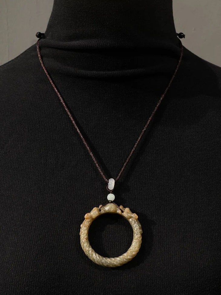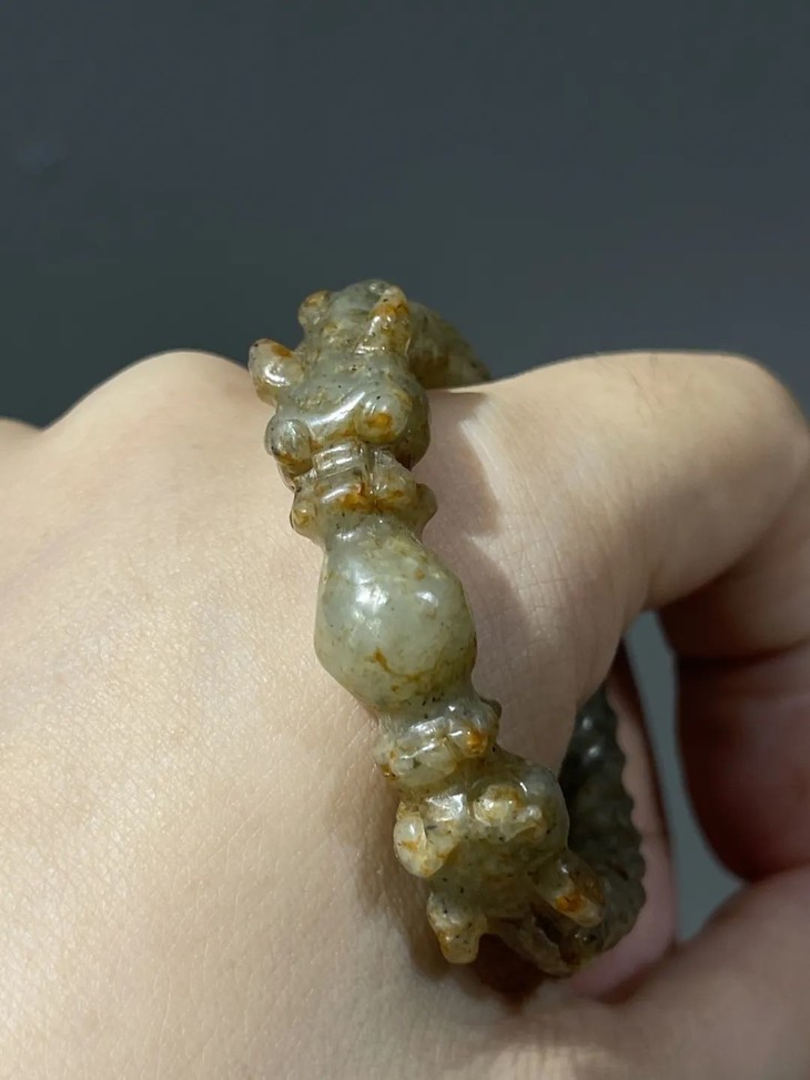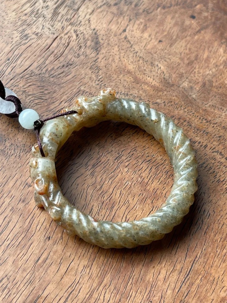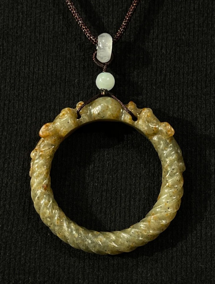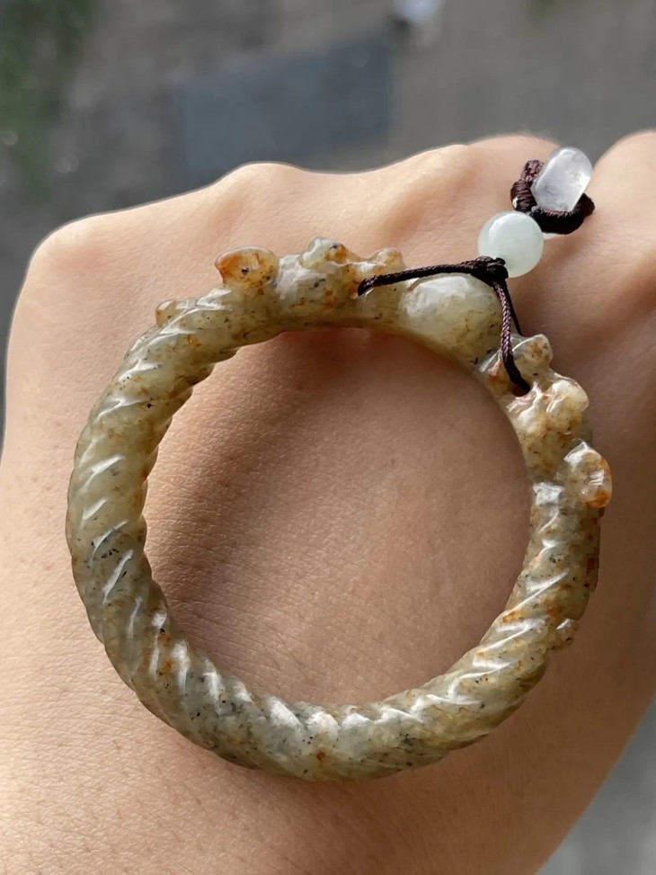 此和田灰白玉雕双螭龙绞绳纹环,如图所示,表面有些细纹磕碰伤与磨损痕,除此之外,保存完好无损,表面包浆皮壳渾厚温润。已搭配绳结,入手即可佩戴。