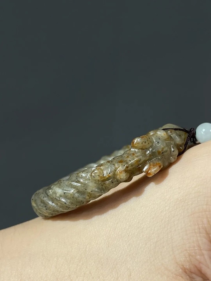 此和田灰白玉雕双螭龙绞绳纹环形式典雅、双螭龙咬珠、螺旋沟槽雕琢技艺精湛,古韵十足,表面积累之包浆皮壳渾厚温润,简约大方,特显高雅气质与独具一格之品味。
