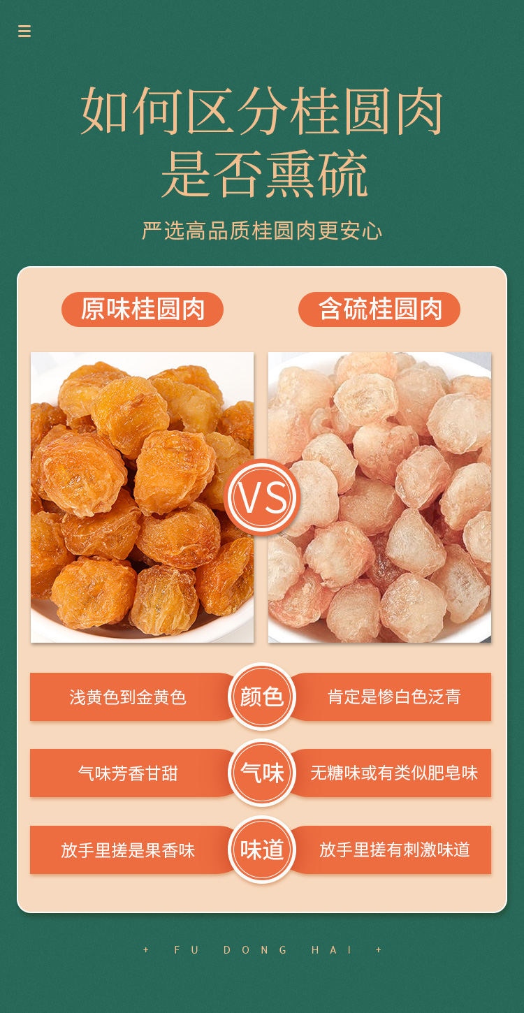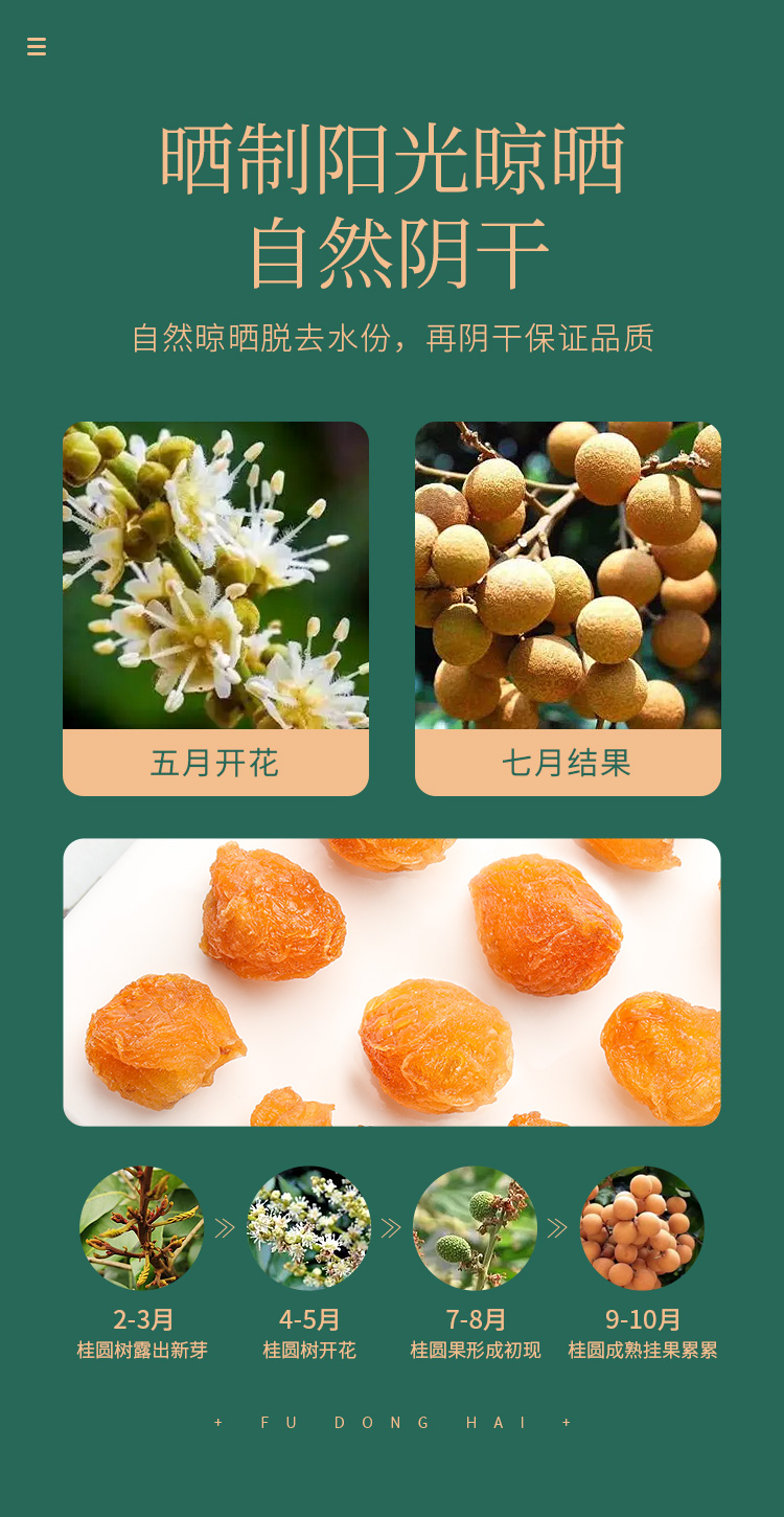 福东海用的龙眼来自中国桂圆之乡——广东高州,深入种植产地,精选远离工业污染的龙眼树。每年6—8月,待龙眼的风味和甜度恰到好处时,果农们就开始采摘收果,挑选、去壳、挖出果肉、自然晾干、烘烤。福东海采用传统柴火烘烤的方式,过程中严格温度控制在50—60摄氏度,连续烘烤12—15个小时,使龙眼肉的营养价值得到完整保留,果实呈棕褐色,肉质厚实,浑圆饱满,紧致有弹性,干爽不沾手。6斤新鲜龙眼烘干后只得1斤龙眼肉,干度也达到90%—95%,口感更好,保存更久。
