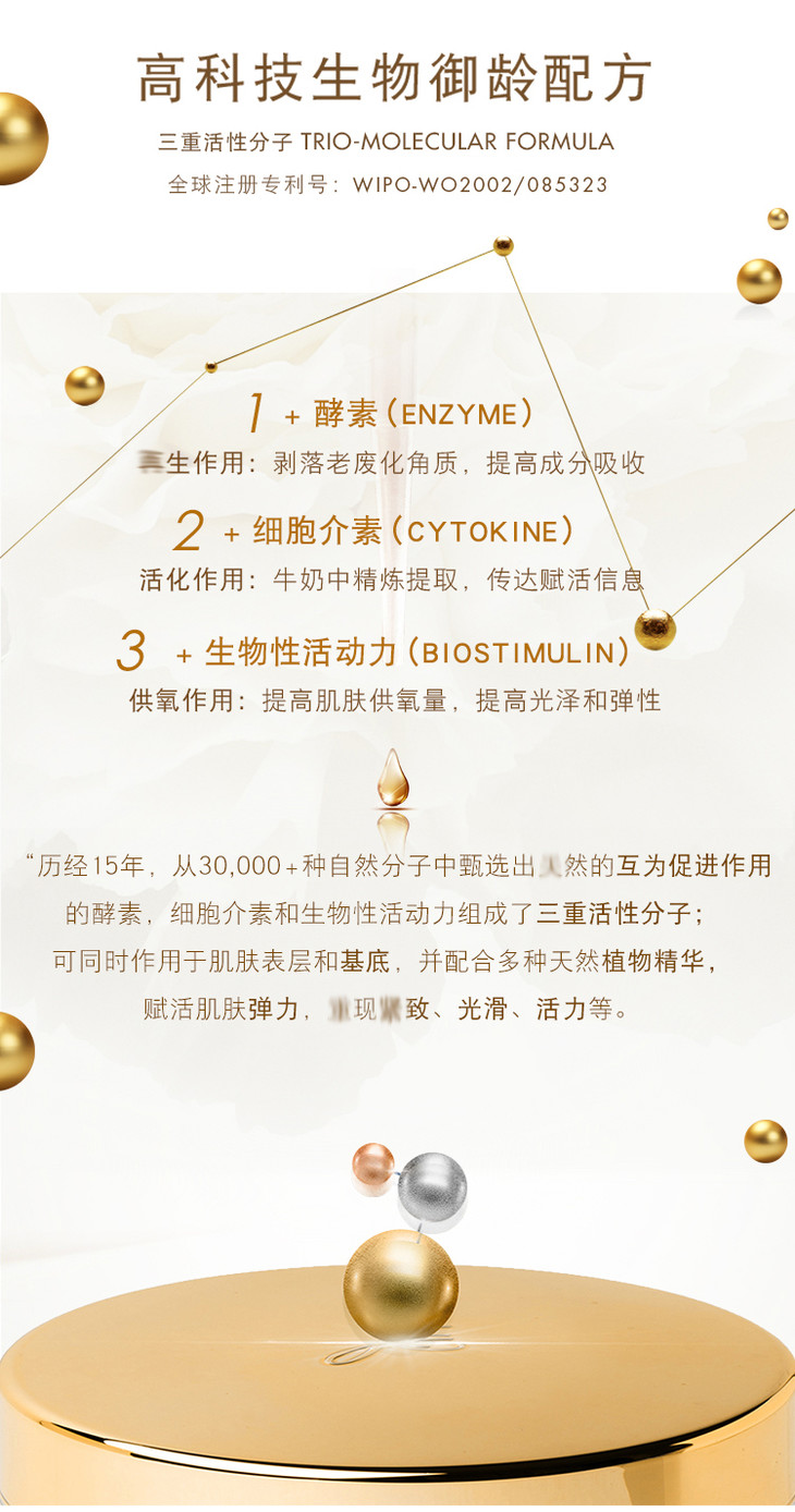 它的核心配方是以酵素、细胞介素和生物性活动力组成的三重活性分子,是一种高科技的御龄配方,能够同时作用于肌肤表层和基底,并配合和多种天然植物精华,让肌肤变得弹力、紧致、光滑。