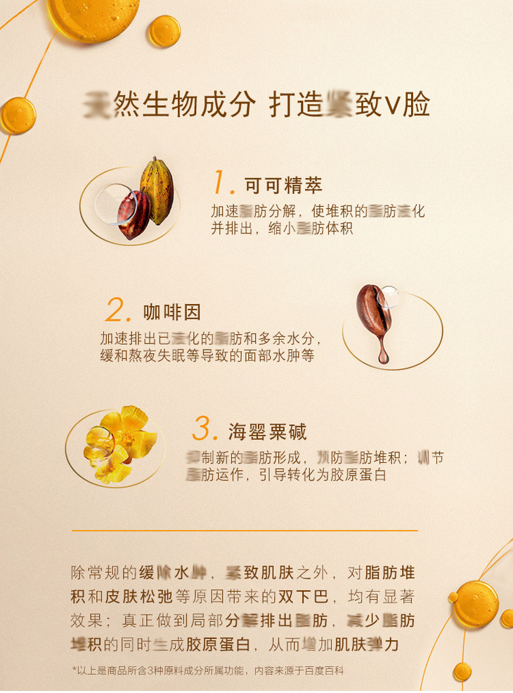 产品功效:针对局部分解排除月旨肪,减少月旨肪堆积,增加肌肤弹力,提拉紧致,塑造V脸、天鹅颈