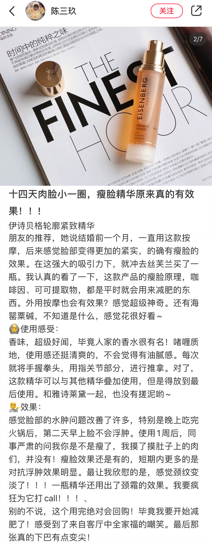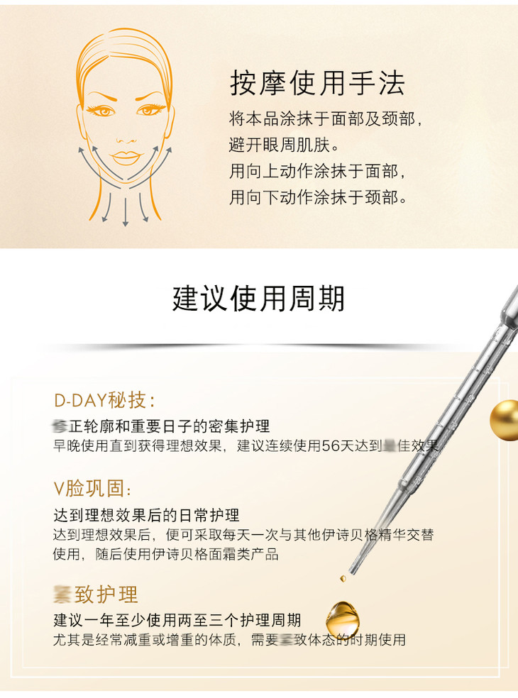 精华是淡黄色的,质地呈啫喱状,刚上脸时稍微有点粘,但是等全部吸收之后就很清爽了。因为他们家的香水也很有名,所以这款的香味有点好闻。记得也要用在颈部,对整体提升比较有帮助。脸上时向上按摩,在颈部时向下按摩,早晚都是可以用的。质地和使用感我觉得还可以,实验室效果测试是在连续使用56天后较为明显。