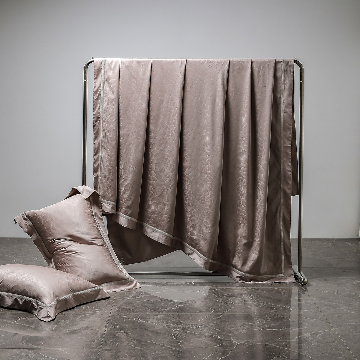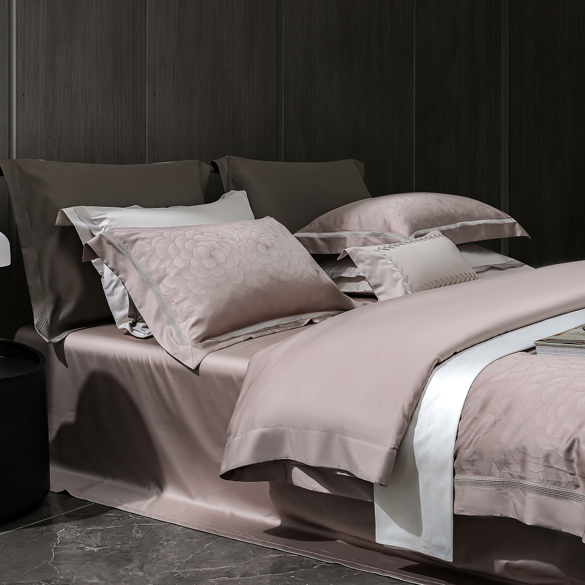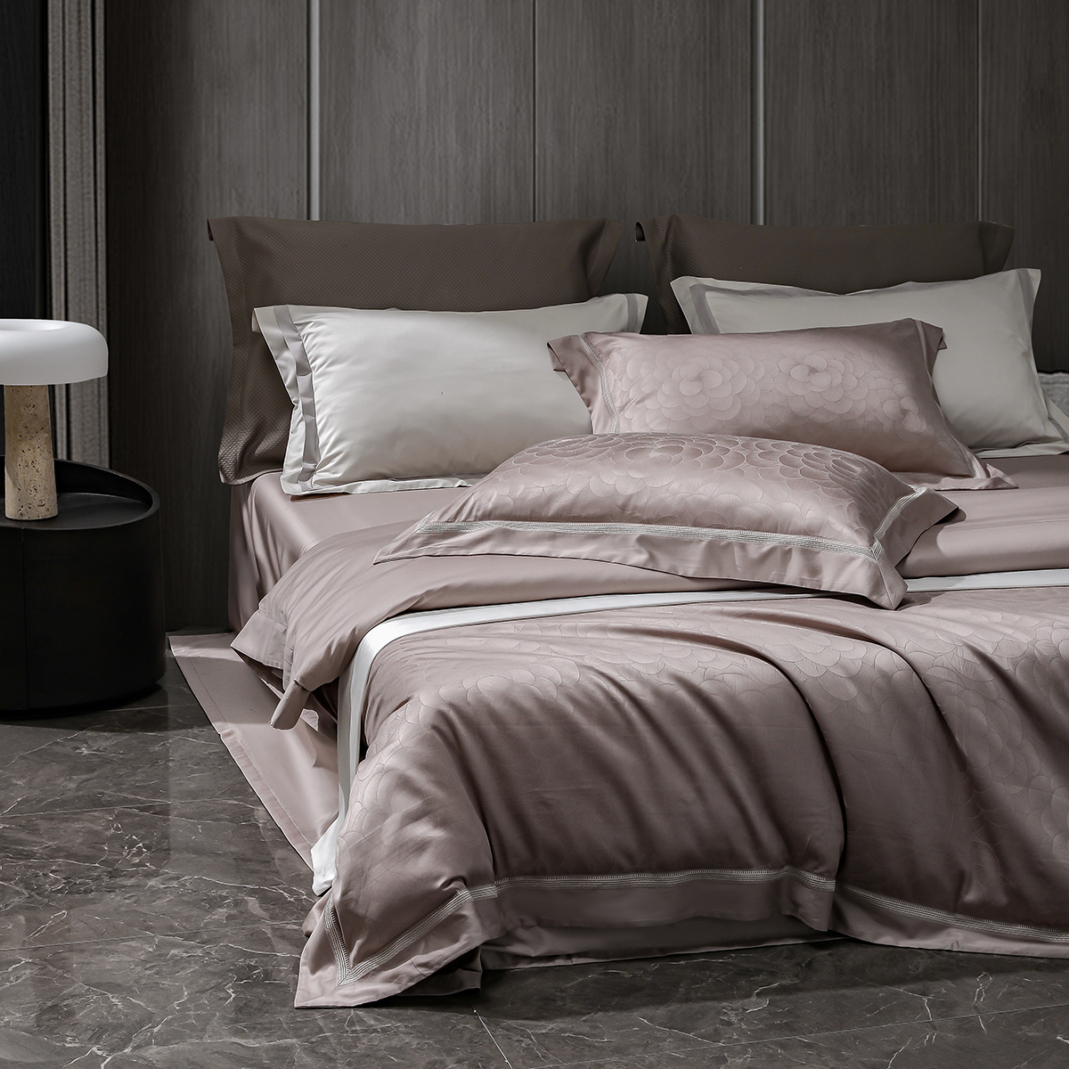 甄选新疆阿克苏长绒棉,高支高密织造,面料近看如珍珠般光泽耀人,肌肤轻触软糯丝滑,暗纹提花微微凹凸肌理感,如浮雕一般,高级立体感。