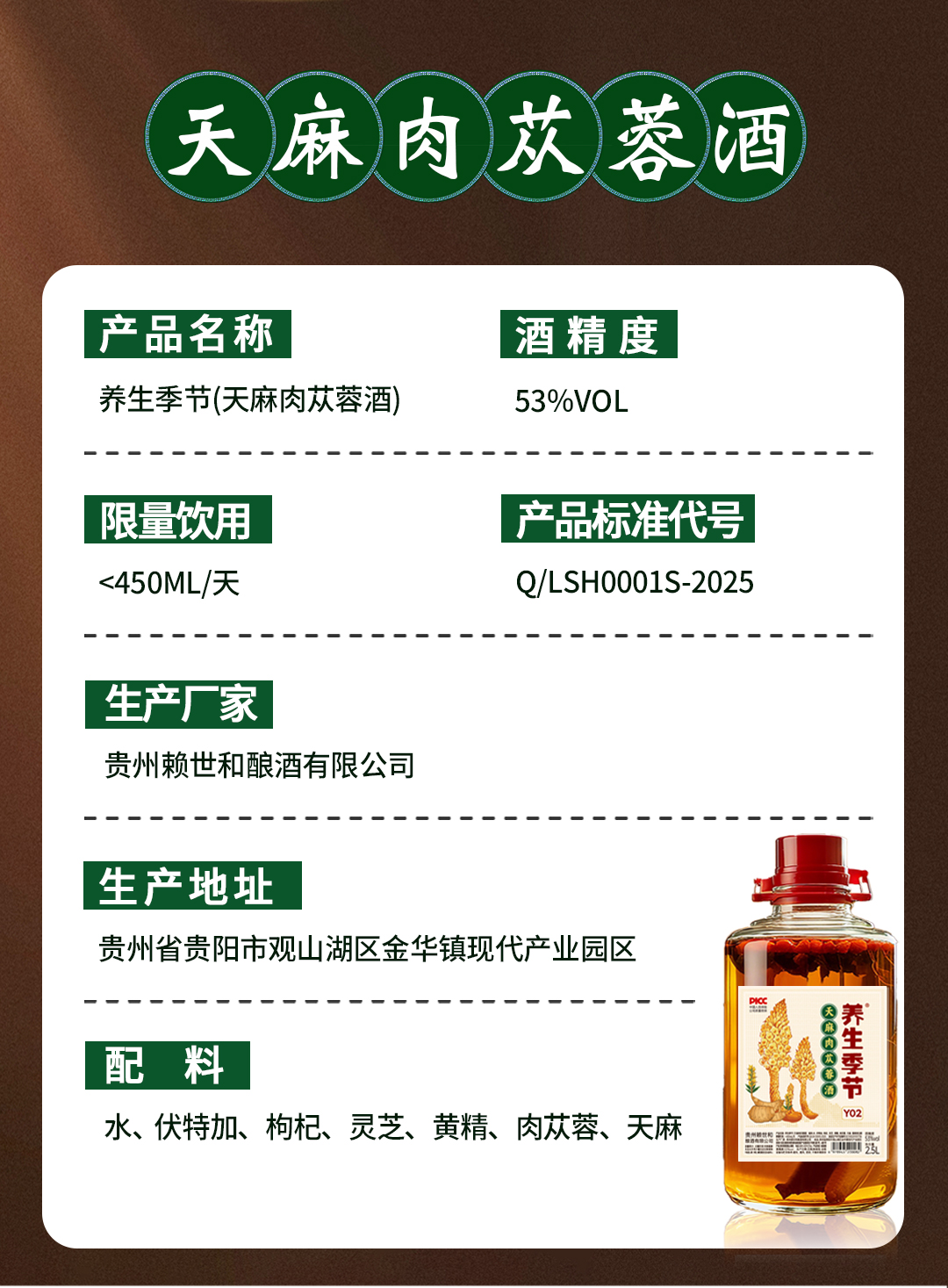 养生季节(天麻肉苁蓉酒)2.5L玻璃坛装,精美礼盒,精选灵芝 枸杞 黄精 肉苁蓉 天麻 5味国企原料,科学配比,充分侵泡