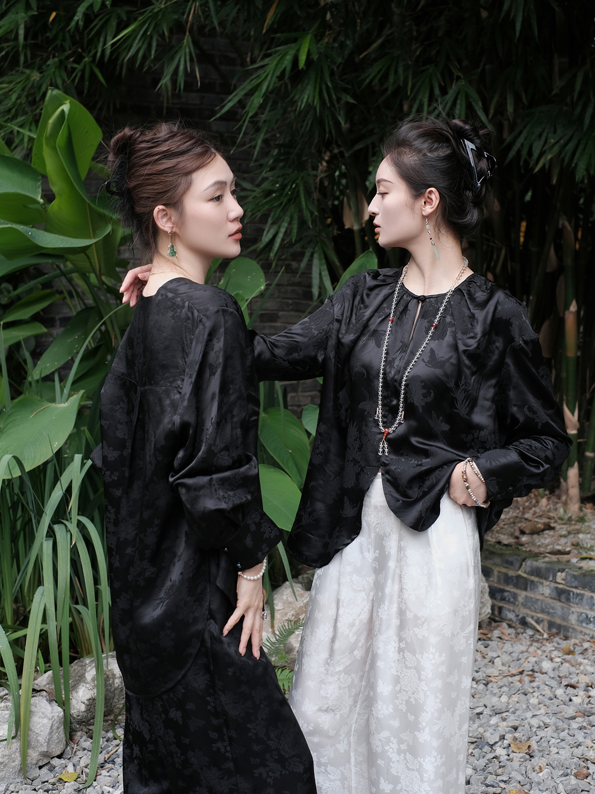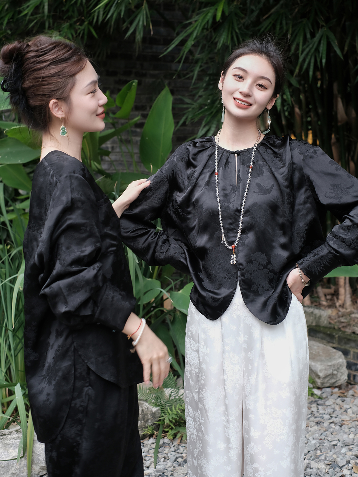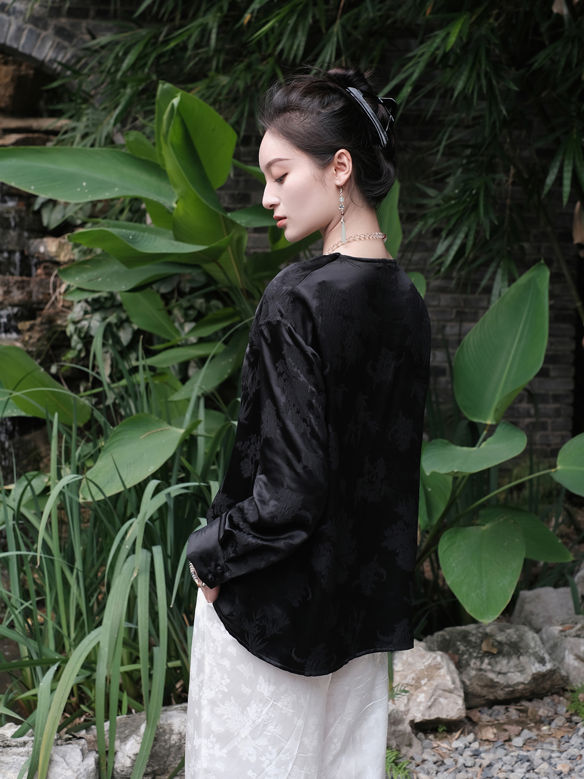 盛唐牡丹 |真丝压花圆领女上衣-黑色
