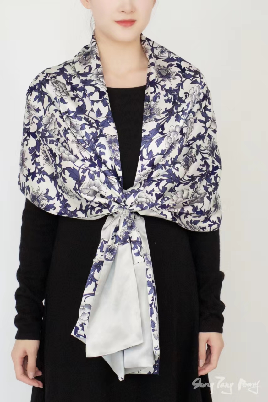 盛唐牡丹 |真丝盘扣披肩-青花瓷(福利品)