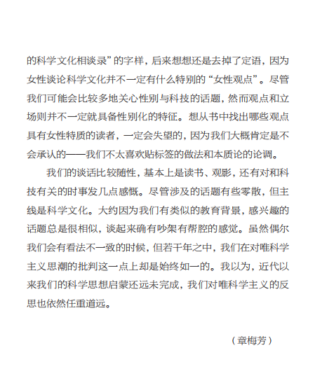 本书所涉文章大多是章梅芳、吴慧在《科学时报》上合写过的“南来北往”的专栏,主要涉及读书、观影等的思考,还有对和科技有关的时事发几点感慨。后增加《金凤花下》等篇。对谈分为“女性话题”“书桌边上”“科普科幻”“时闻我见”四个部分,尽管涉及的话题有些零散,例如性别科学史、一般性的科学文化、科学技术的伦理争议等,但主线是科学文化。